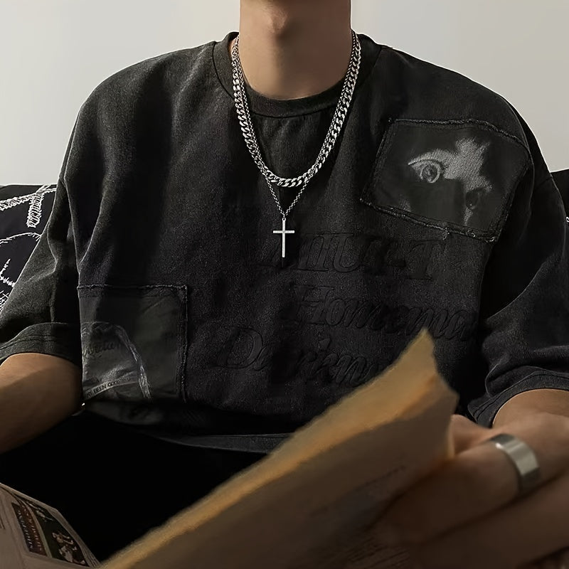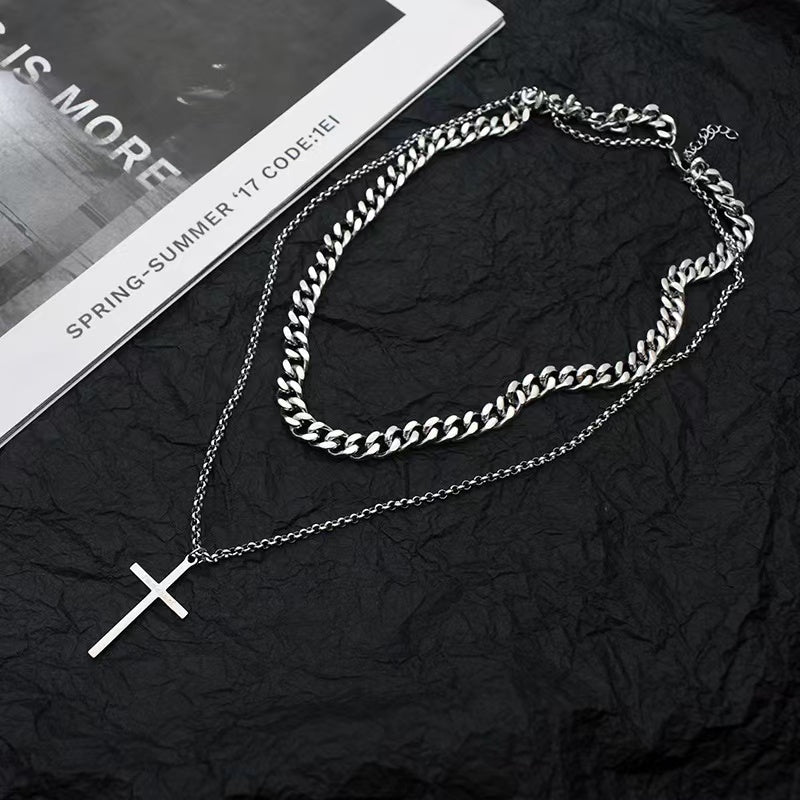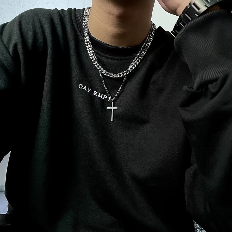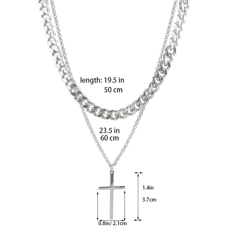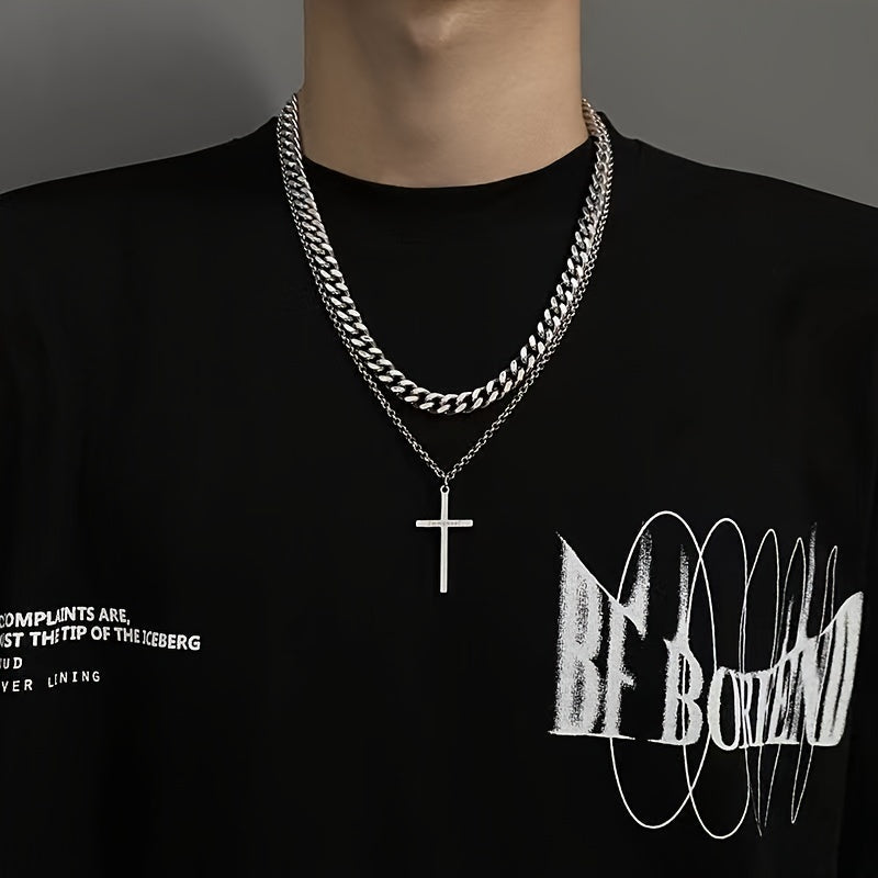 This men's necklace features a stylish cross pendant hanging from a durable stainless steel Cuban link chain. The silver twisted rope chain adds a unique touch to the design.