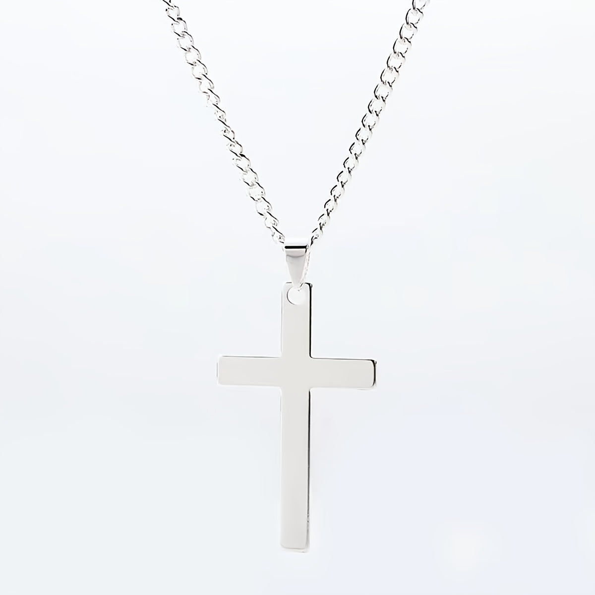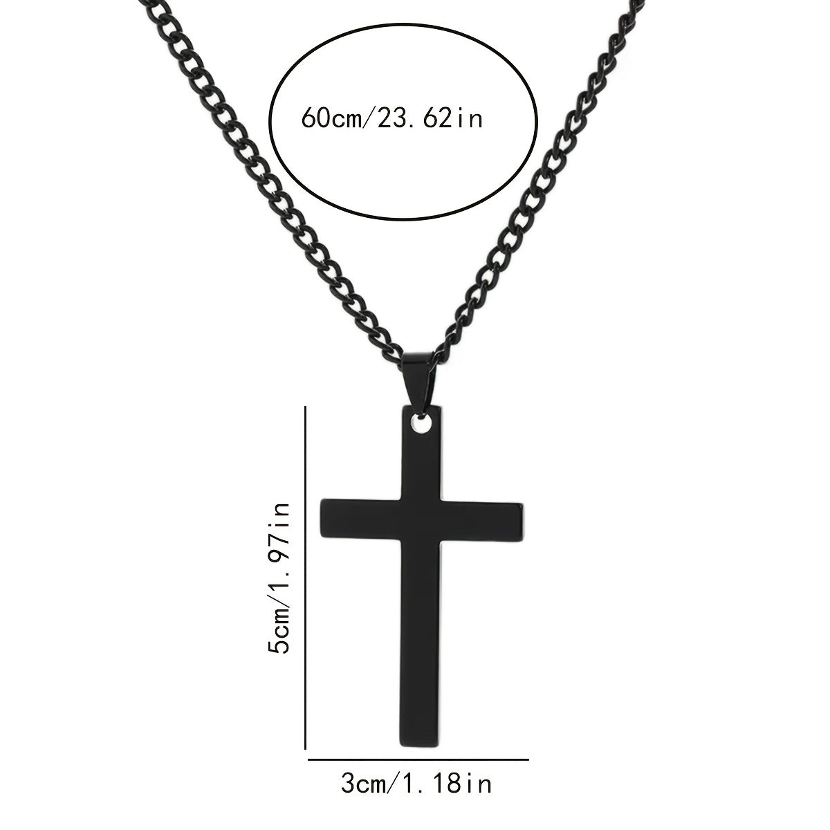 This stainless steel necklace features a Cuban chain with a cross pendant in golden and silver tones.