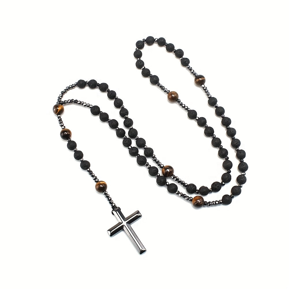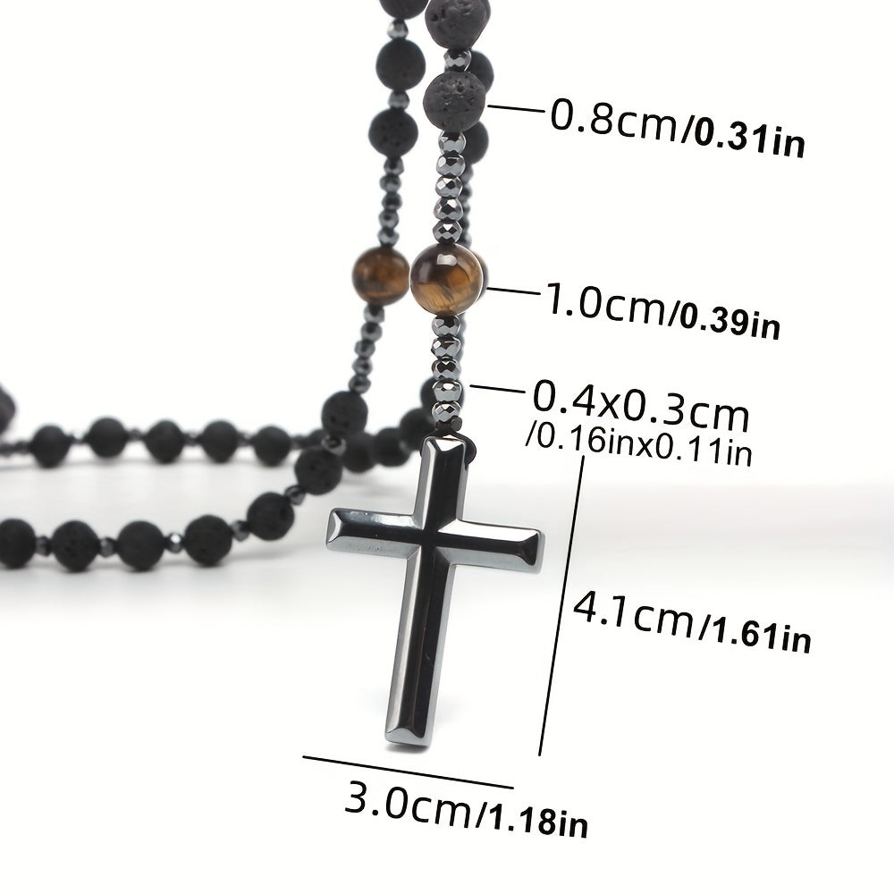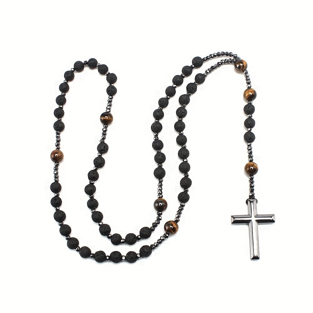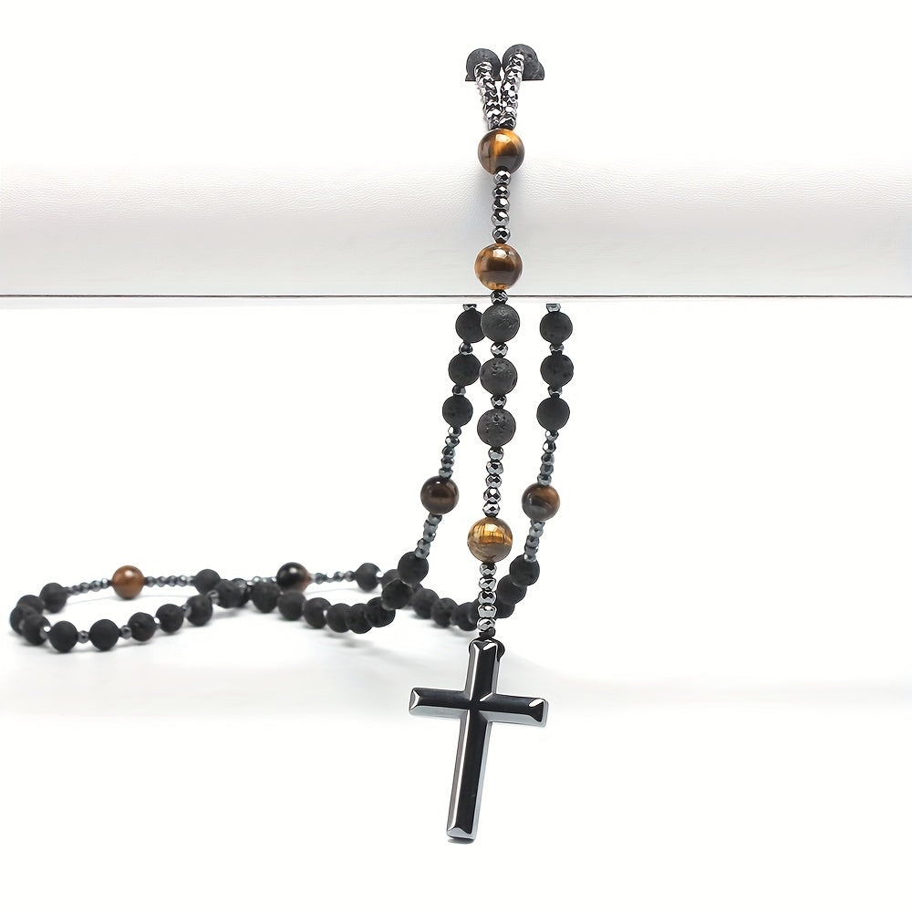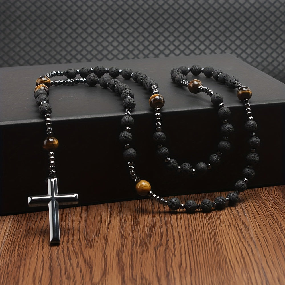 This men's necklace features natural tiger eye beads and volcanic rock with a cross pendant. It's a stylish and meaningful accessory.