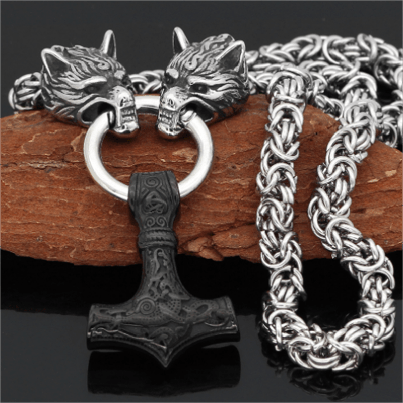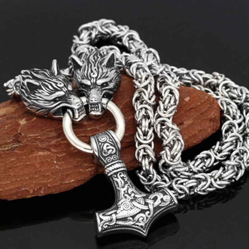 Men's Viking Wolf Steel Chain & Hammer Pendant Necklace