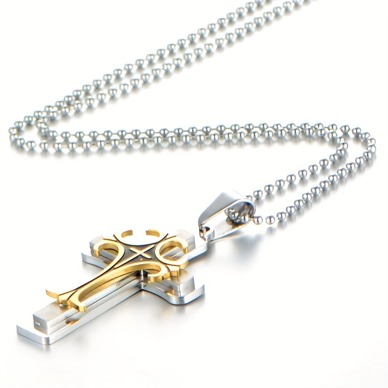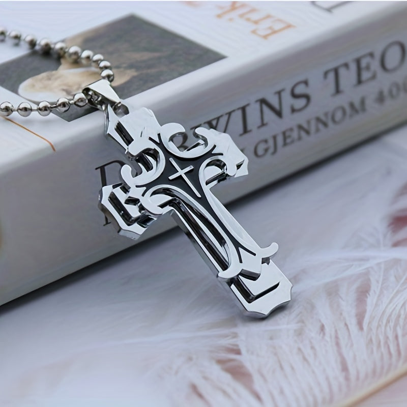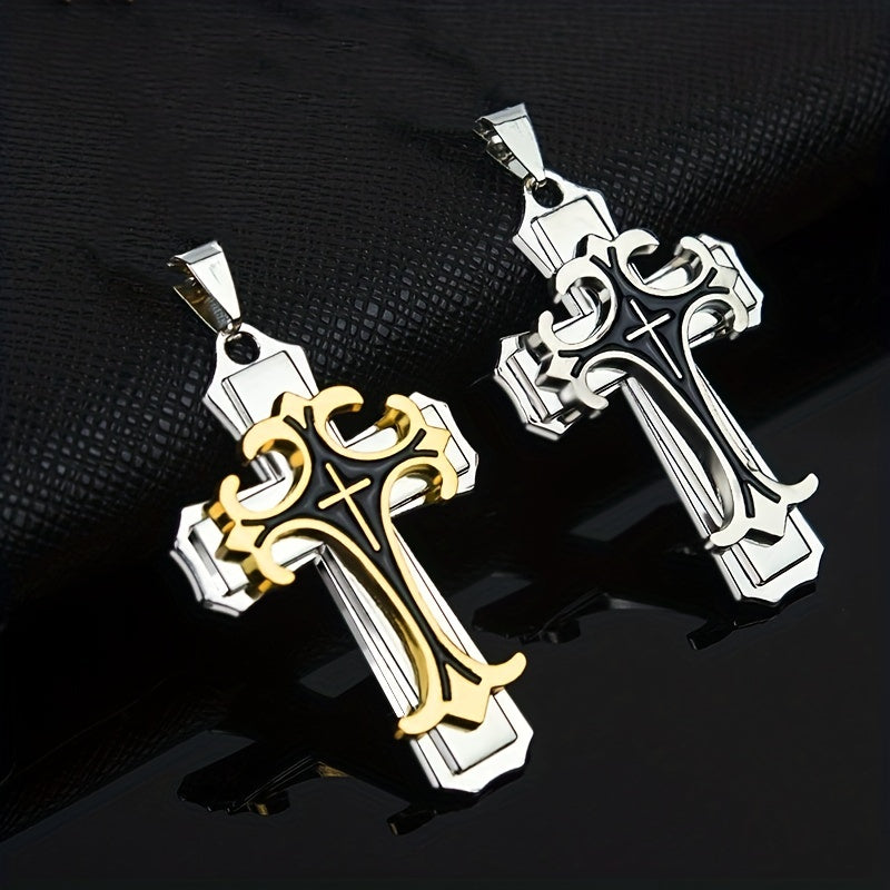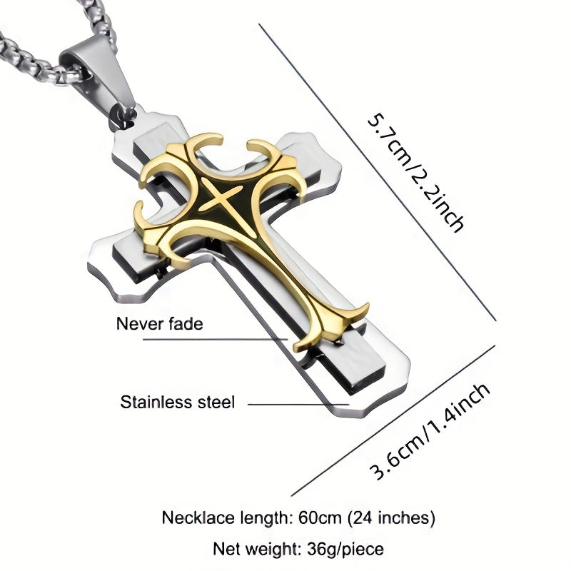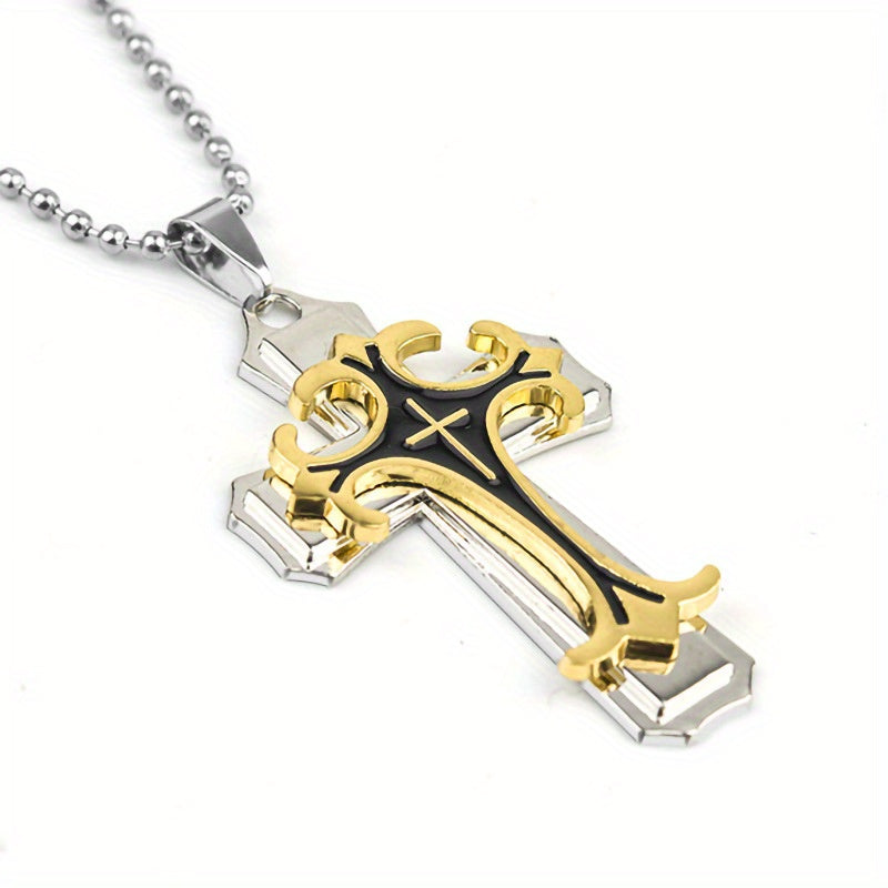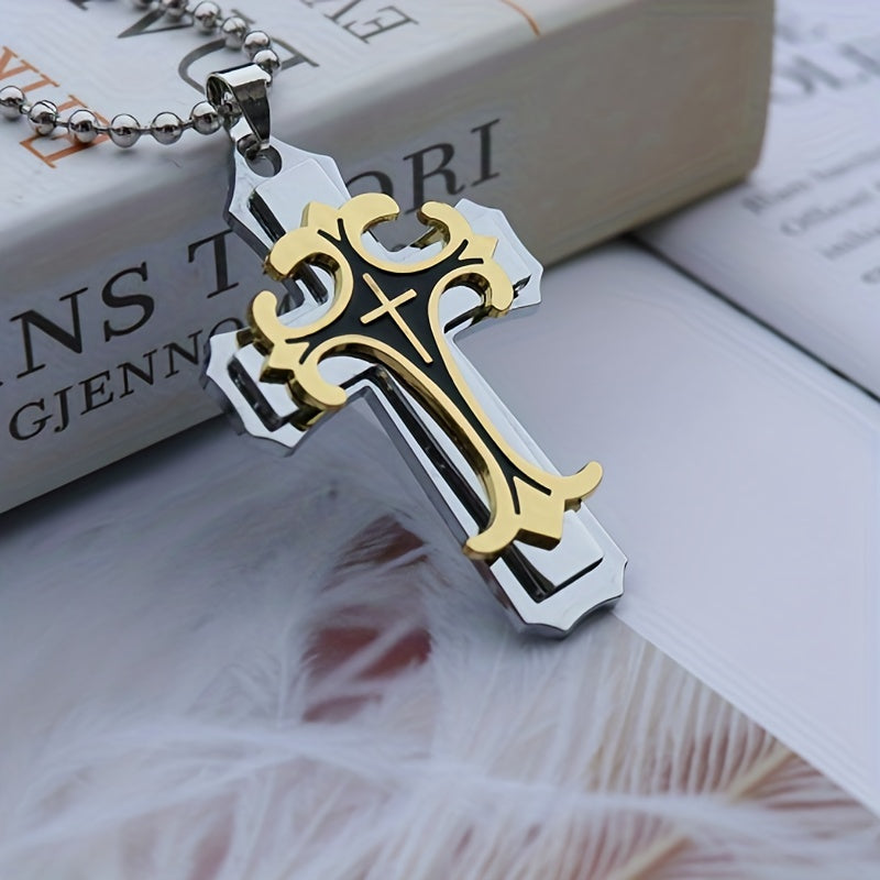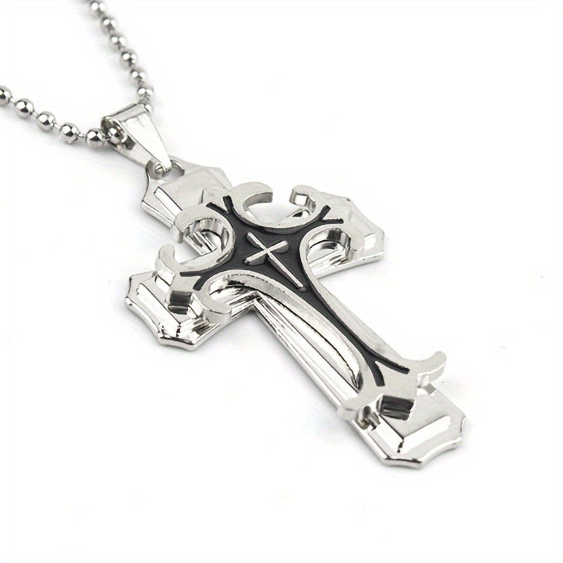 This three-layer metal cross necklace features a classic religious pattern pendant that adds style to any outfit. Perfect for men who appreciate a unique accessory.