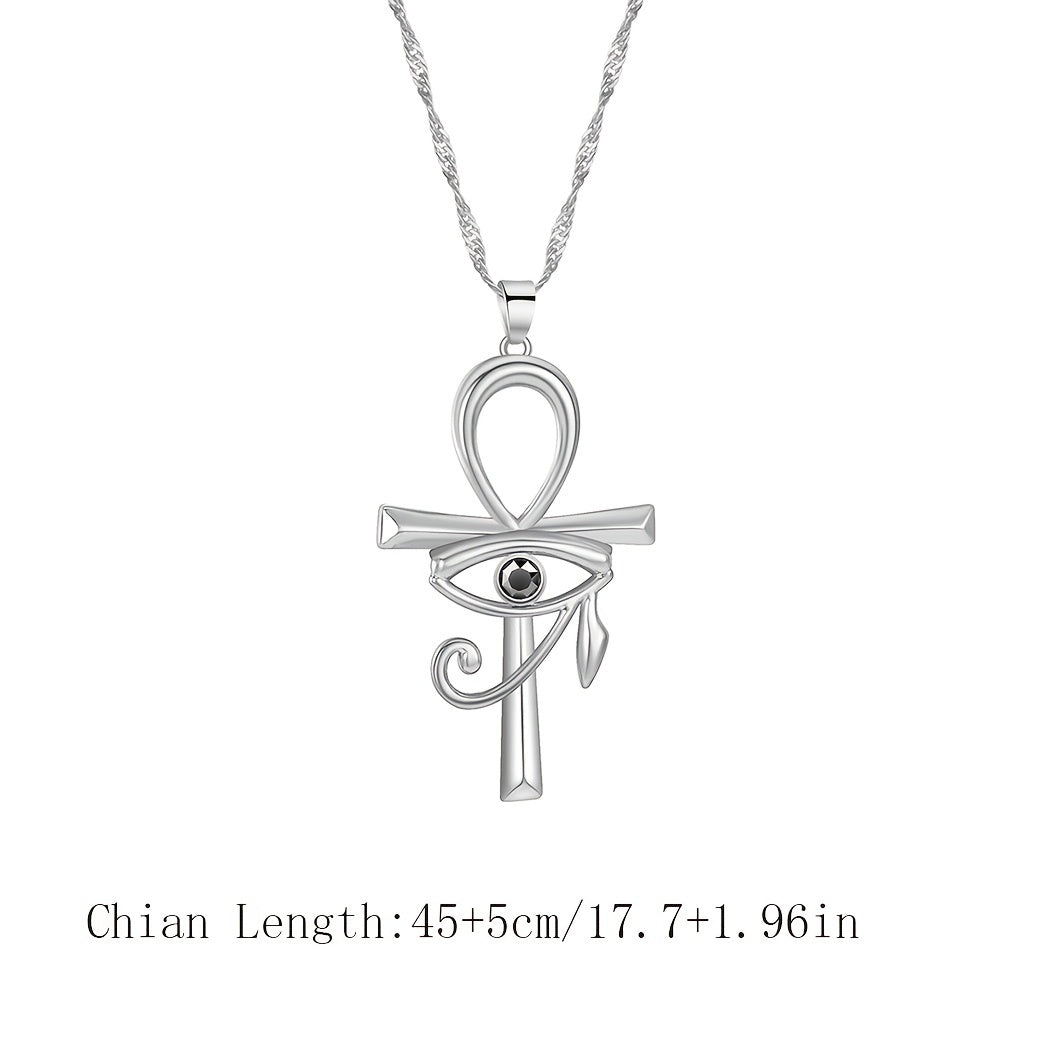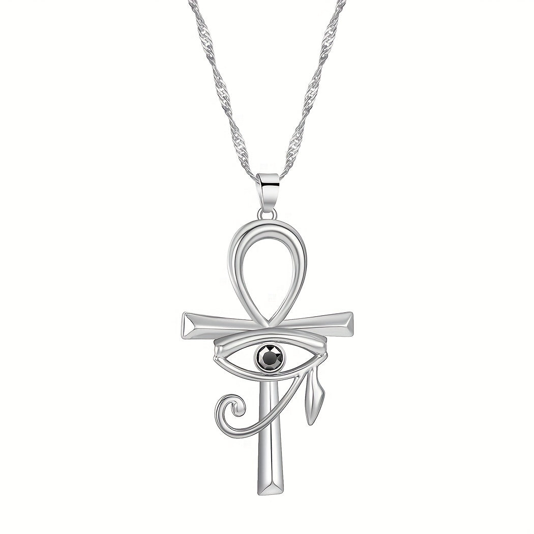 This pendant necklace features a mysterious Egypt ancient design with an evil eye of Horus, Ankh cross, and key elements. It is a unique piece of religious Viking jewelry suitable for both women and men.