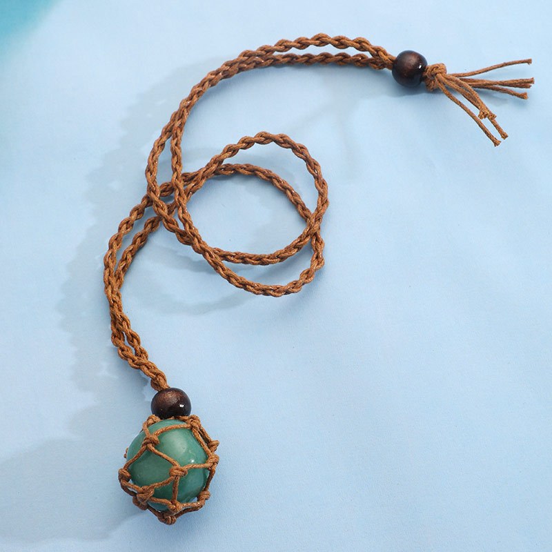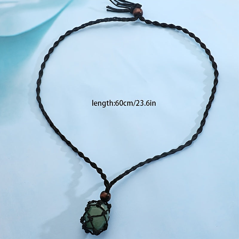This hand-woven necklace features a raw natural stone crystal pendant in a mesh pocket design. It is adjustable and perfect for crystal healing.