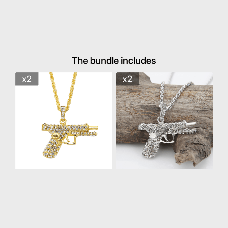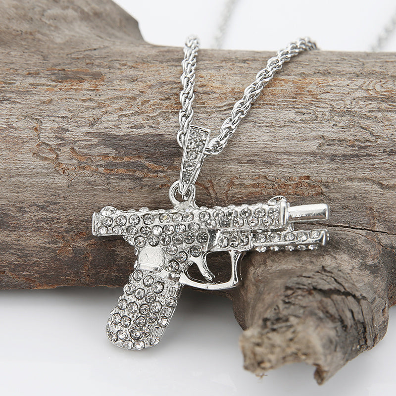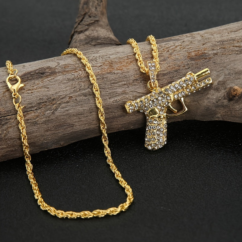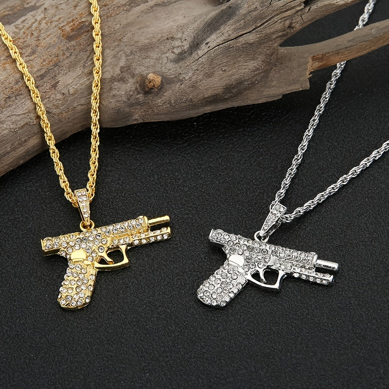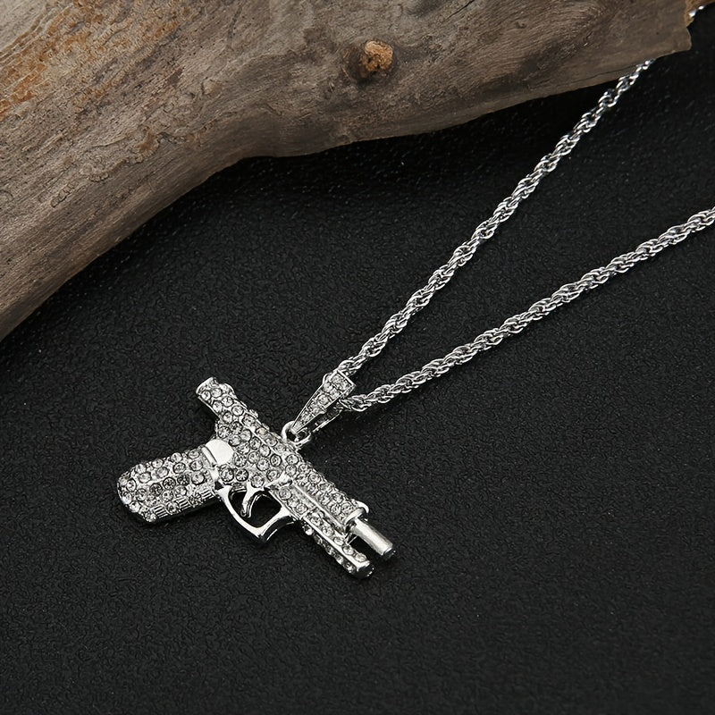 Enhance your style with this unique artificial diamond pistol necklace. Perfect accessory for men.