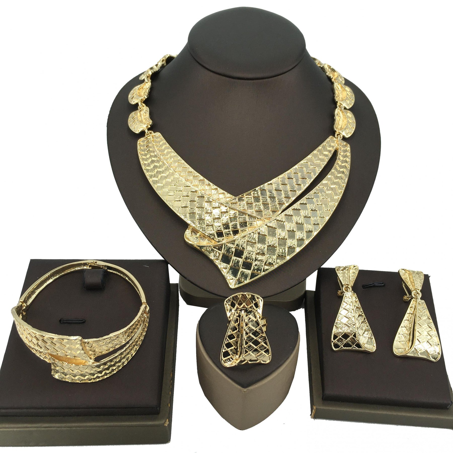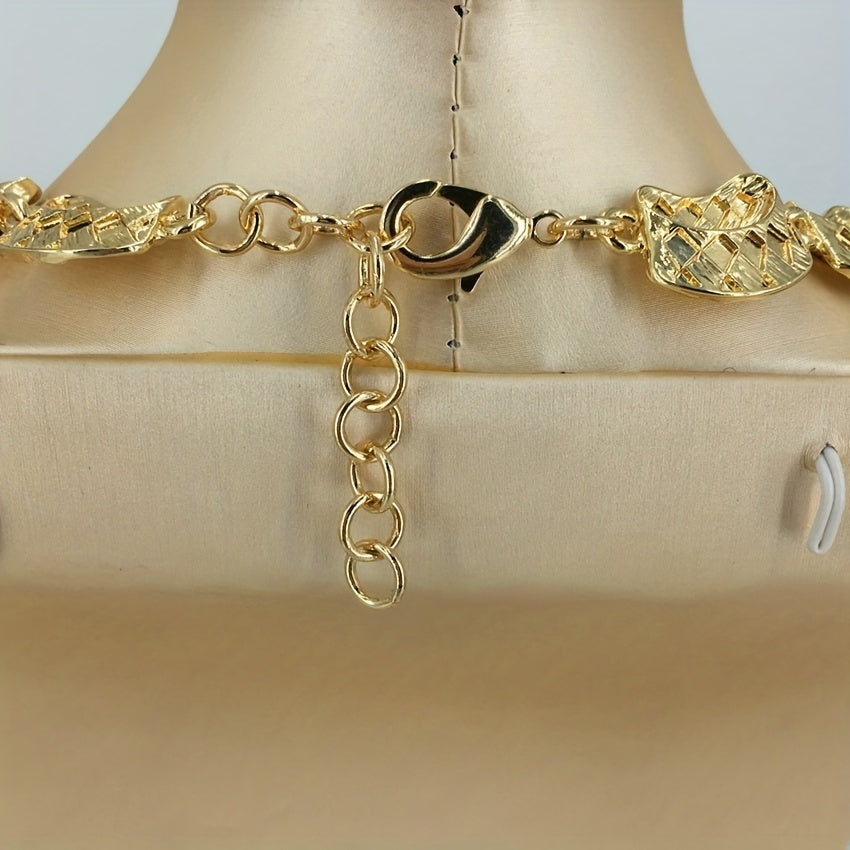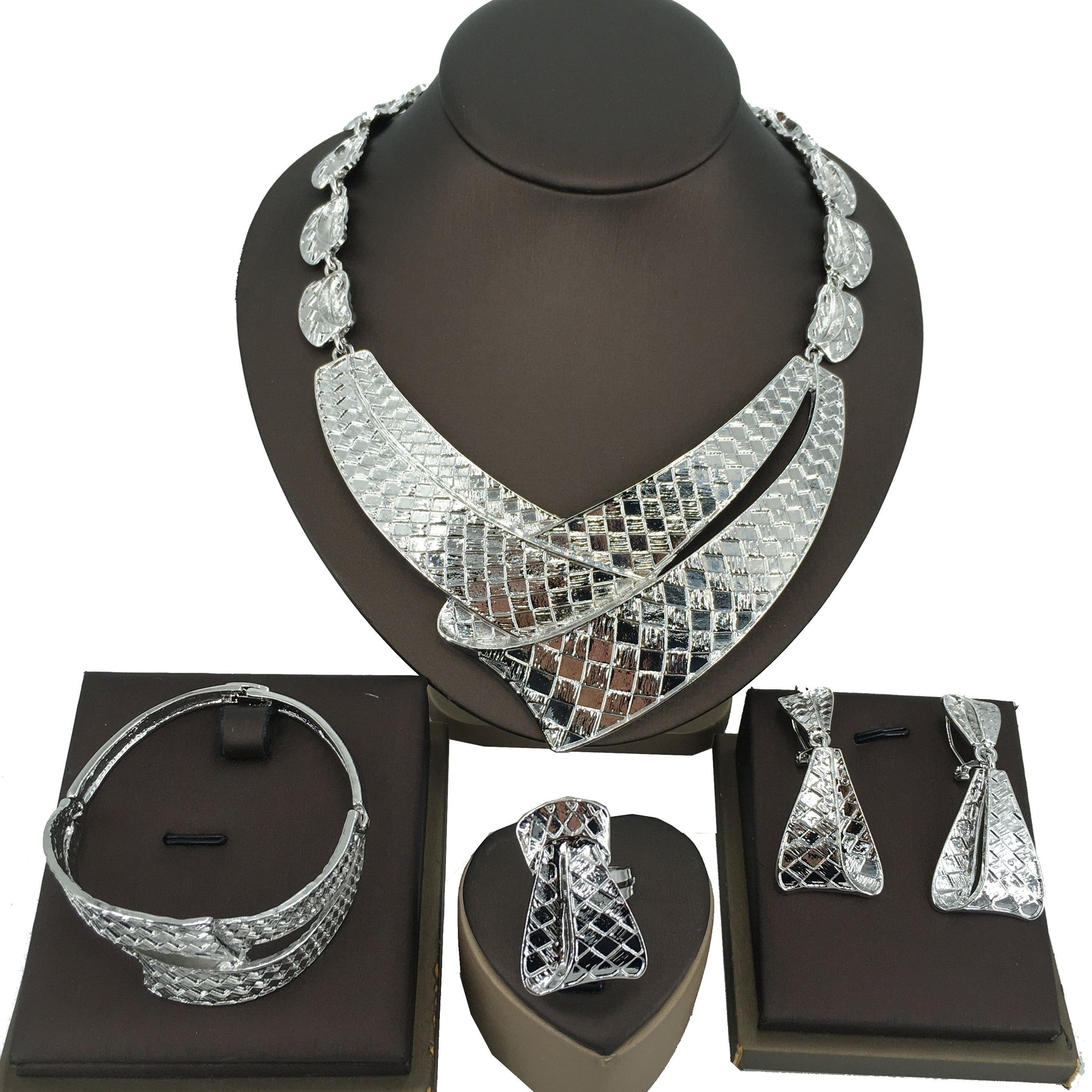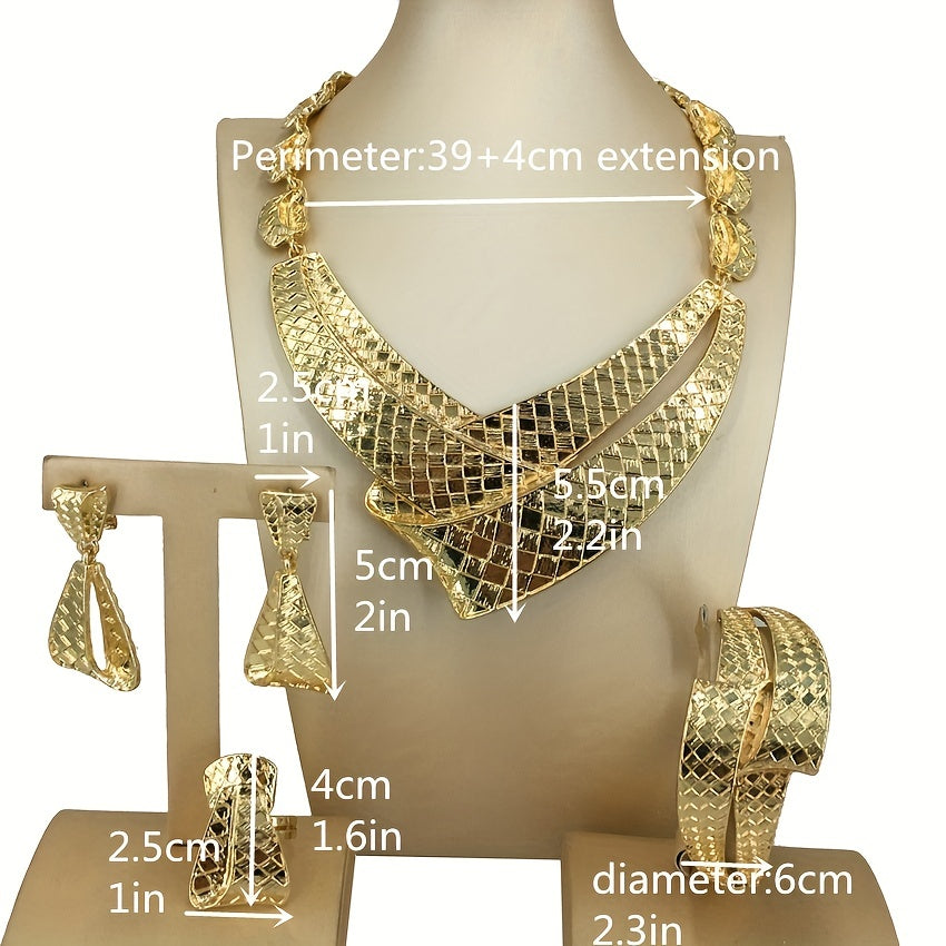 Complete your look with this special plaid chunky pendant necklace, bracelet, earrings, and finger ring jewelry set designed for women and girls with an African flair.
