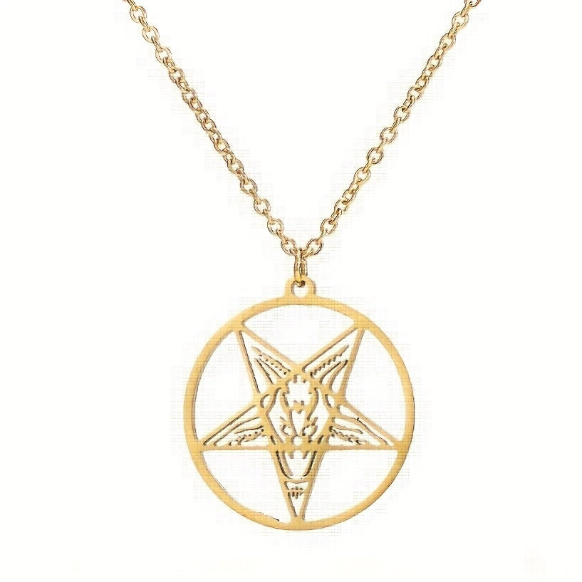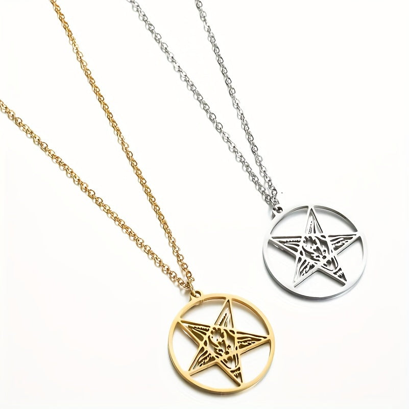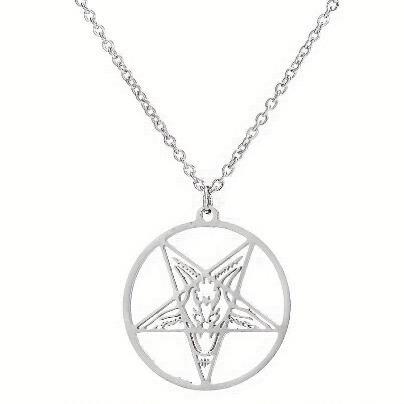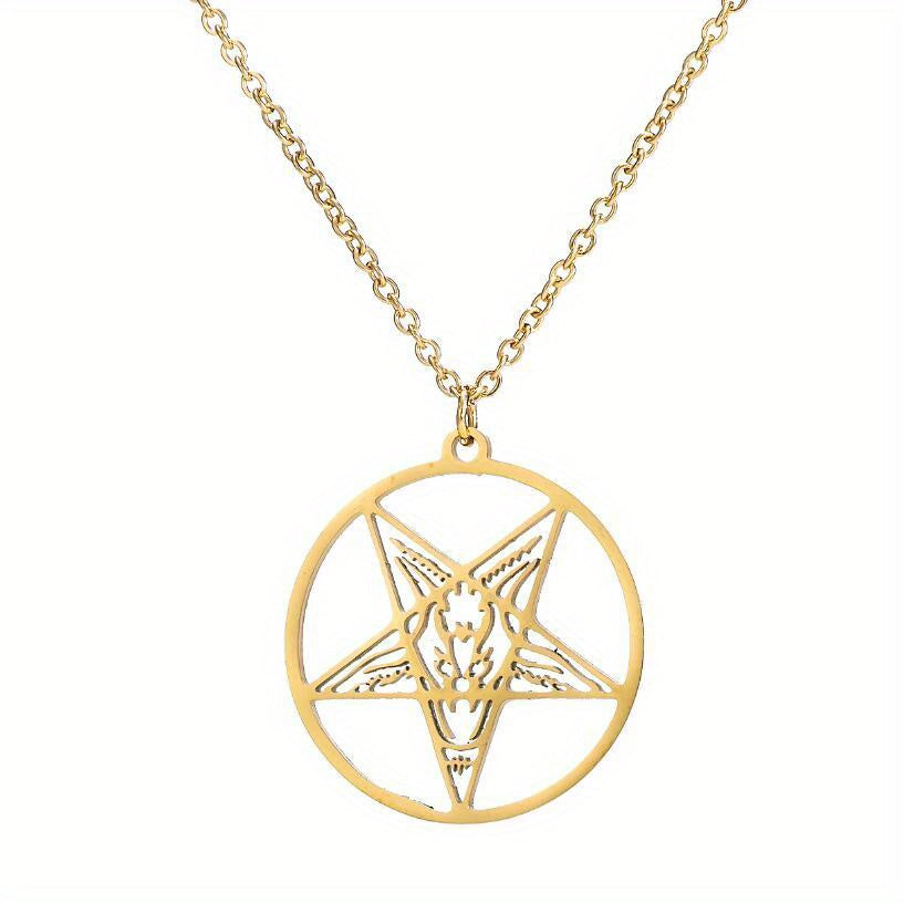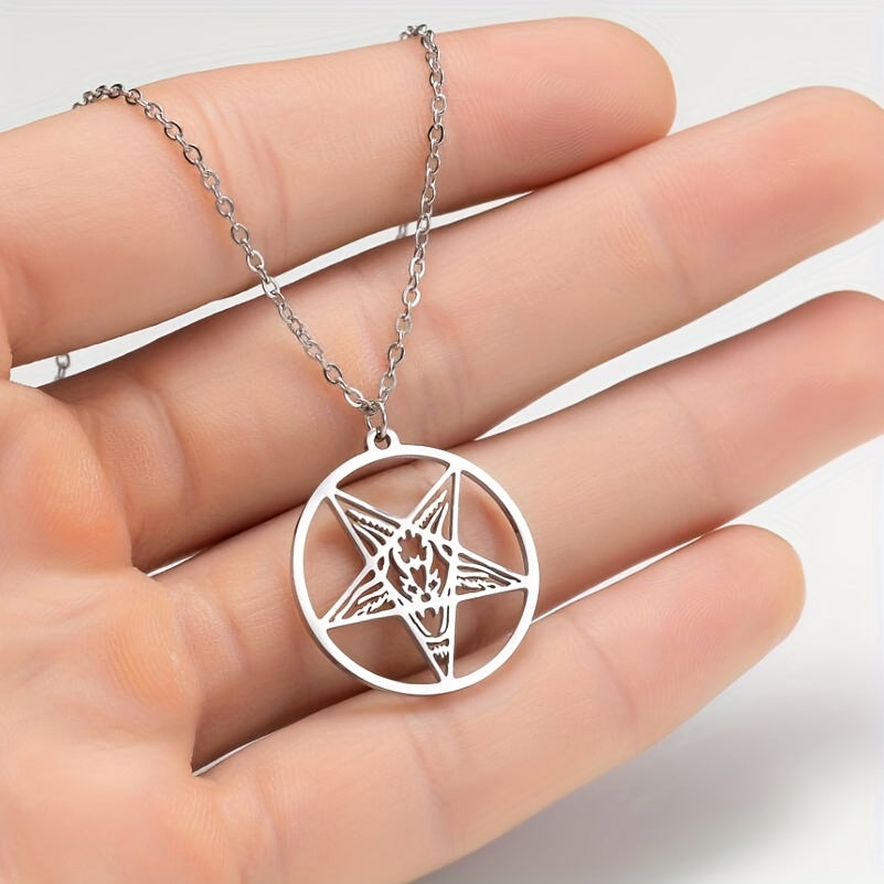 This unique stainless steel necklace features a geometric circular design with a hollowed-out skull, making it a perfect accessory for a punk or Halloween look.