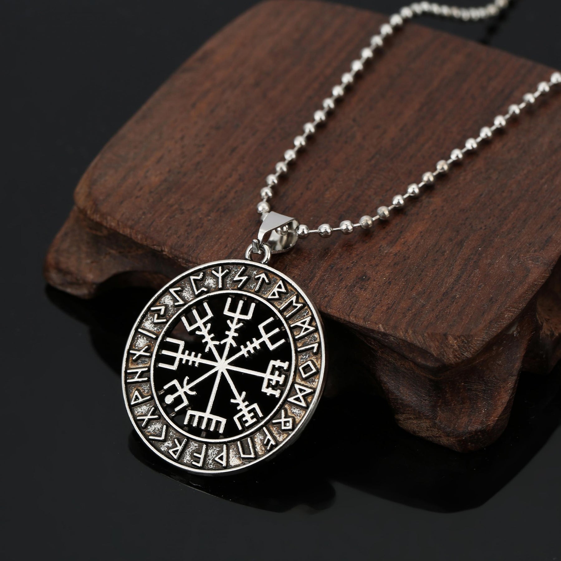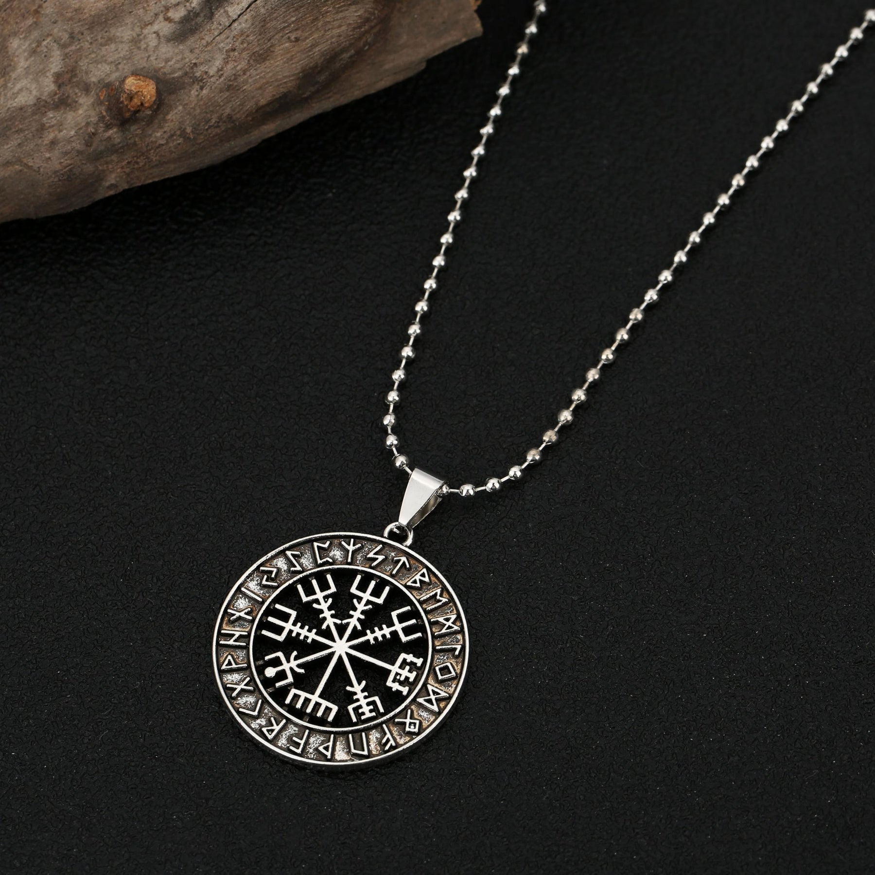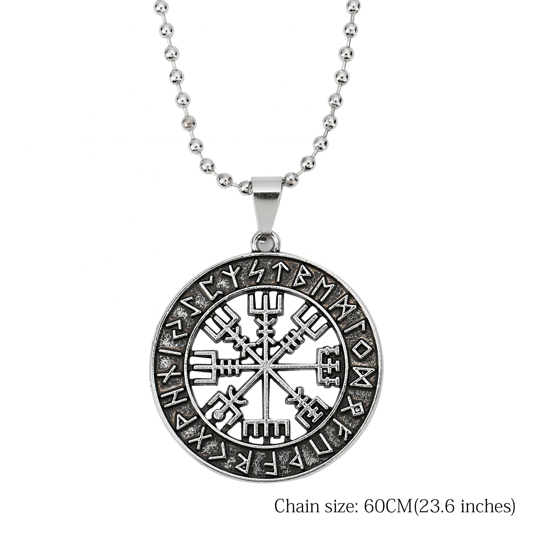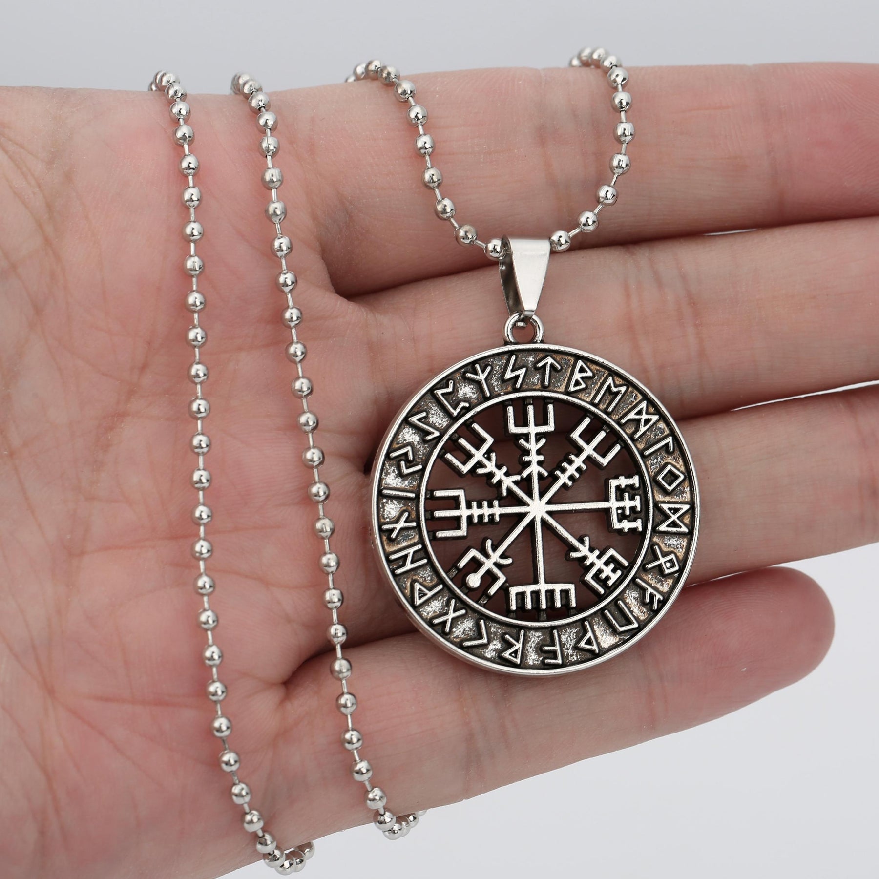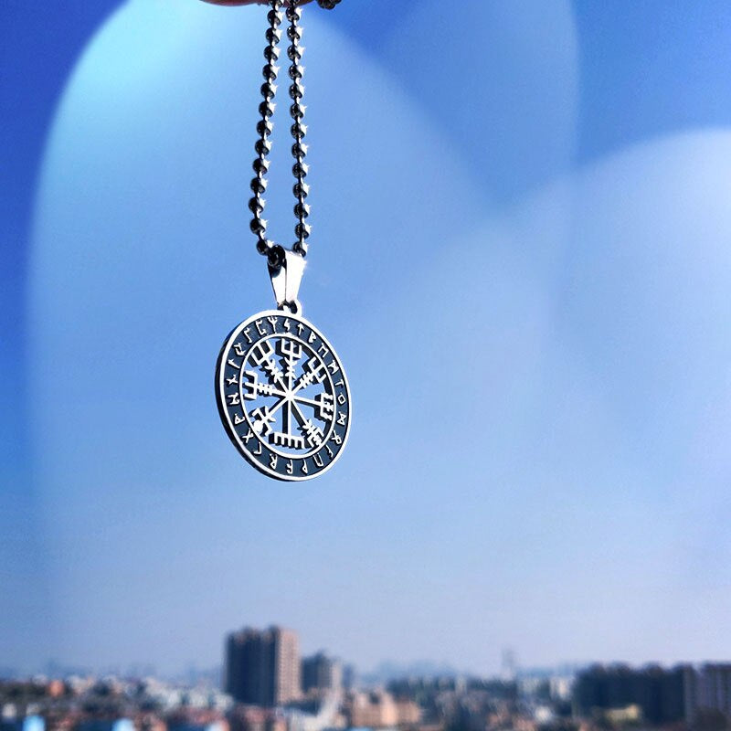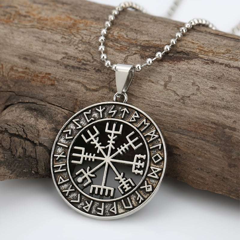 Embrace the Viking spirit with this unique punk-style necklace featuring a fierce Icelandic helmet design in a runic circle.