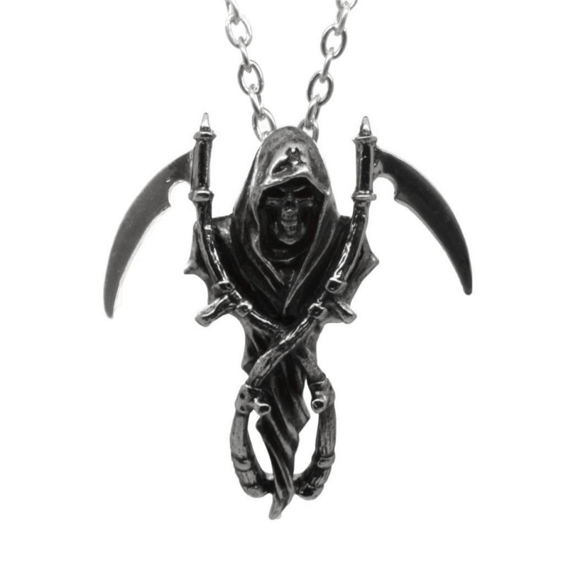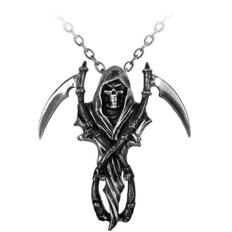 This cold reaper sickle skull pendant necklace is a striking piece of gothic jewelry that embodies death's essence.