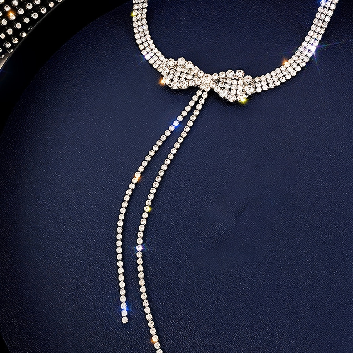 Shine bright like a diamond with this sparkly rhinestone necklace featuring a crystal bowknot pendant. Perfect for adding glamour to your nightclub or party outfit.