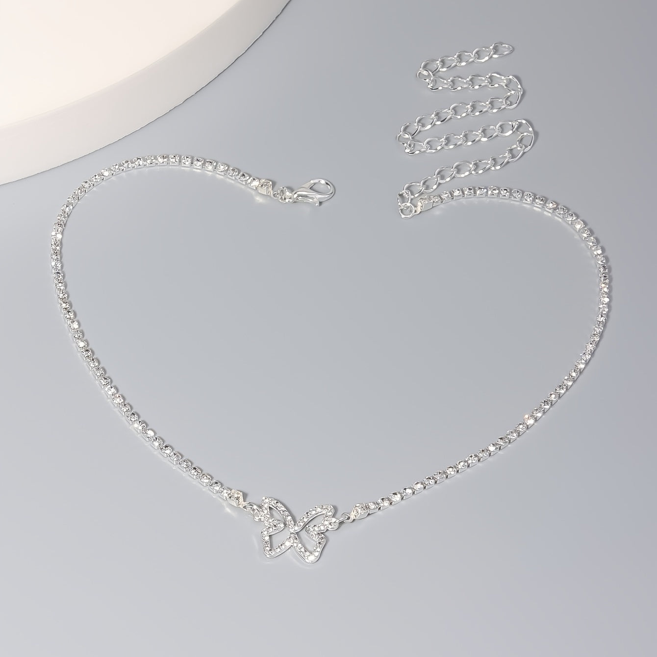 Adorn yourself with this stunning jewelry set featuring a full rhinestone butterfly design on a choker necklace, chain bracelet, and dangle earrings. Perfect for adding a touch of glamour to any outfit.