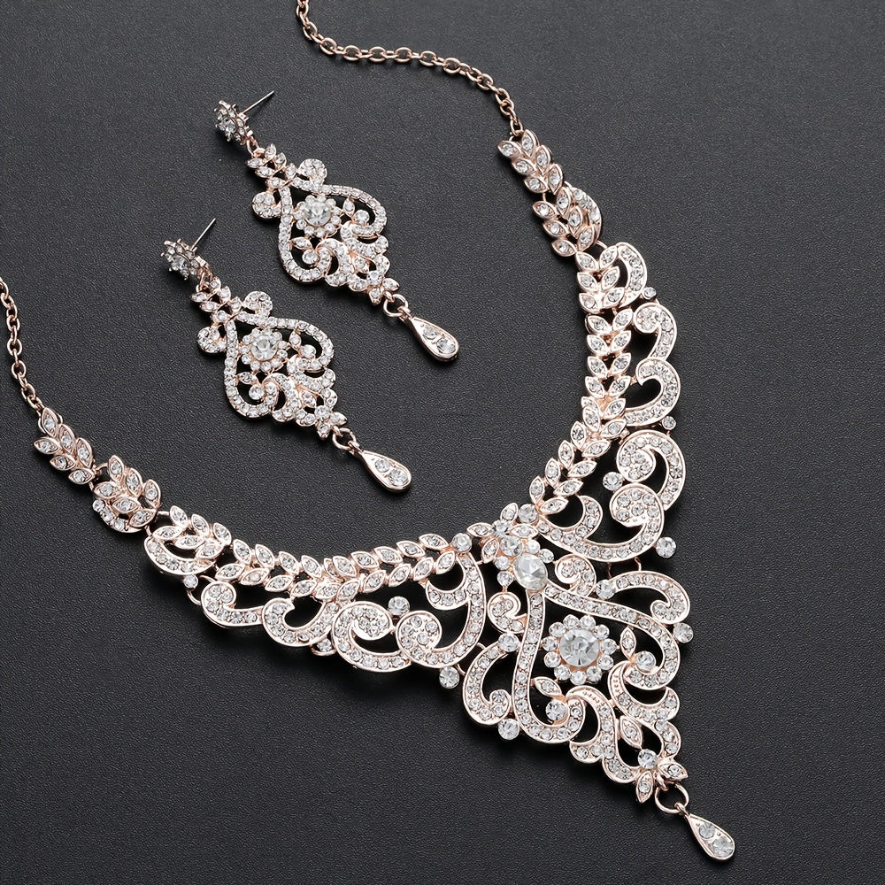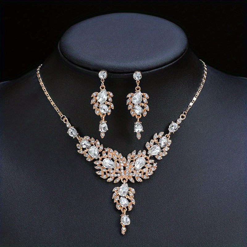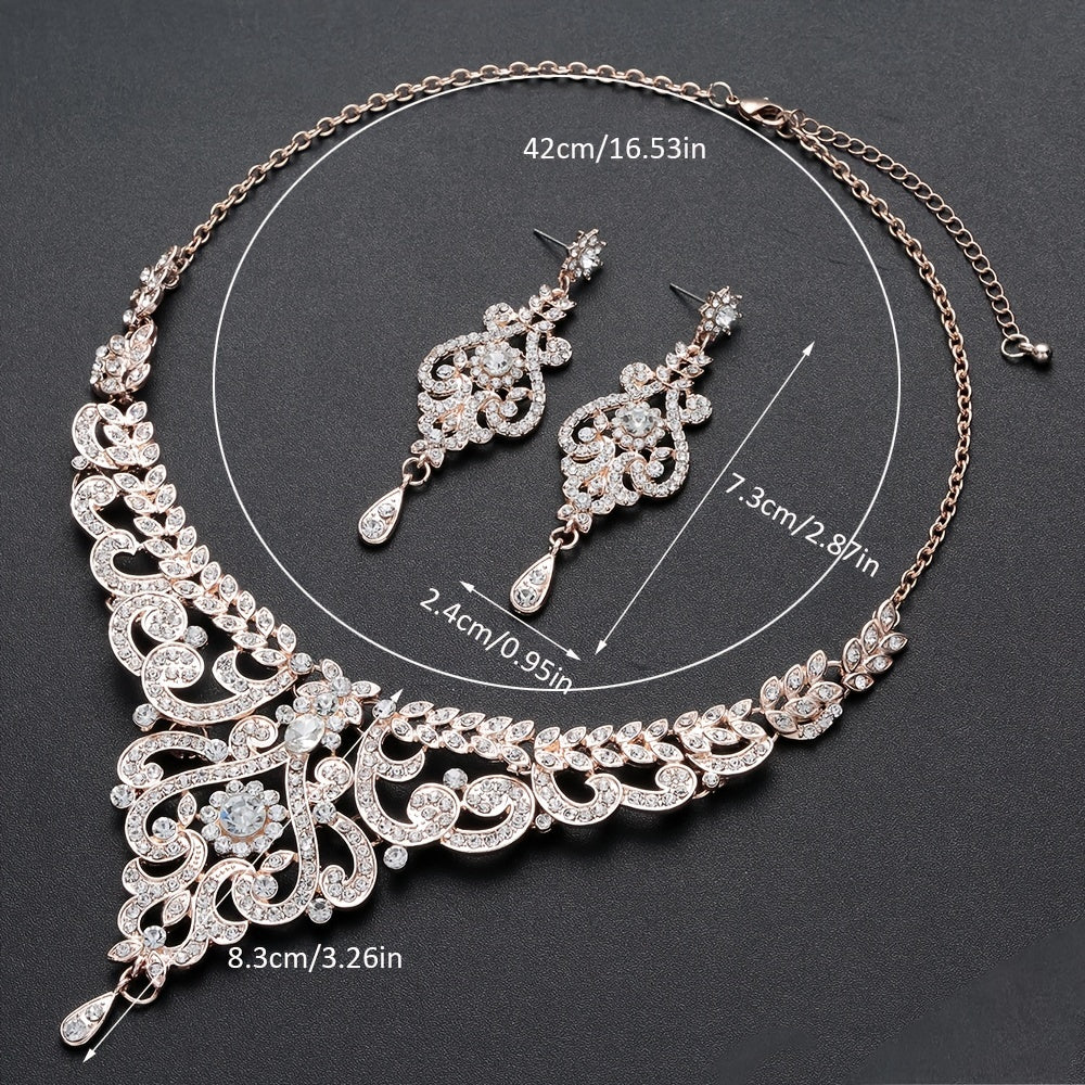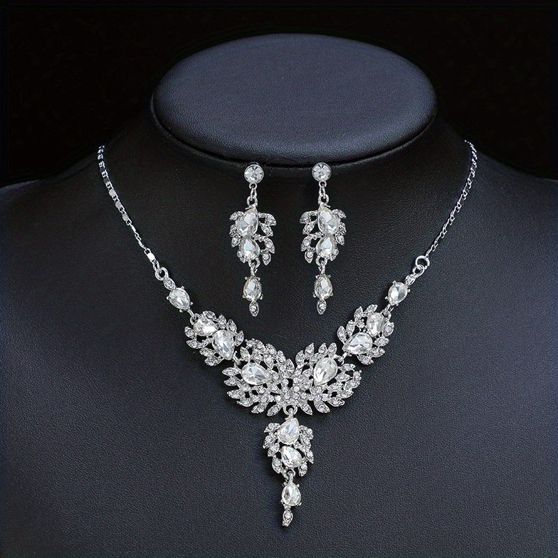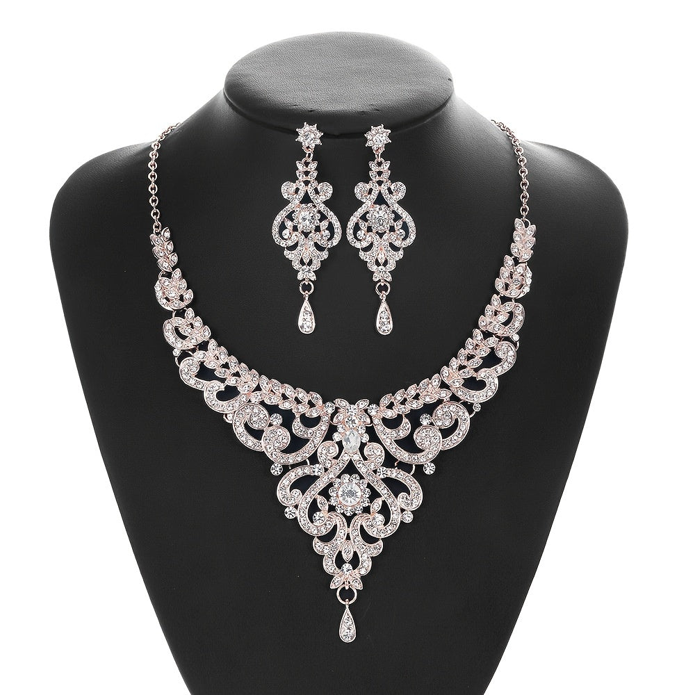 Complete your bridal look with this stunning inlaid rhinestone jewelry set. Includes a pendant necklace and matching dangle earrings. Perfect for brides and women on special occasions.