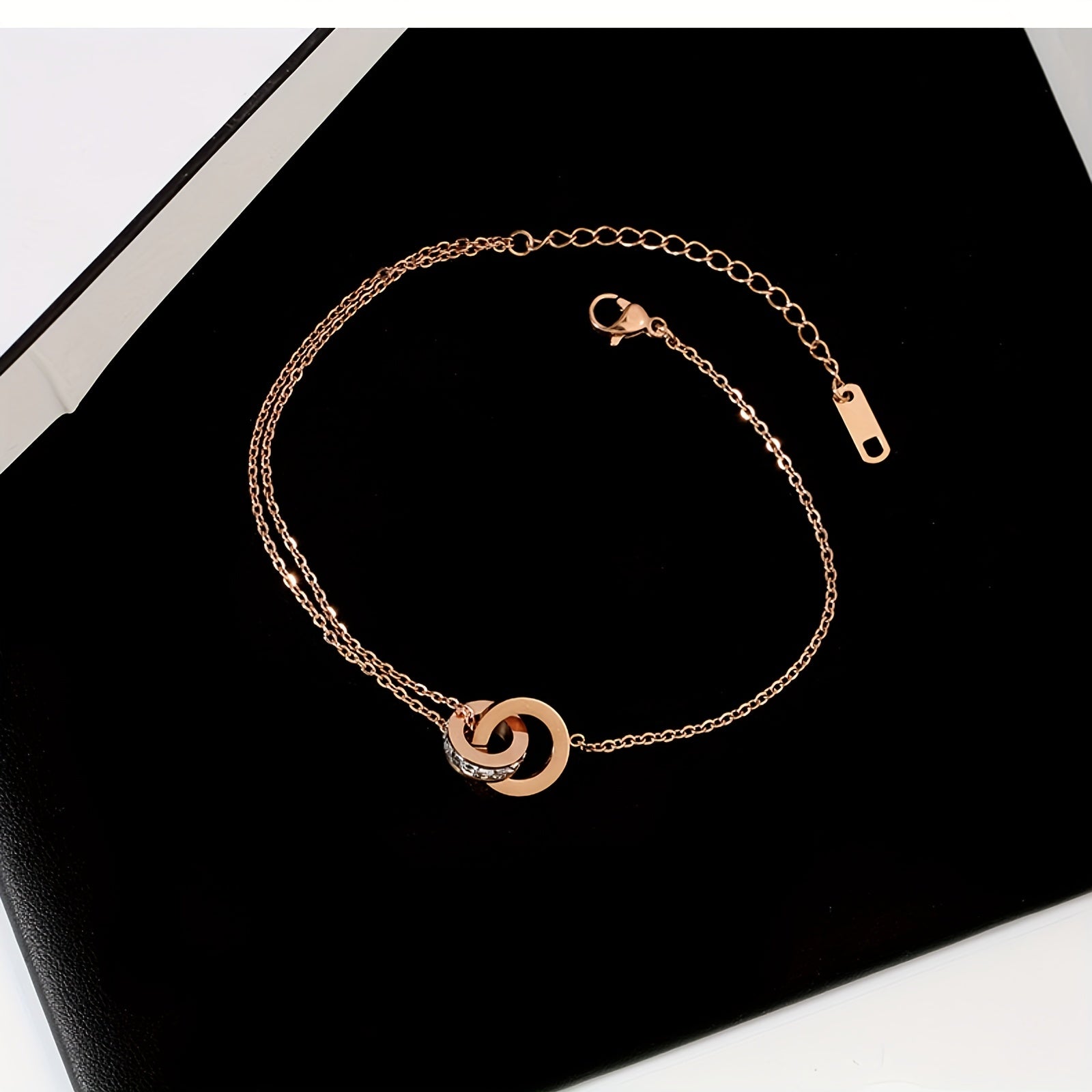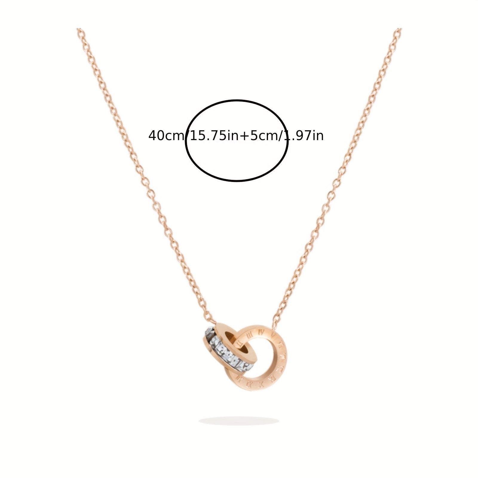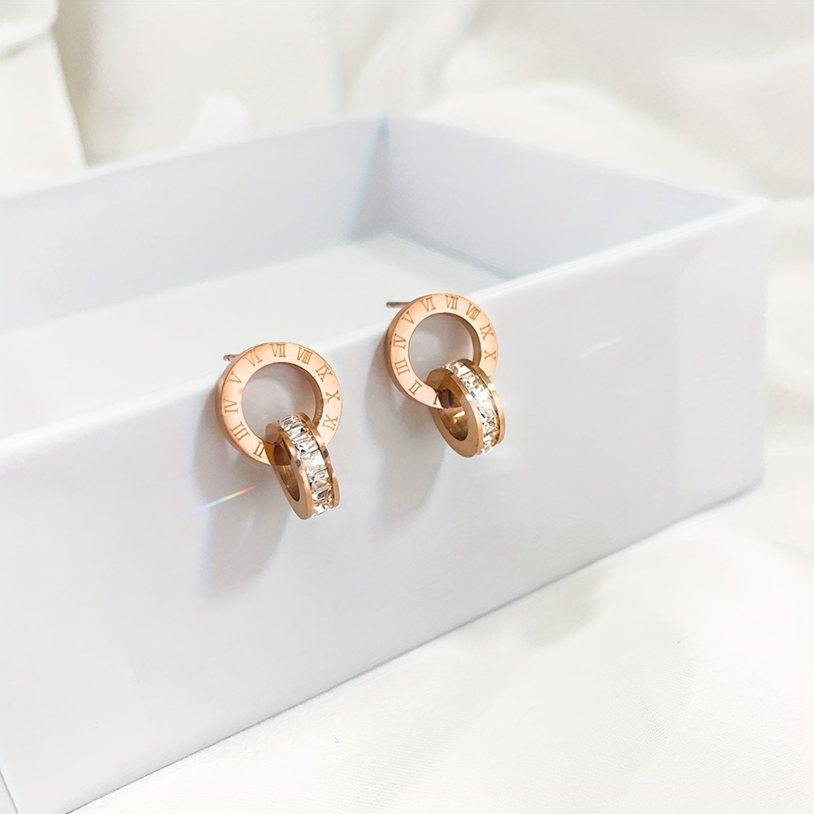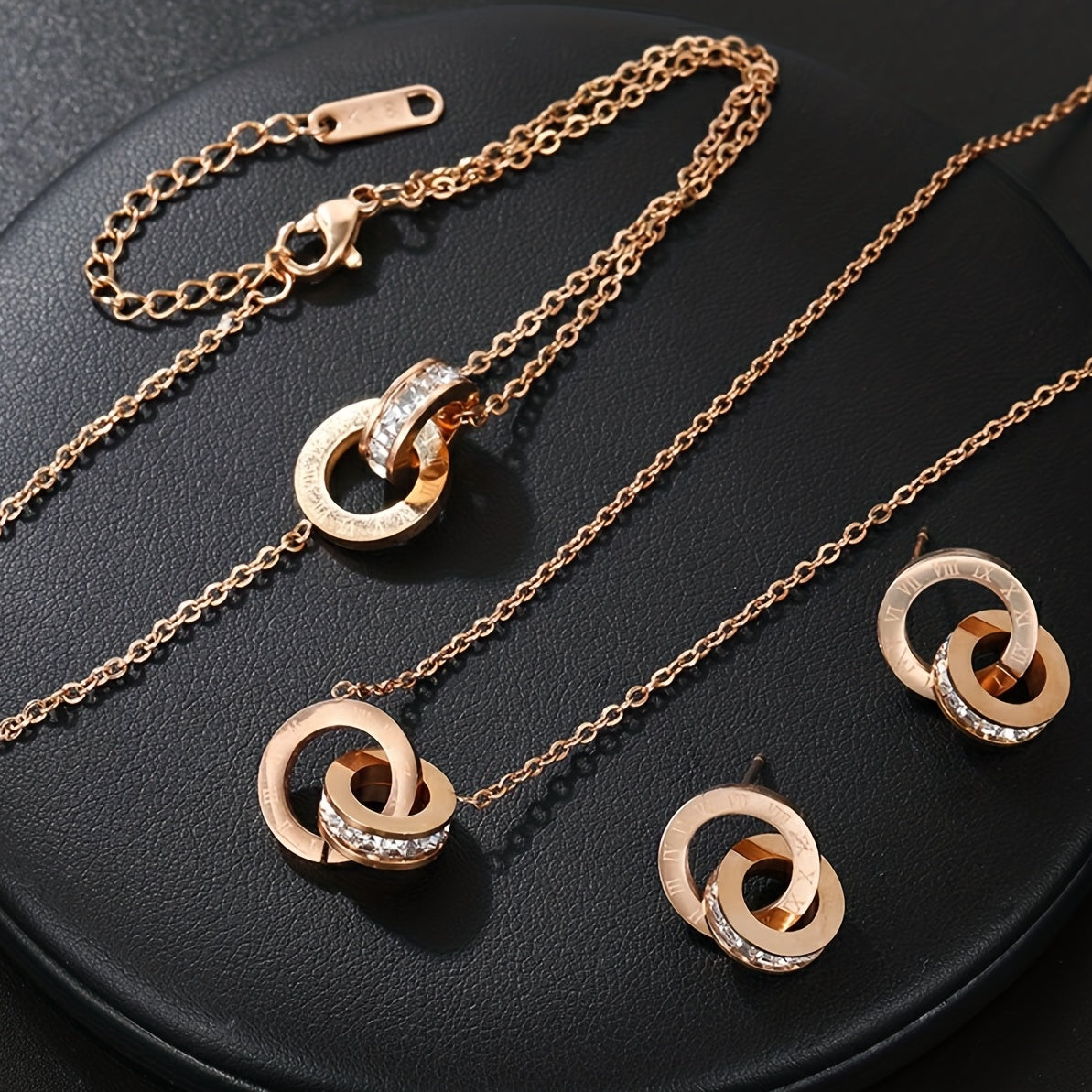 Enhance your style with this set of minimalist rose golden stainless steel jewelry featuring Roman numerals design. Includes necklace, bracelet, and earrings.