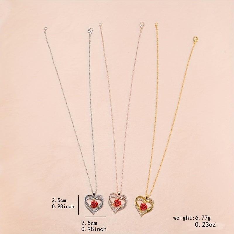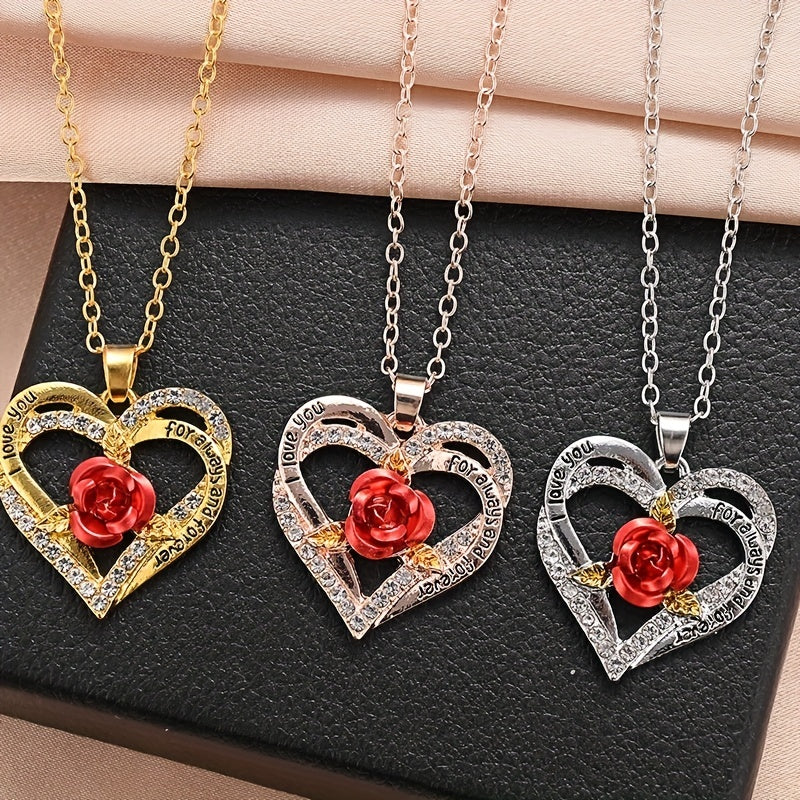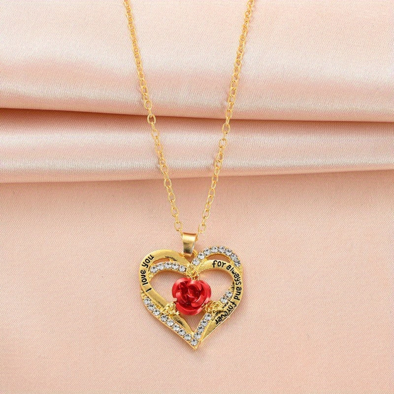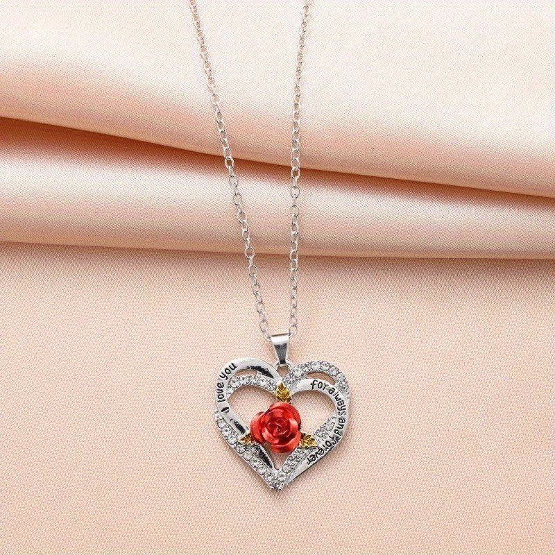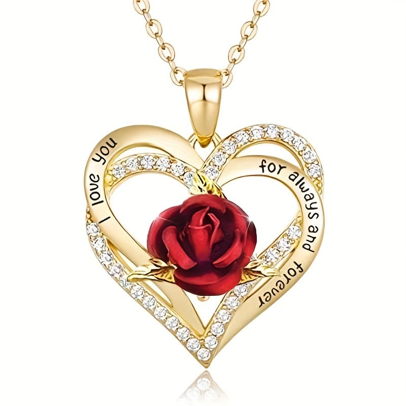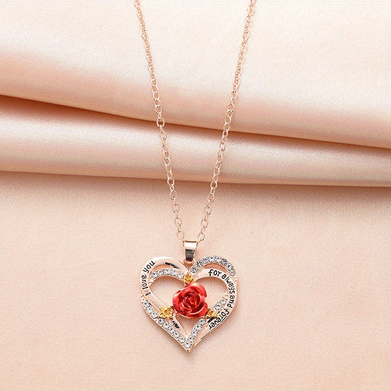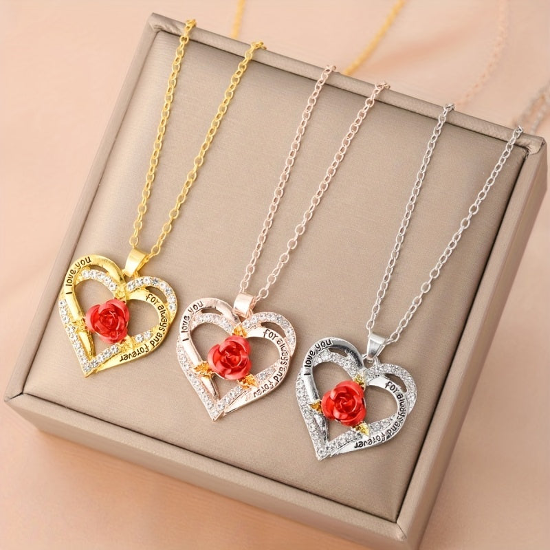 This elegant necklace features a heart-shaped rose peach pendant with an "I LOVE YOU" letter inlaid faux diamond, making it a perfect gift for mothers.