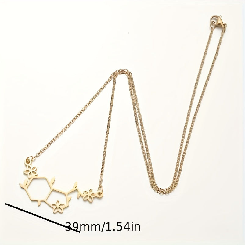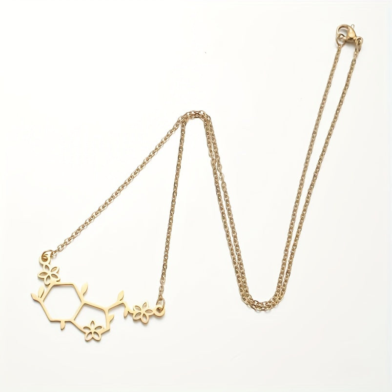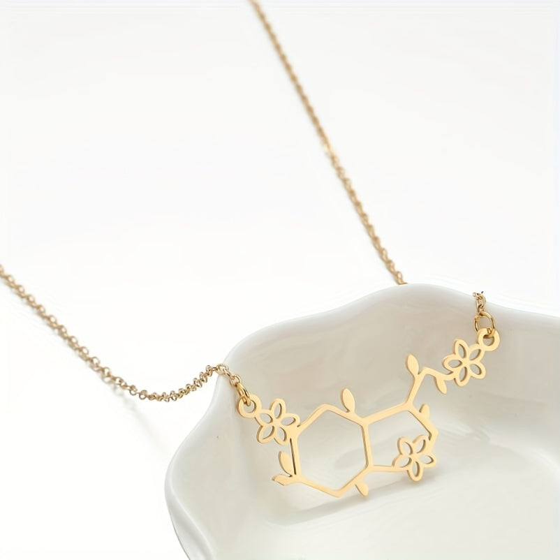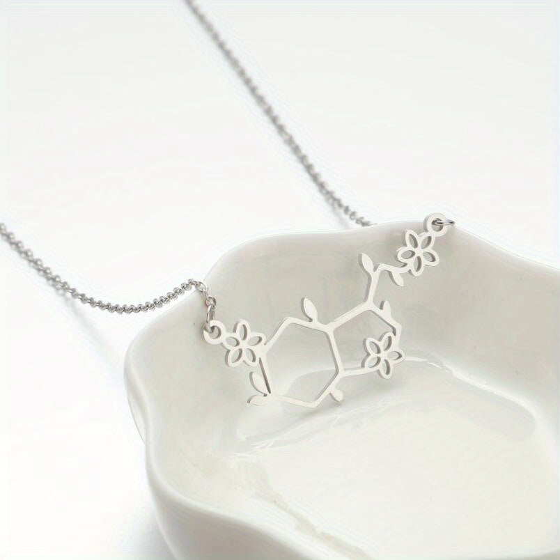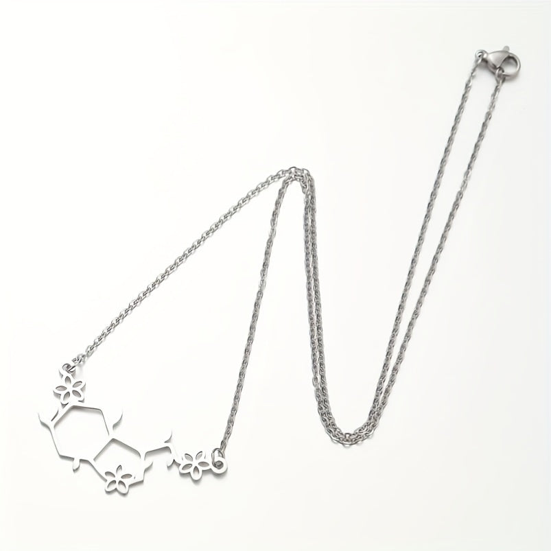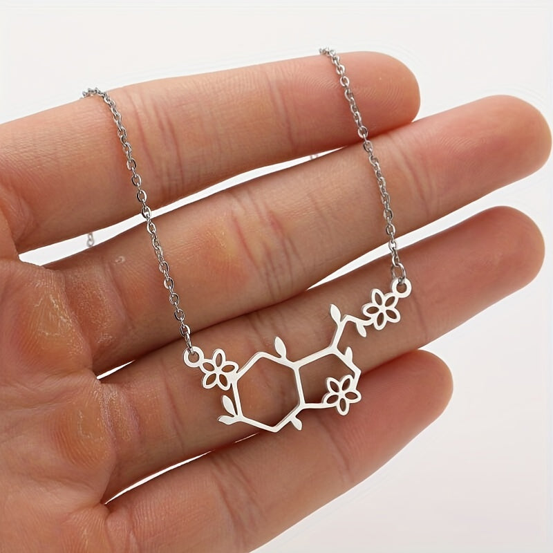 Embrace your love for chemistry and science with this serotonin molecule pendant necklace featuring a delicate flower charm. Perfect for men who appreciate unique jewelry pieces.