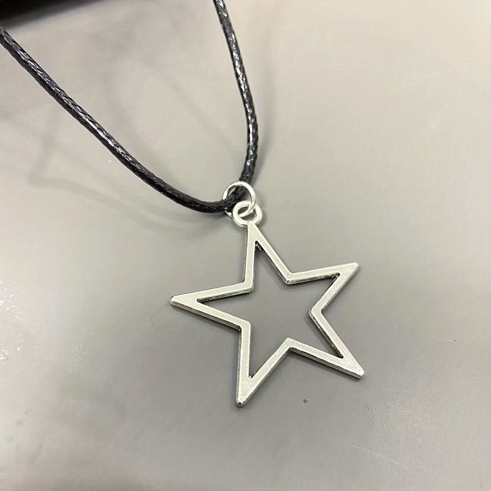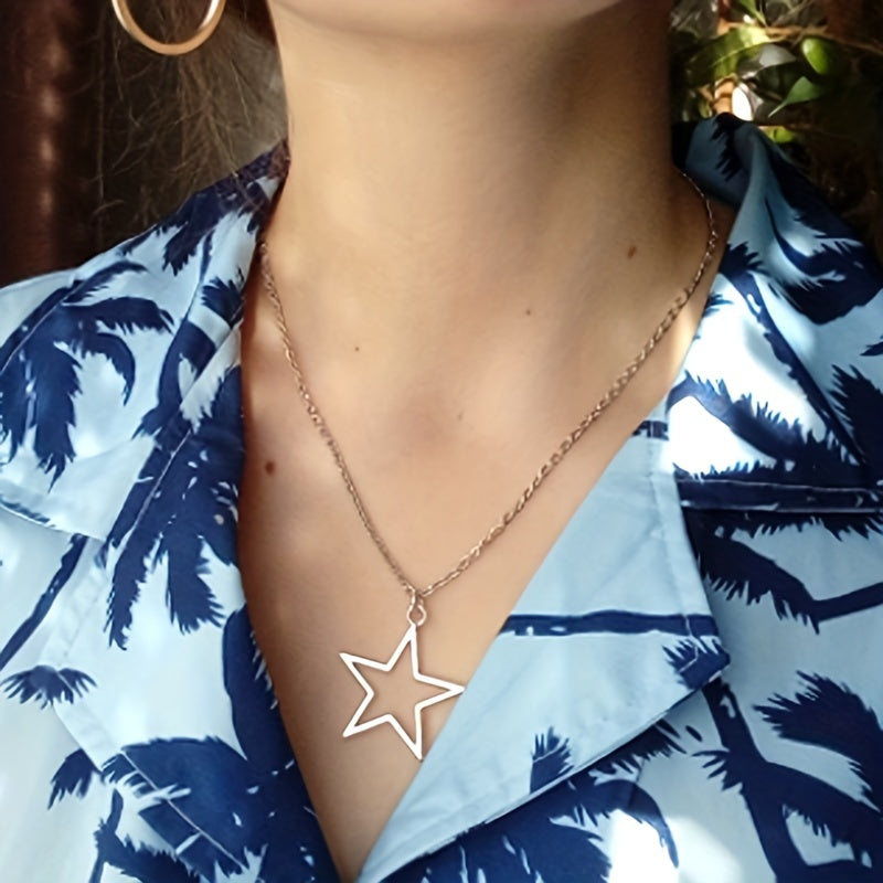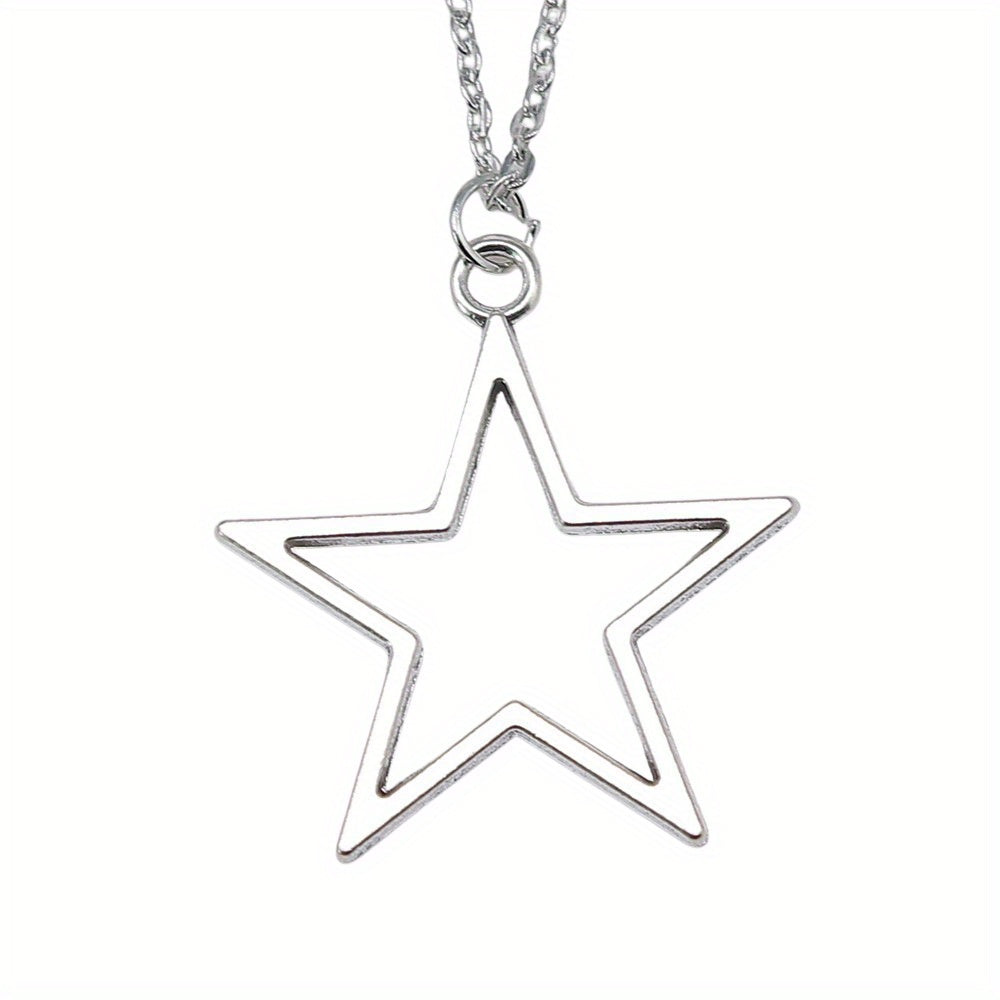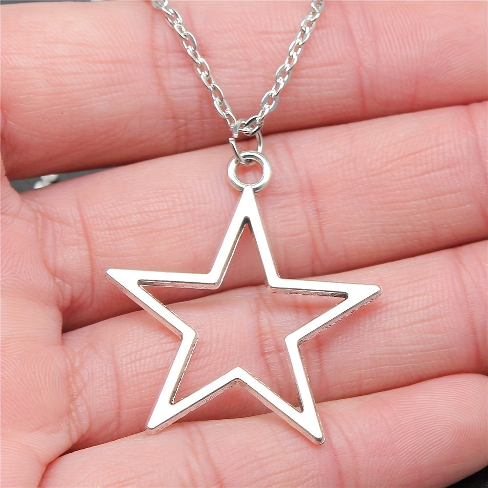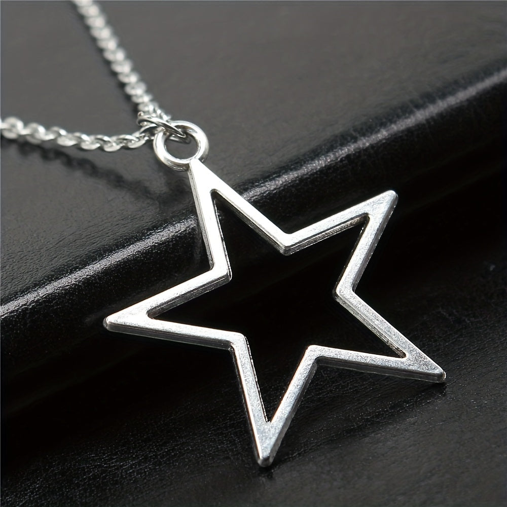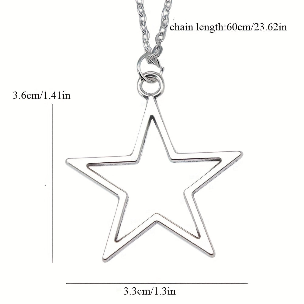 This pendant necklace features a large silver star pendant with a hollow pentagram design on a geometric link chain. Suitable for boys and girls.