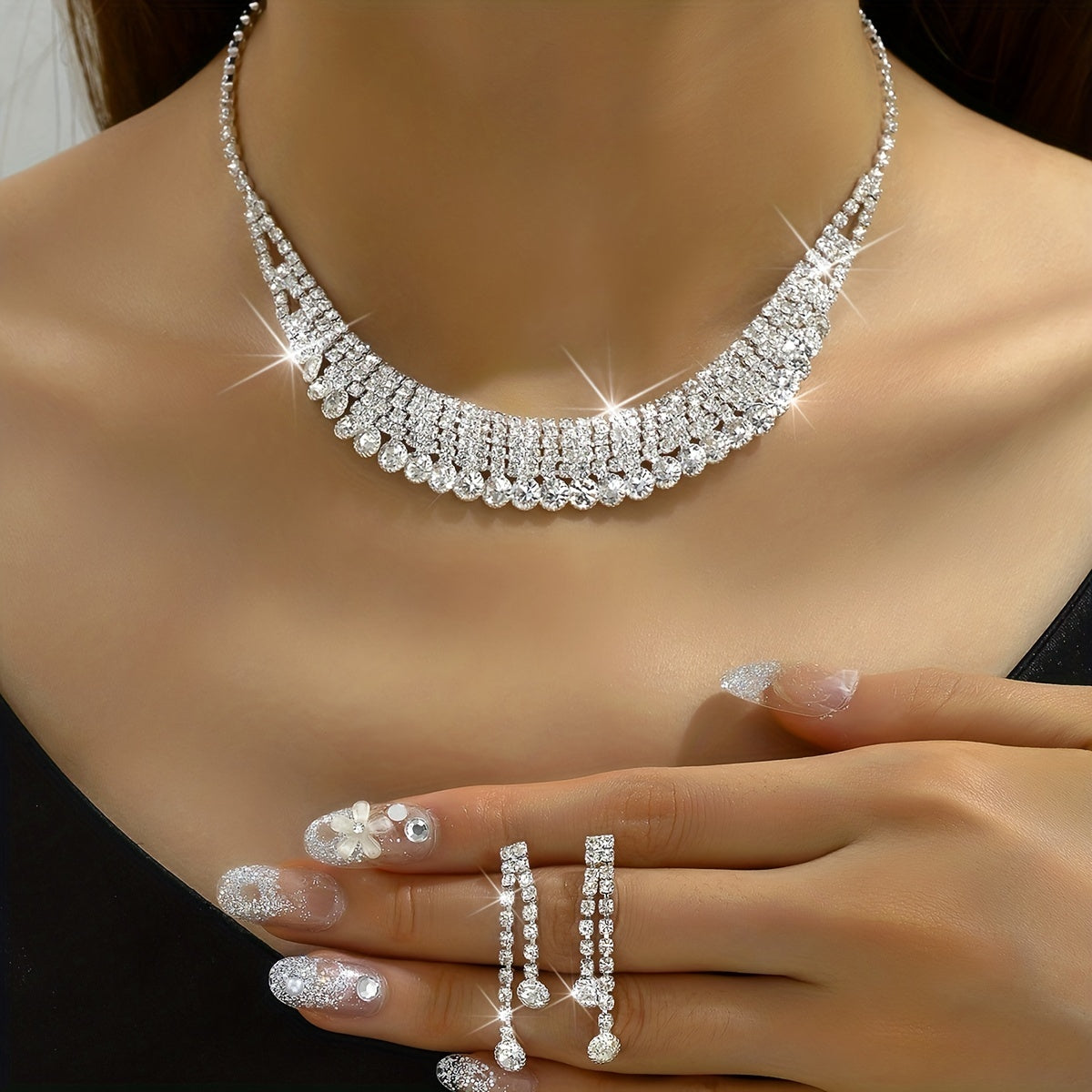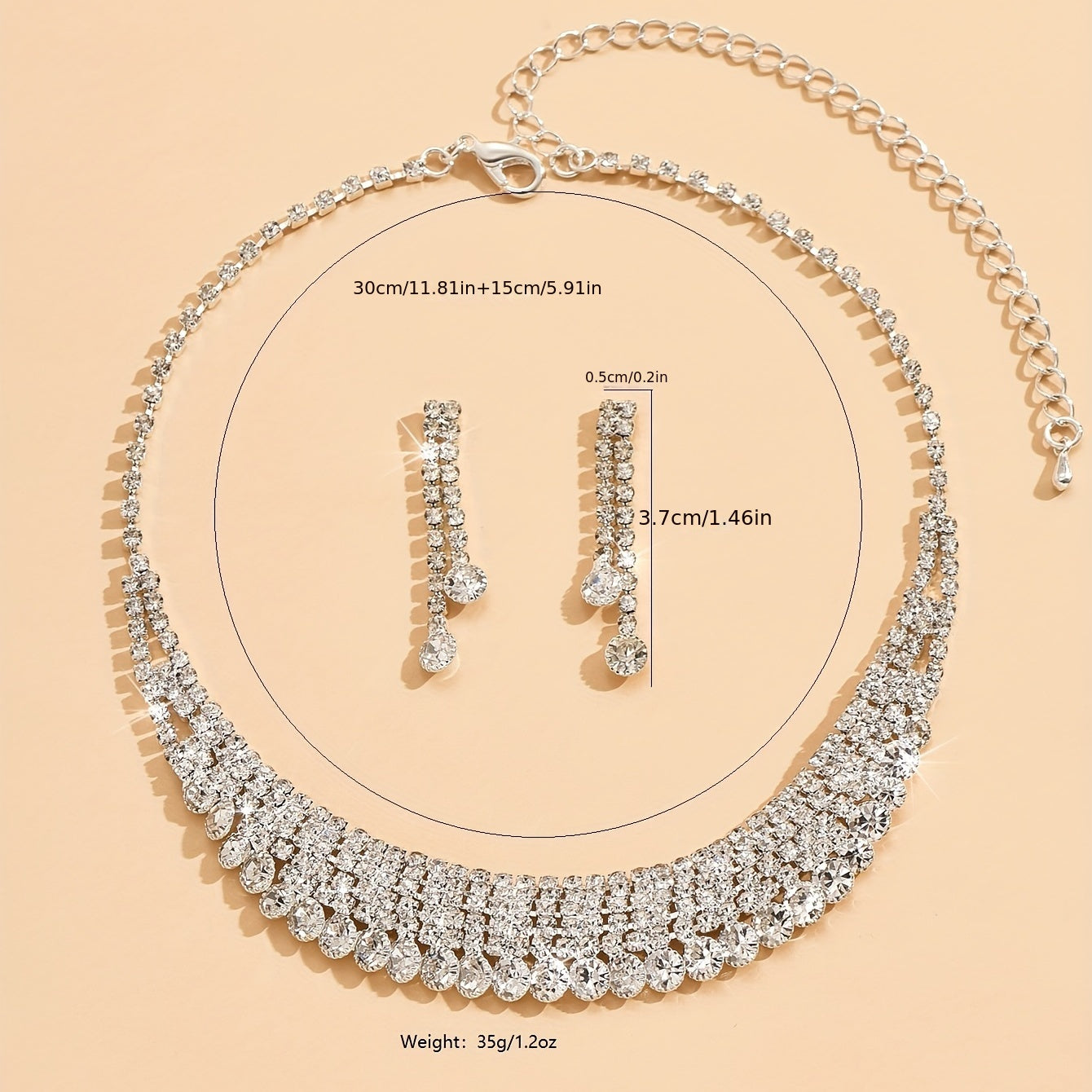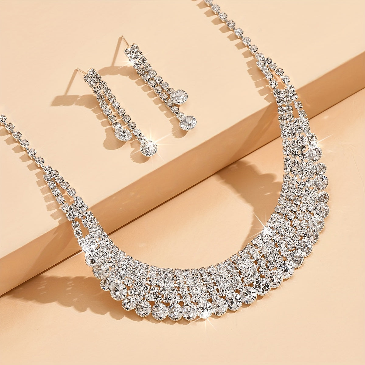 Complete your elegant look with this classic jewelry set. The set includes earrings and necklace with rhinestone inlay, perfect for engagements, weddings, parties, and more.