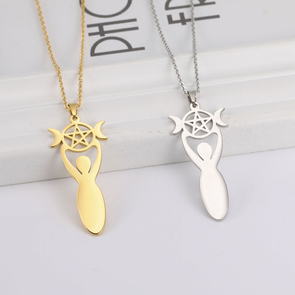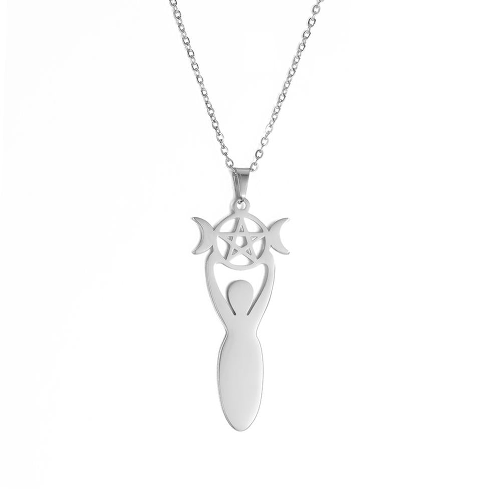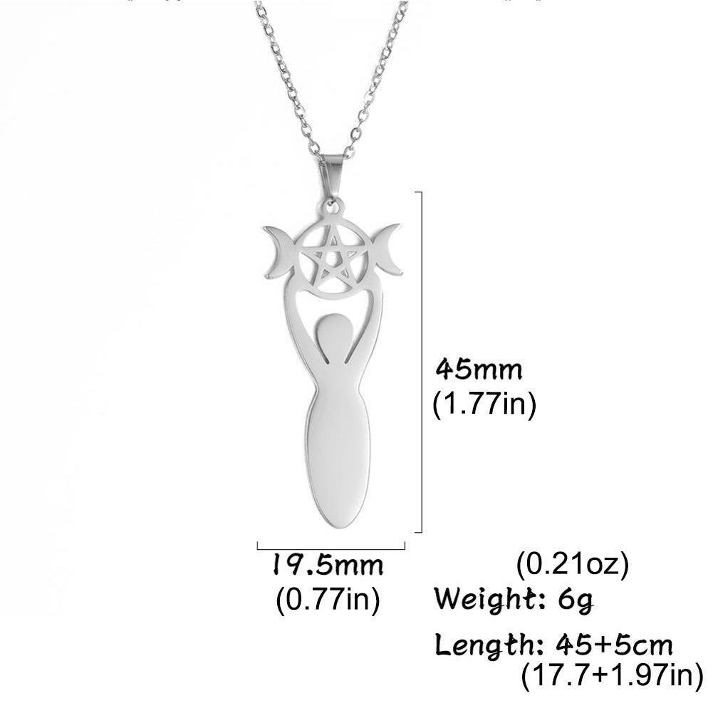 This men's stainless steel necklace features the Spiral Goddess of Fertility and Triple Moon Wiccan design. It is a unique vintage piece with a pentagram and crescent moon amulet. An ideal gift choice for those who appreciate mystical symbols.