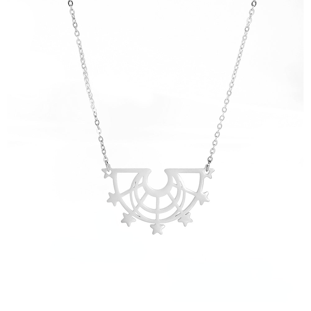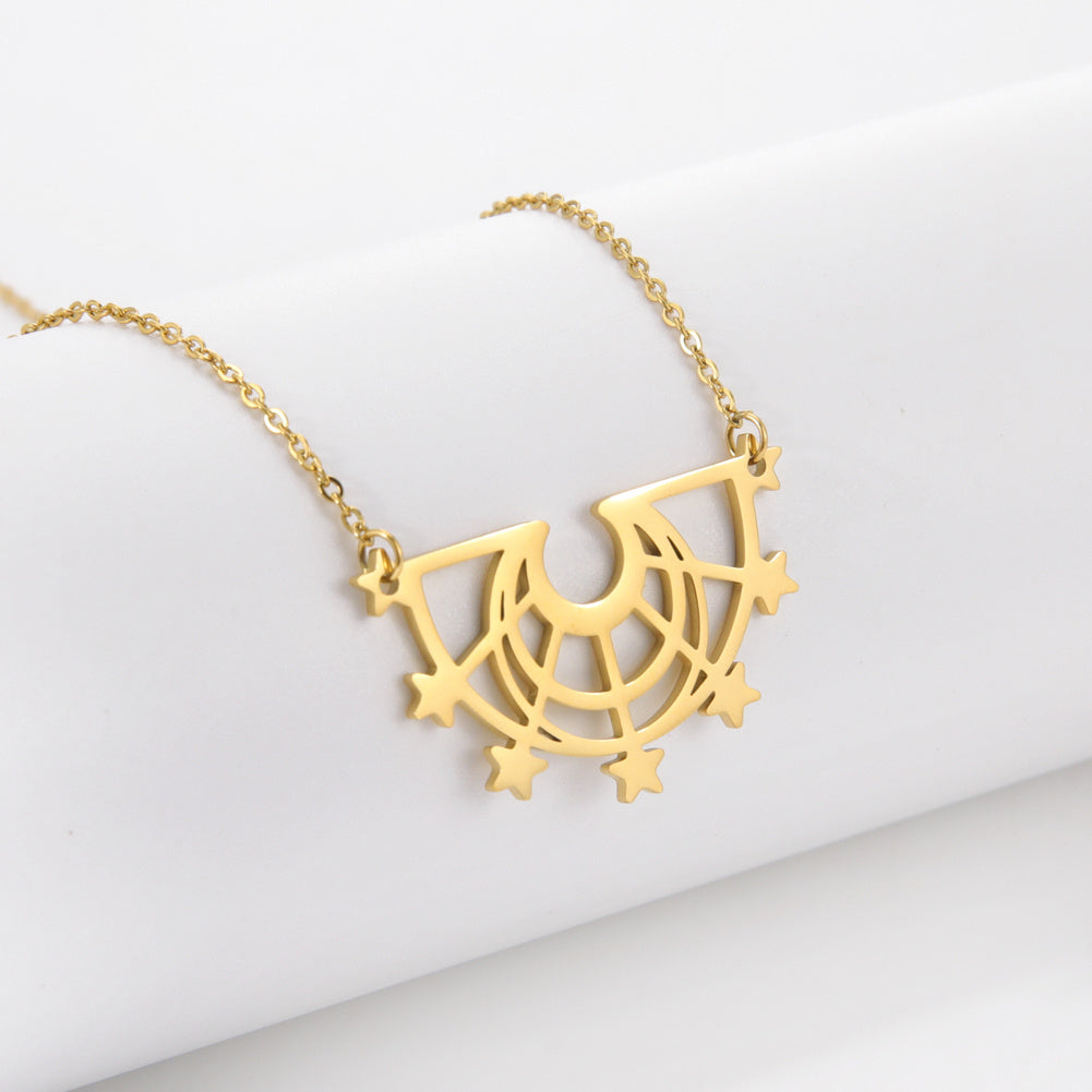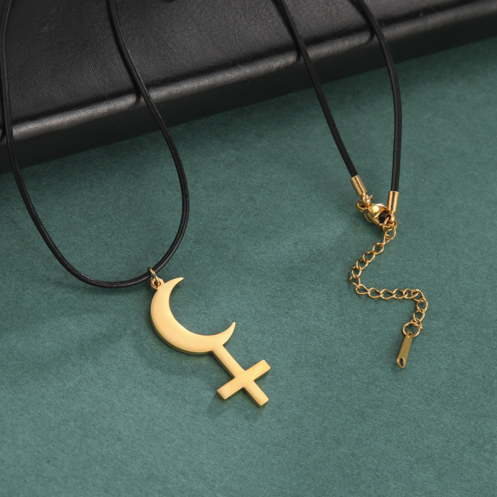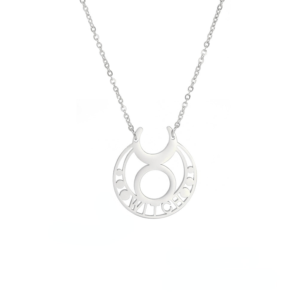 This men's stainless steel necklace features the Spiral Goddess of Fertility and Triple Moon Wiccan design. It is a unique vintage piece with a pentagram and crescent moon amulet. An ideal gift choice for those who appreciate mystical symbols.