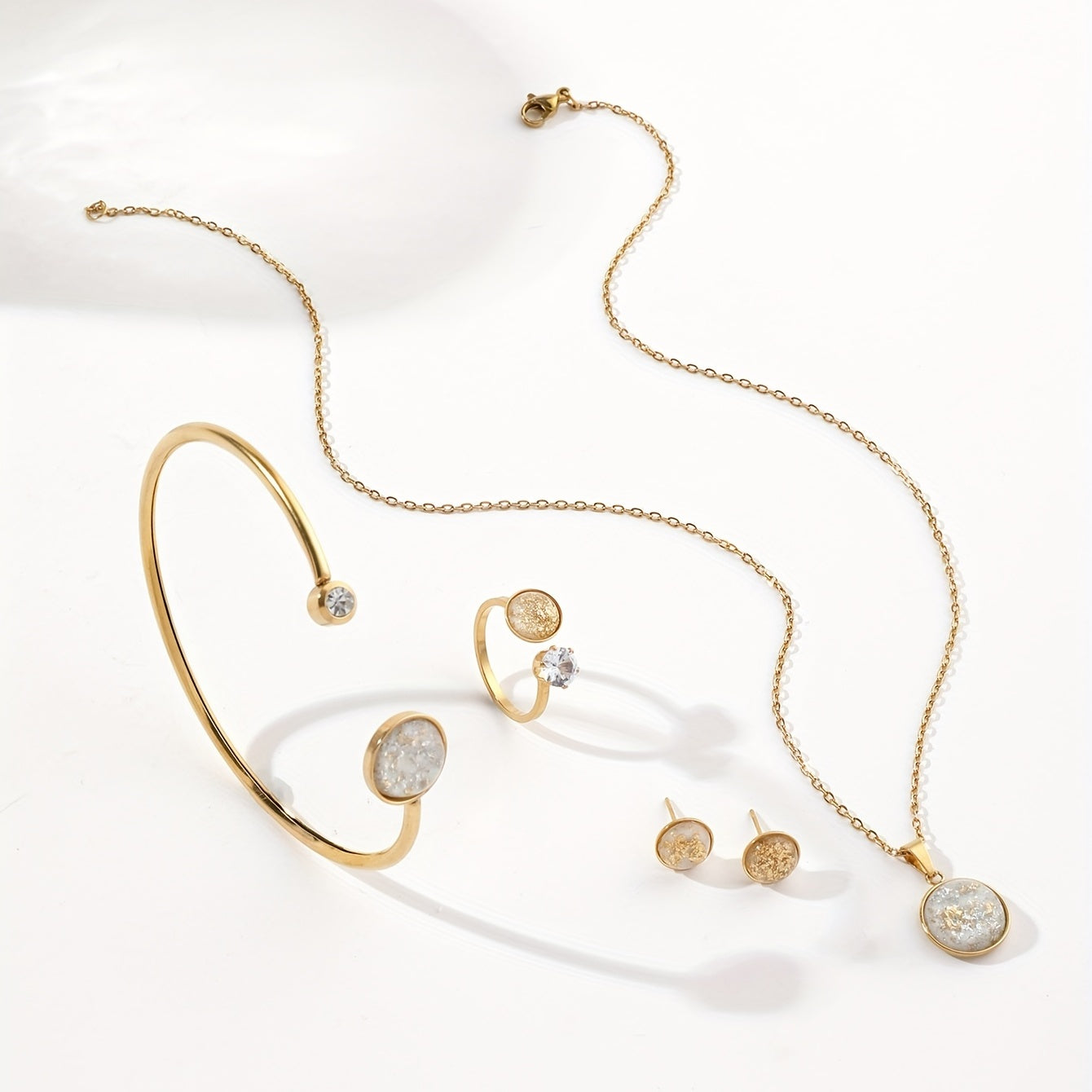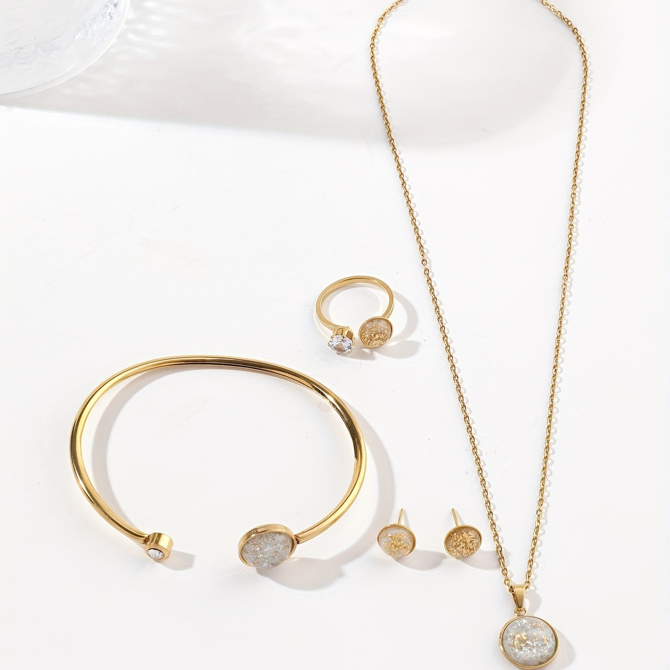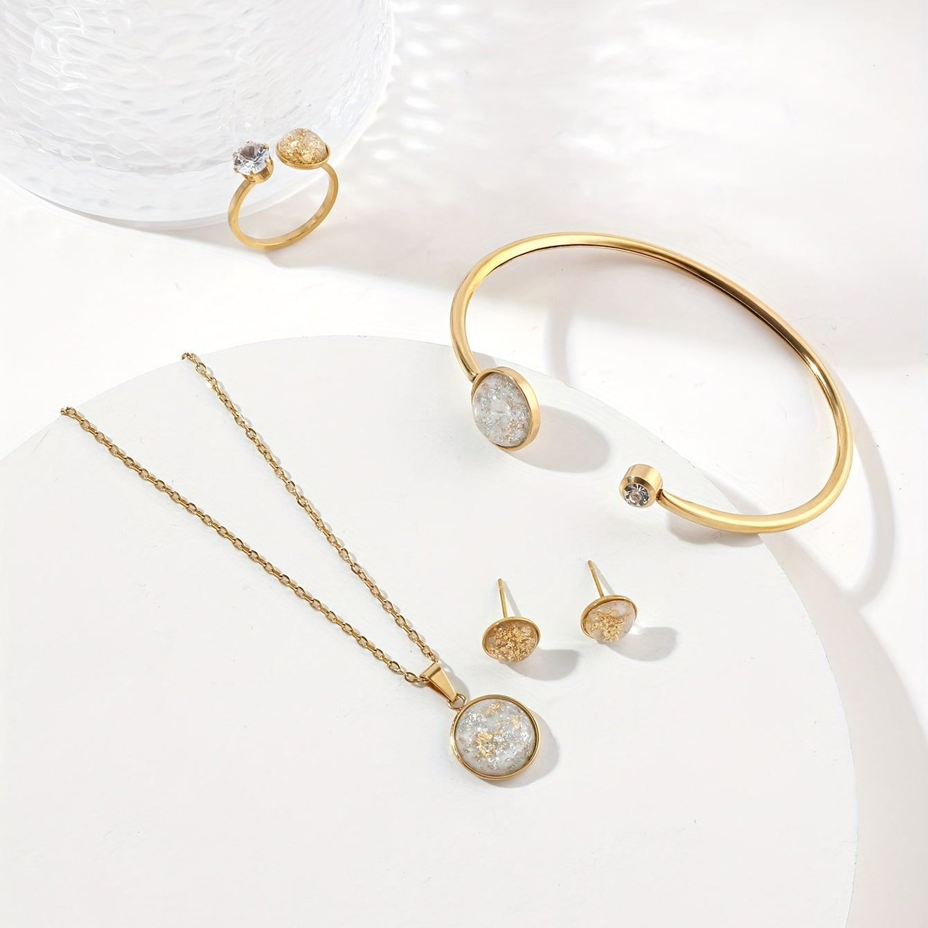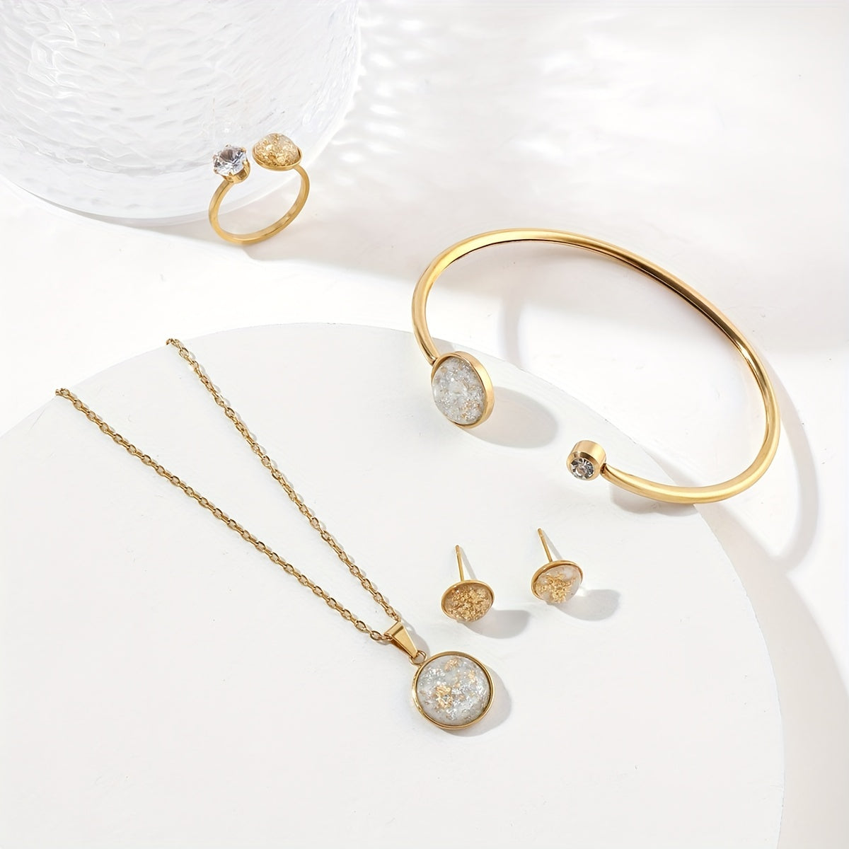 This 5-piece jewelry set includes a necklace, earrings, bracelet, and ring, all made of stainless steel with 18k gold plating and inlaid zircon. Perfect for daily wear, weddings, and parties.