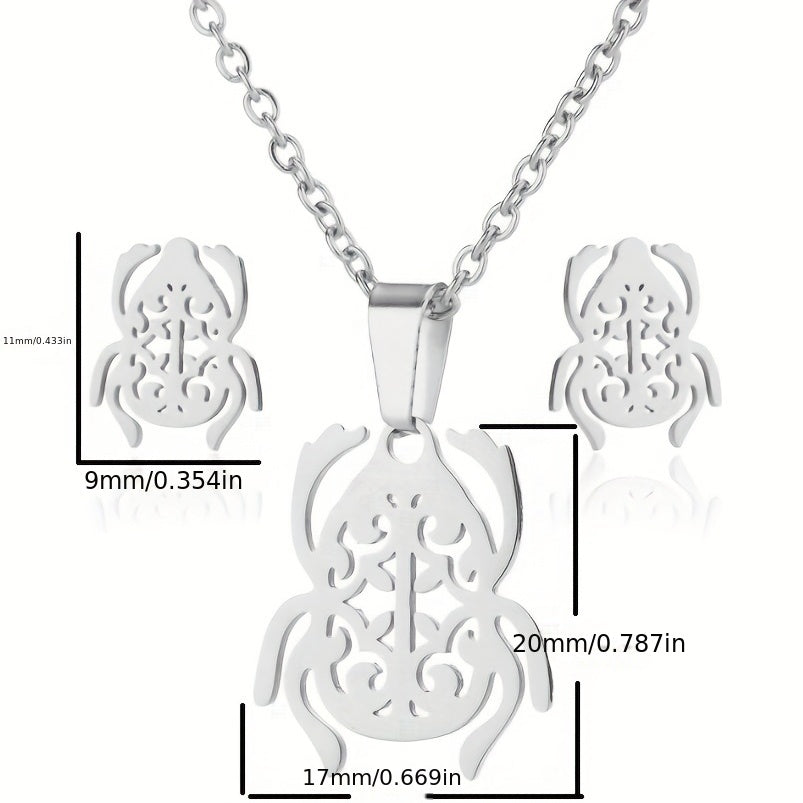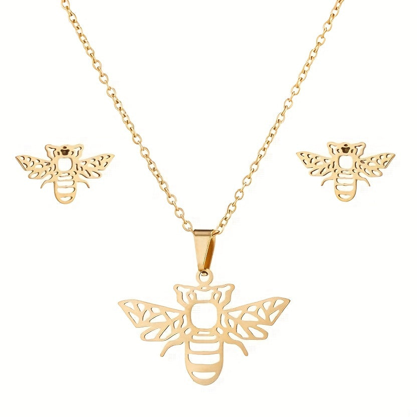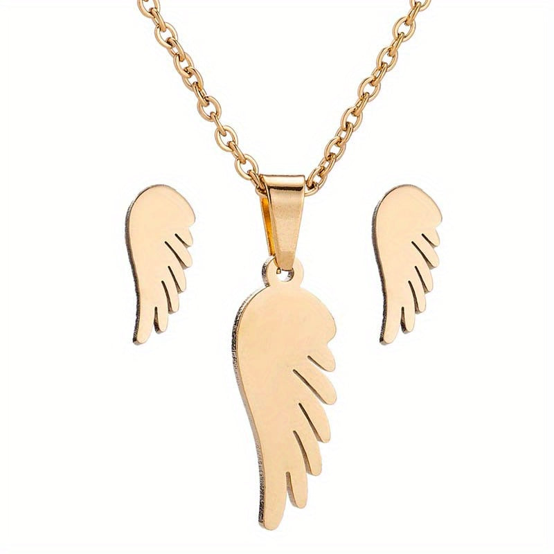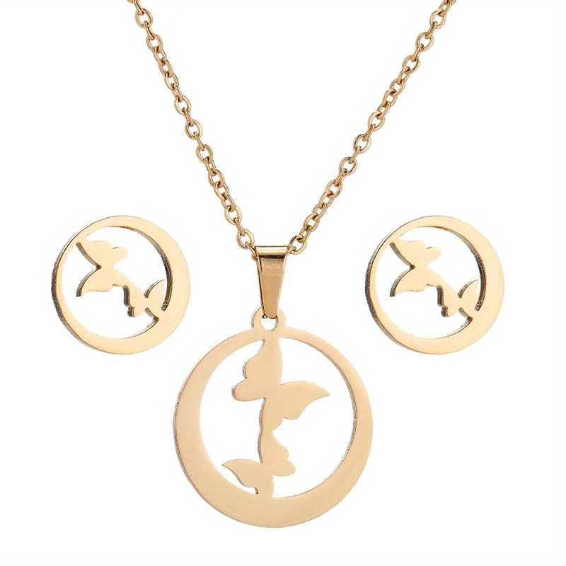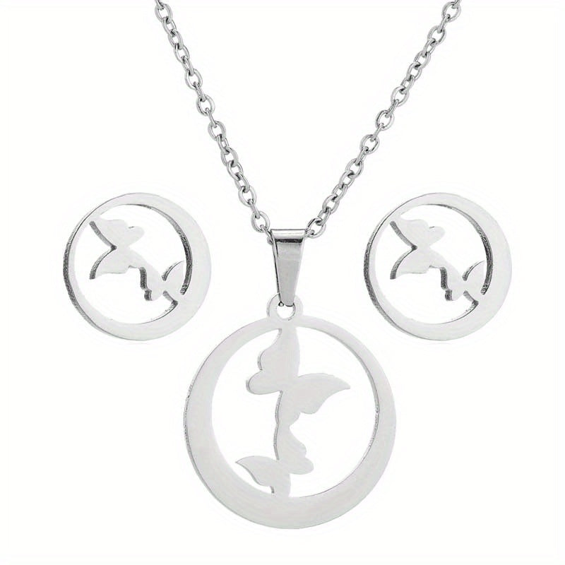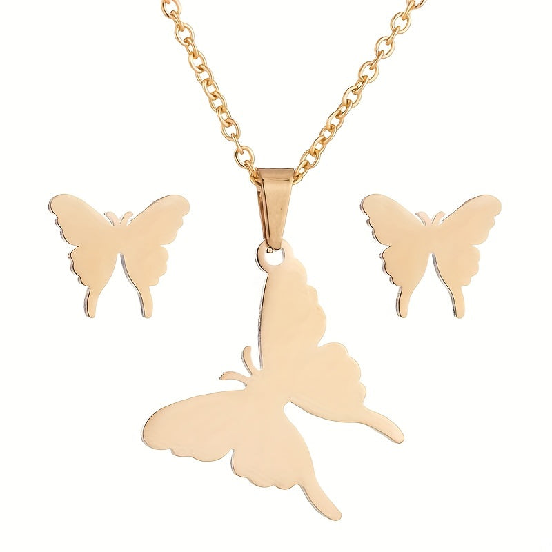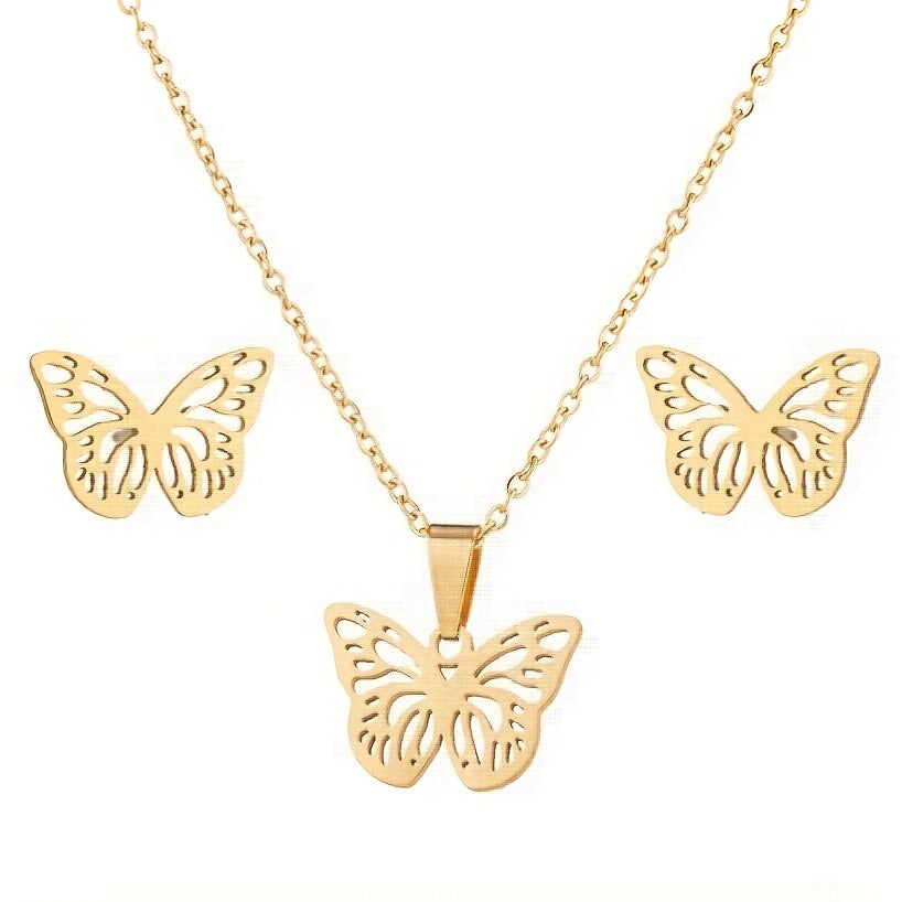 Elegant stainless steel jewelry set featuring butterfly pendant necklace and matching earrings. Perfect for adding a touch of nature-inspired beauty to your look.