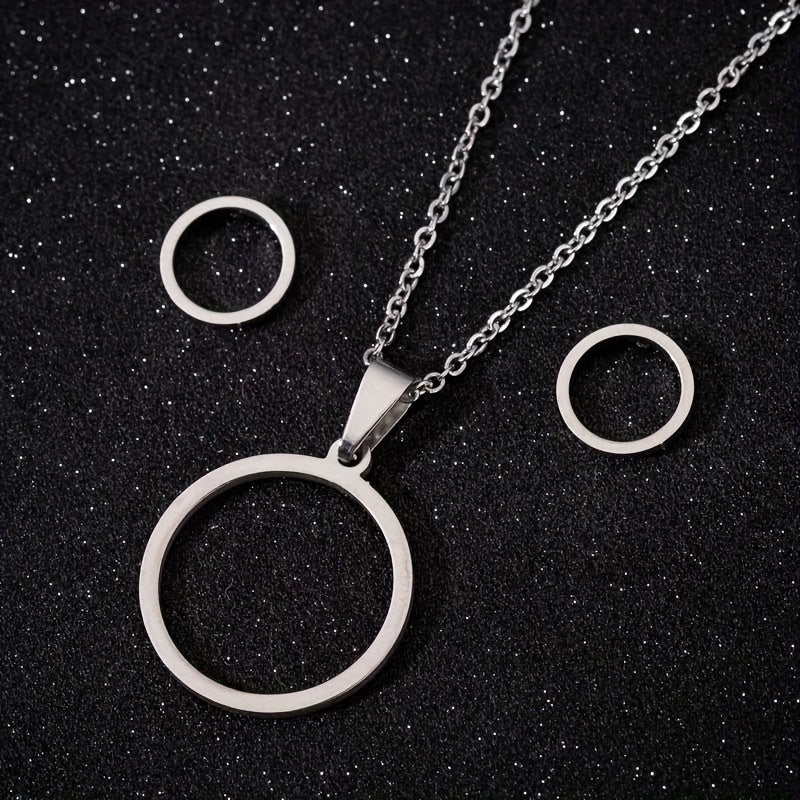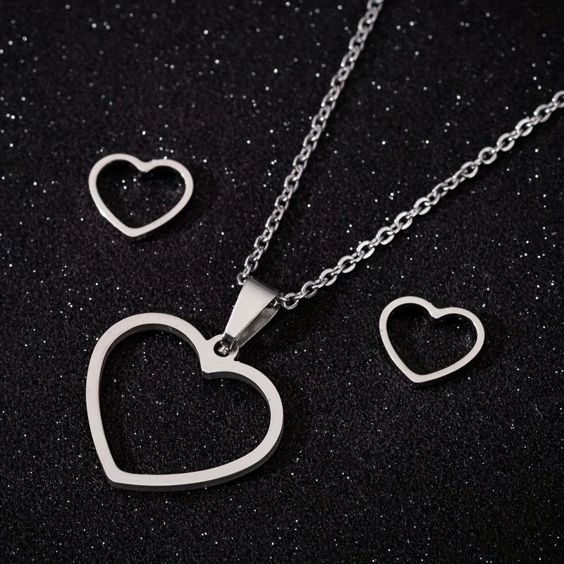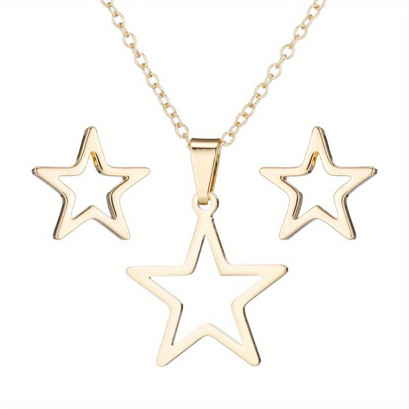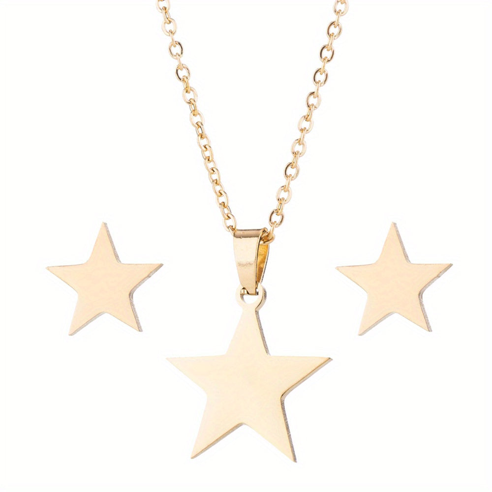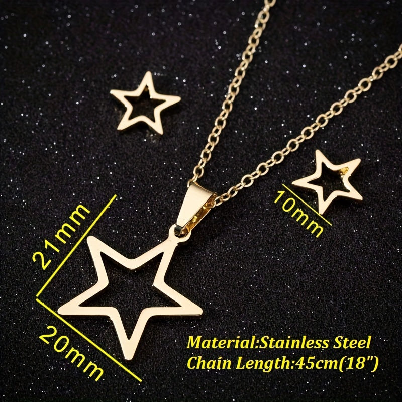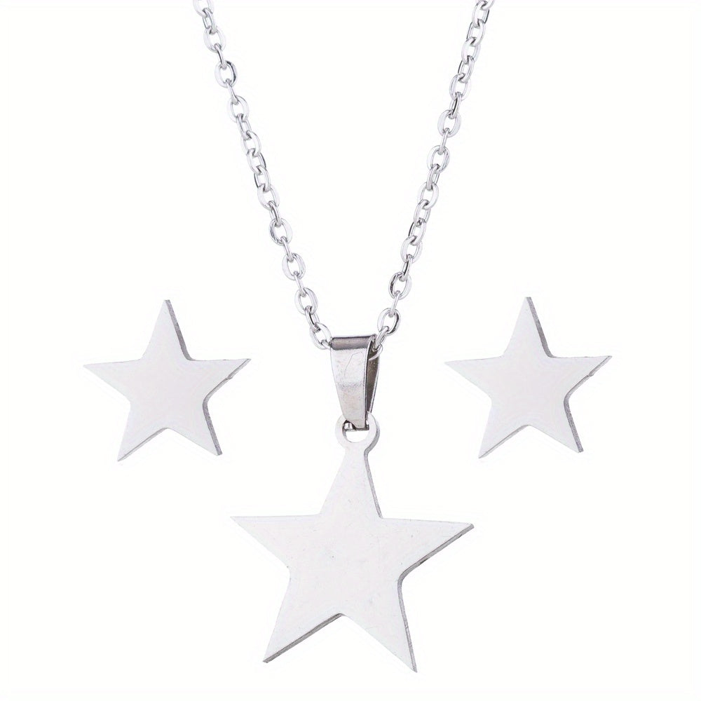 Enhance your style with this exquisite stainless steel geometric jewelry set featuring moon, stars, love, and cross design. This set includes a necklace and earrings to elevate your look.