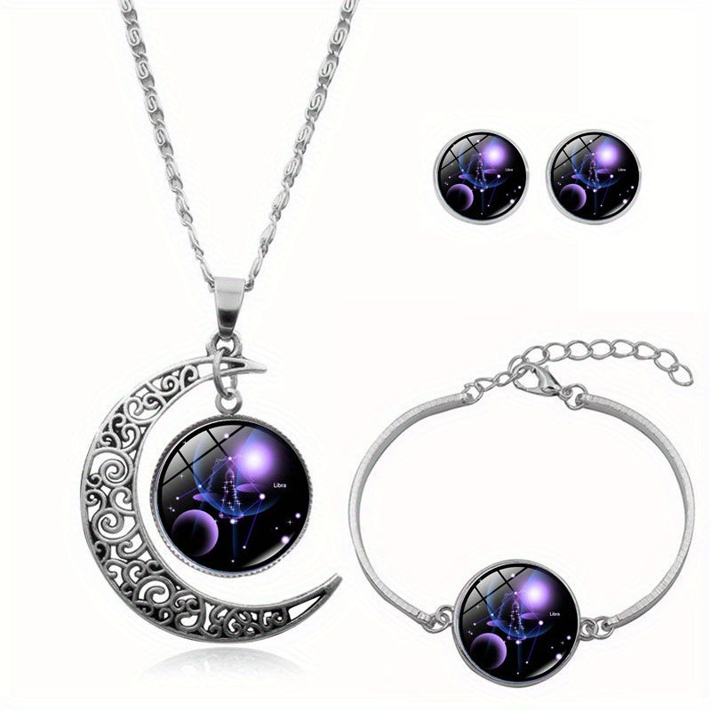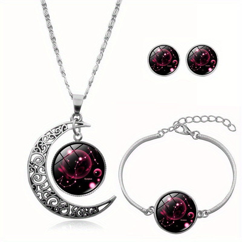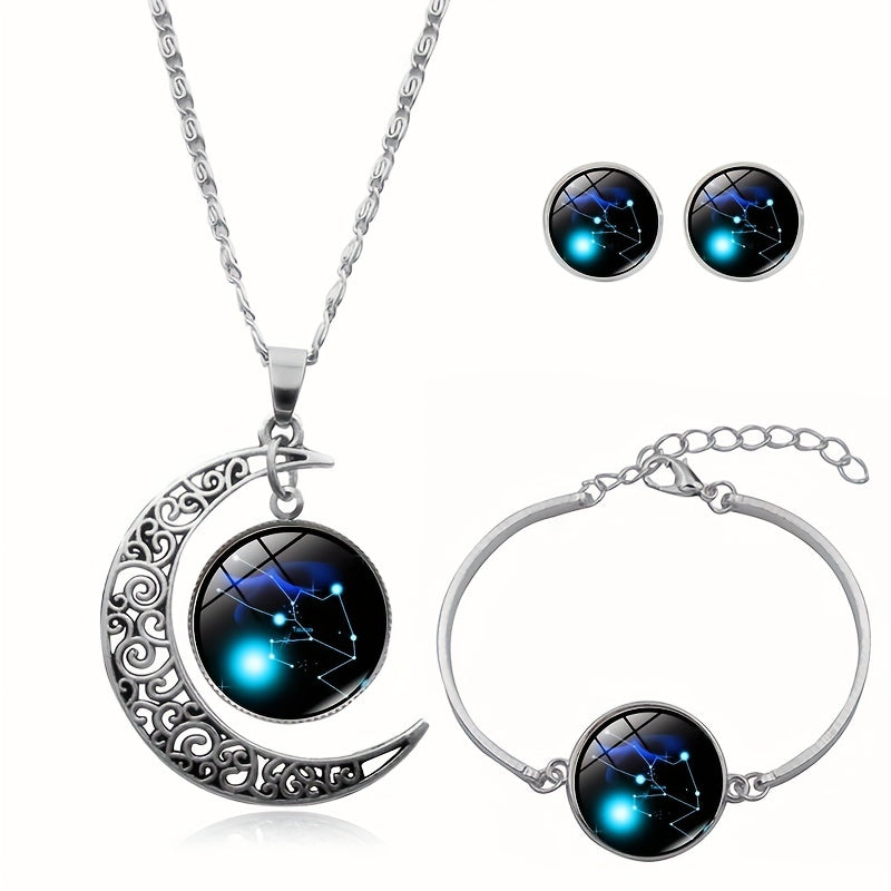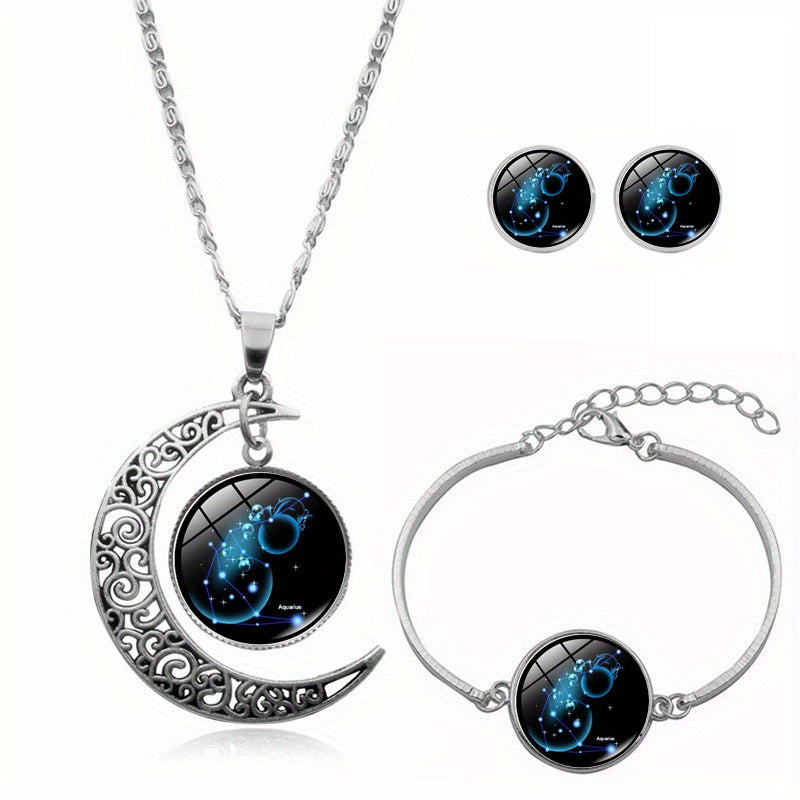 Elegant 3-piece stainless steel jewelry set featuring zodiac design. Includes necklace, bracelet, and earrings studs for men.