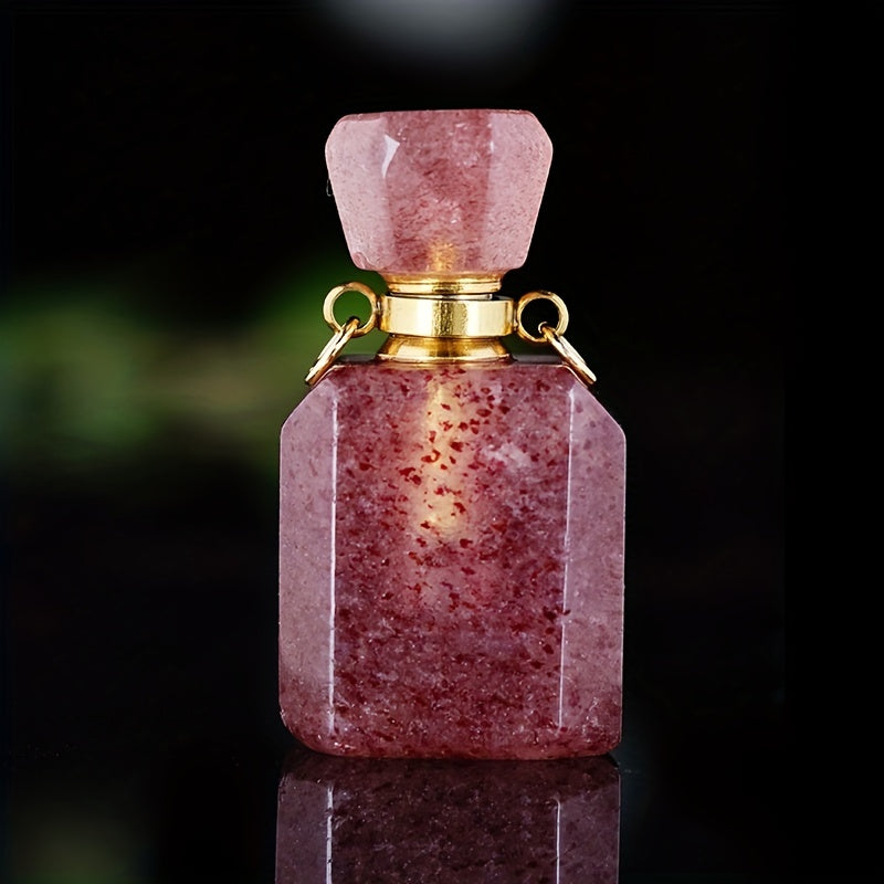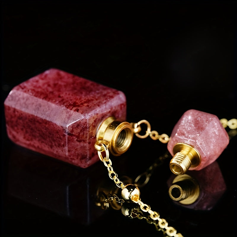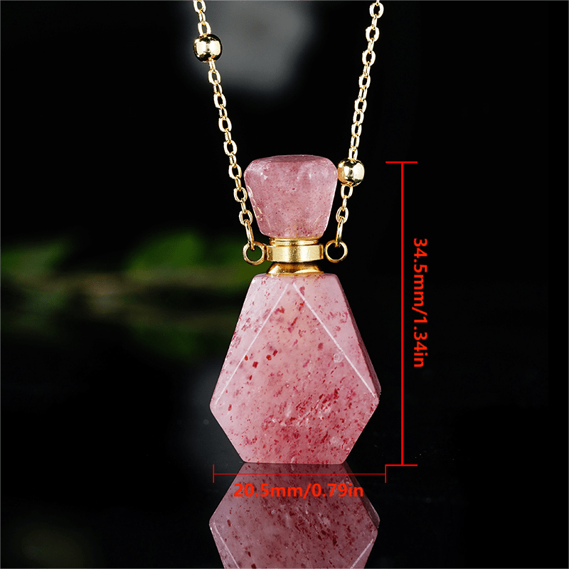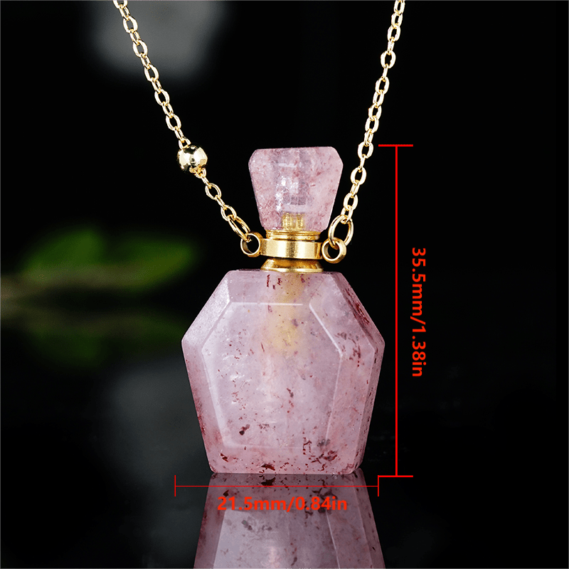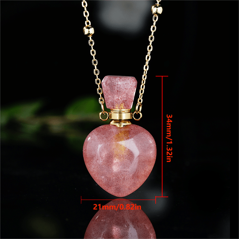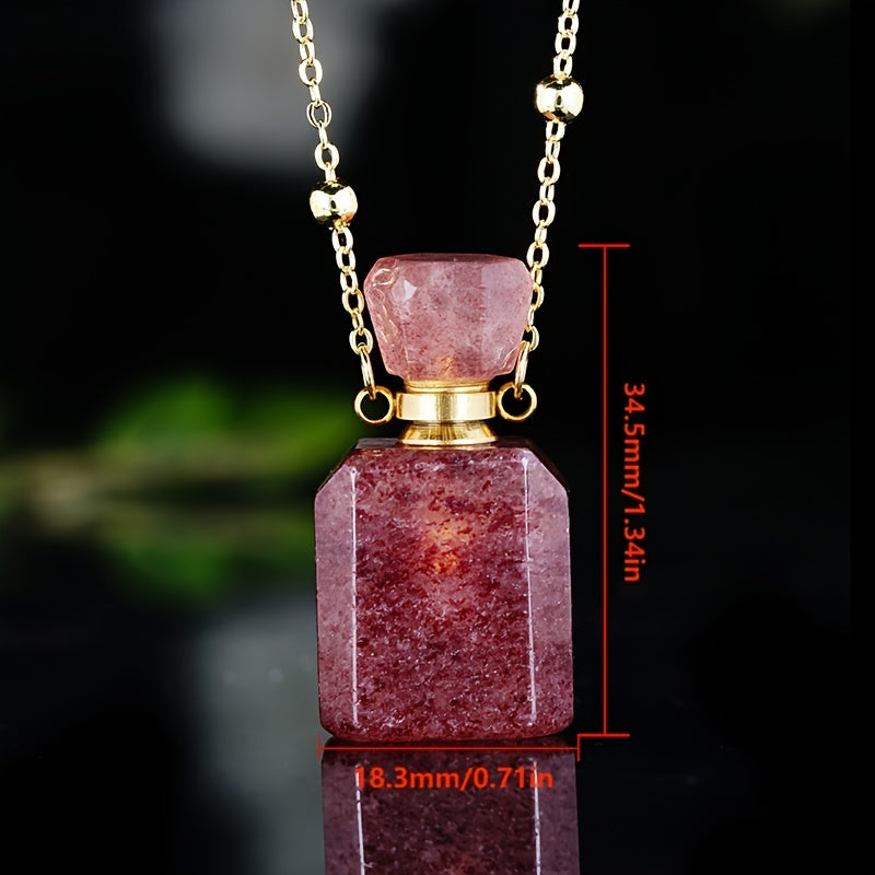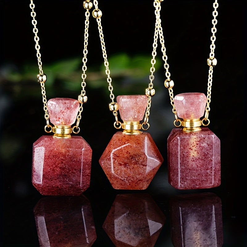 This delicate jewelry piece features a natural strawberry crystal perfume bottle on a copper necklace, adding a touch of elegance to your outfit.