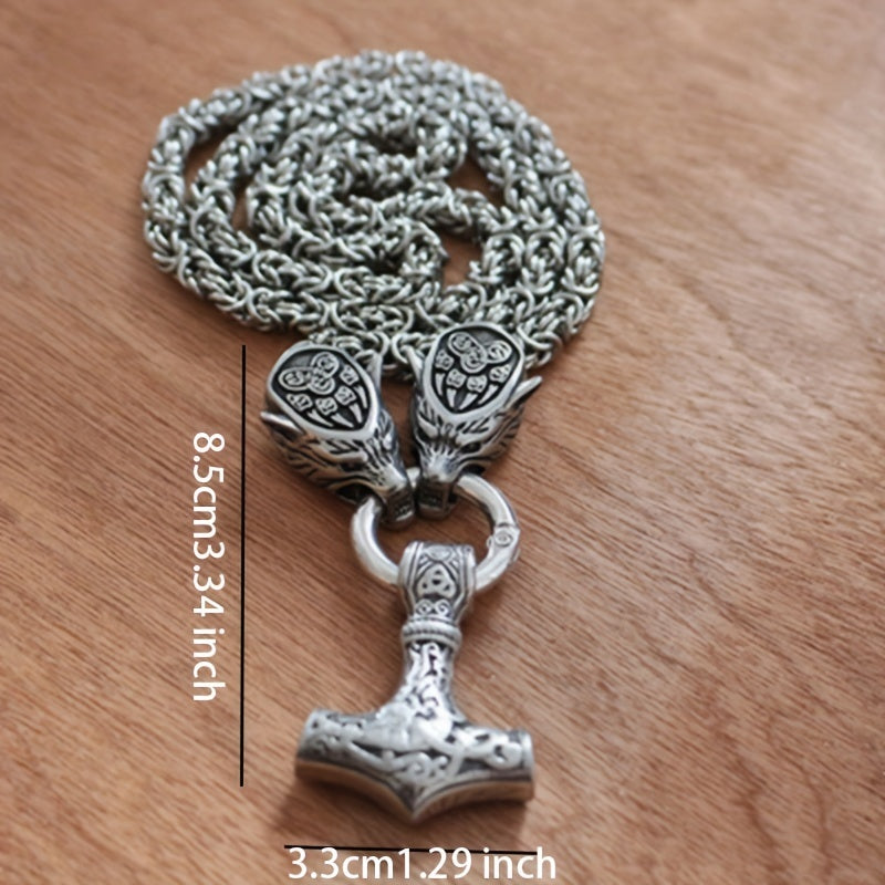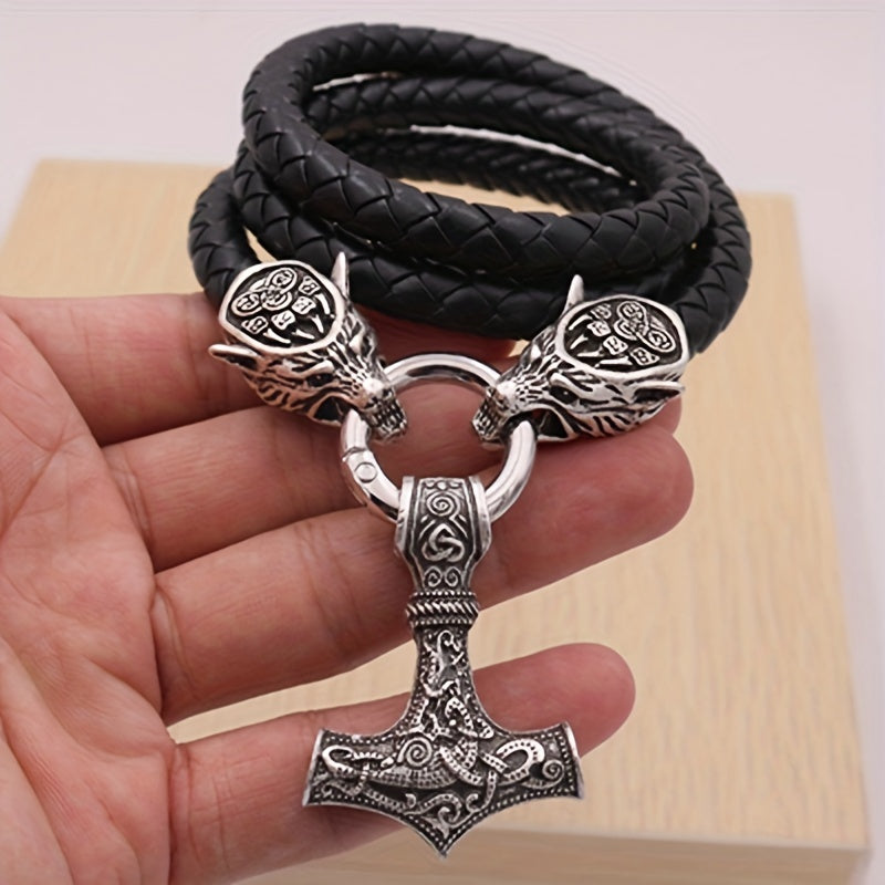 This pendant necklace features Thor's Hammer with a wolf head design, perfect for those who love punk Viking style. It is made of high-quality zinc alloy and comes with a leather rope chain.