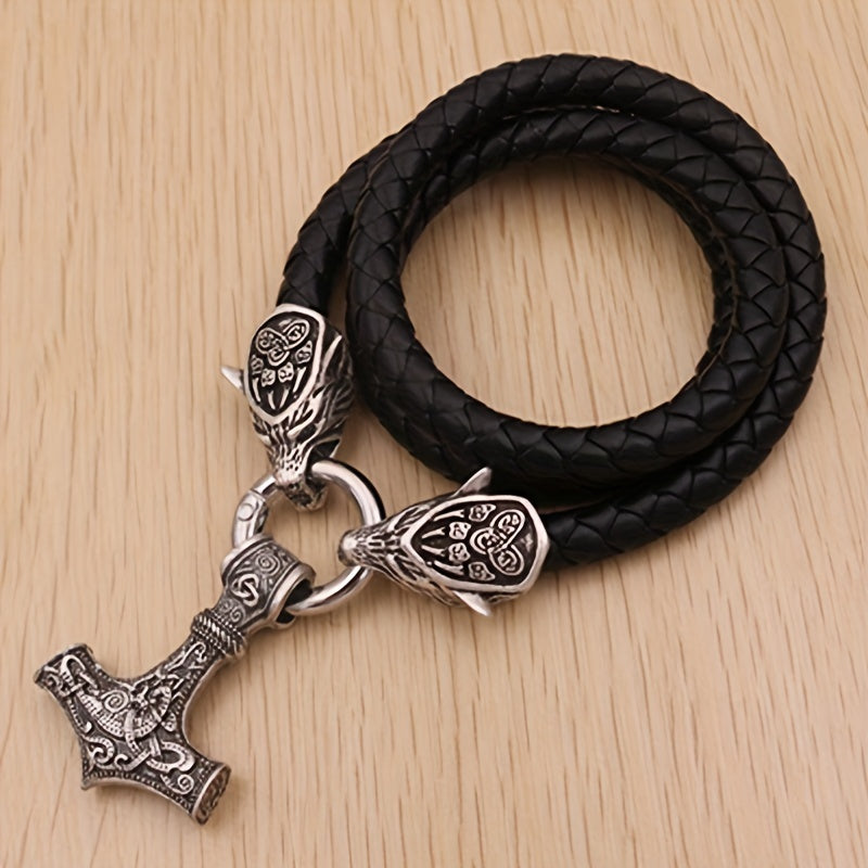 Thor's Hammer Pendant Necklace Antique Wolf Head Leather Rope Chain