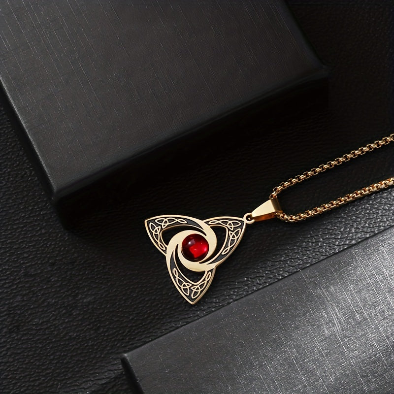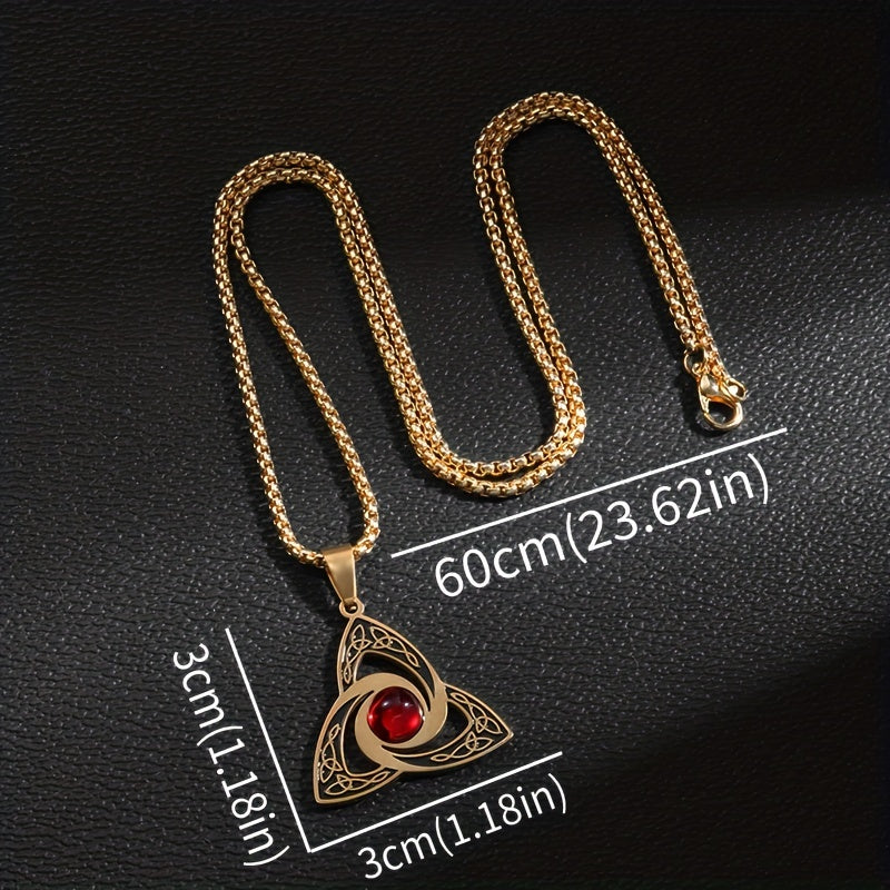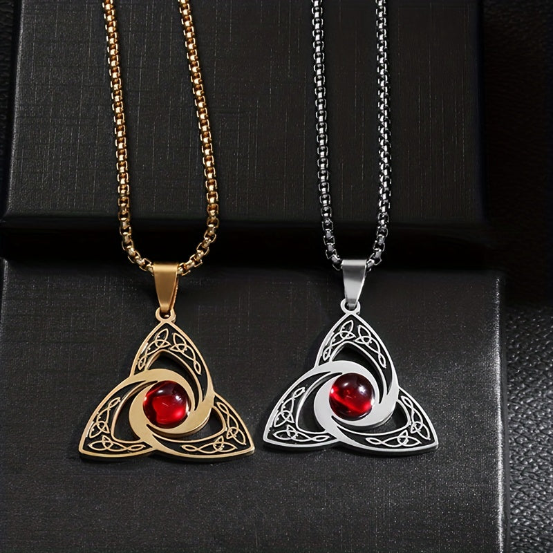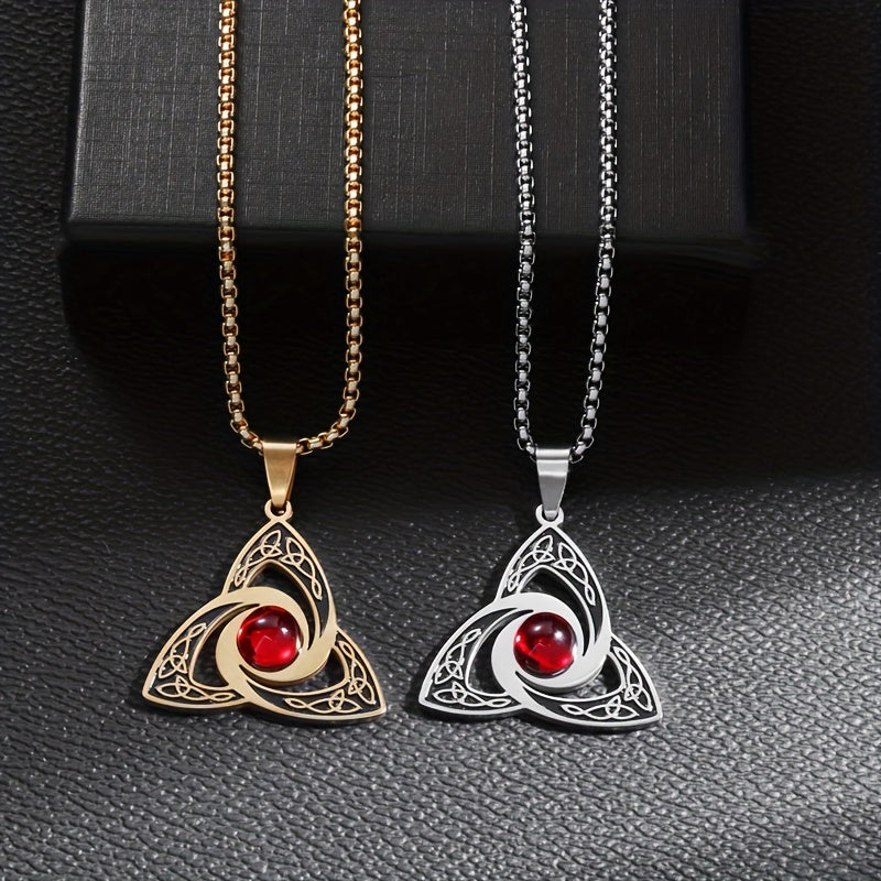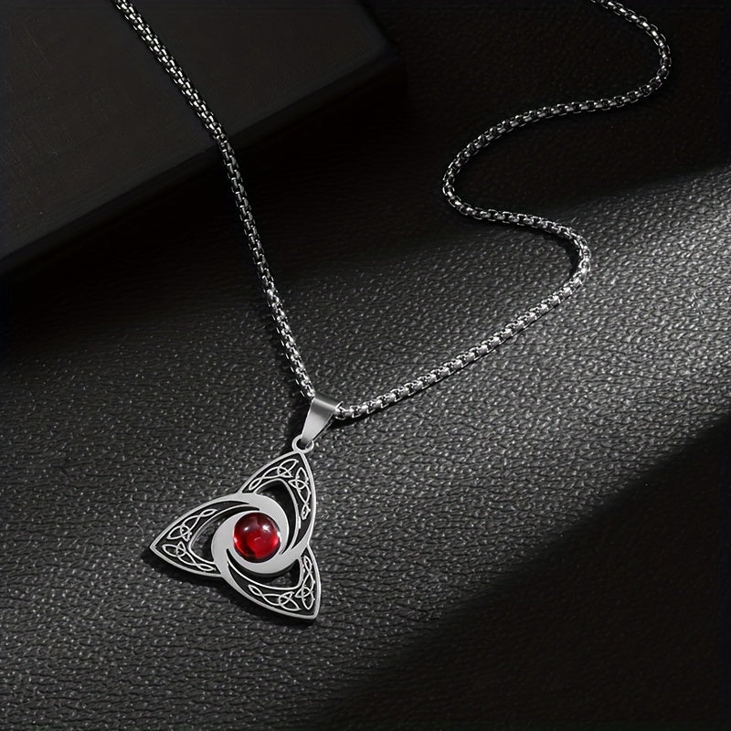 Elegant stainless steel necklace featuring a red zirconium pendant with a witch knot design. Perfect gift for both men and women.