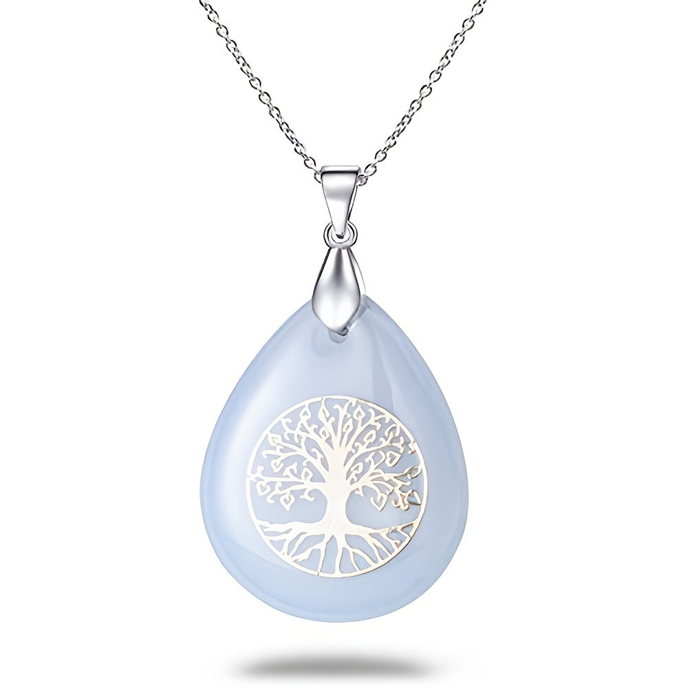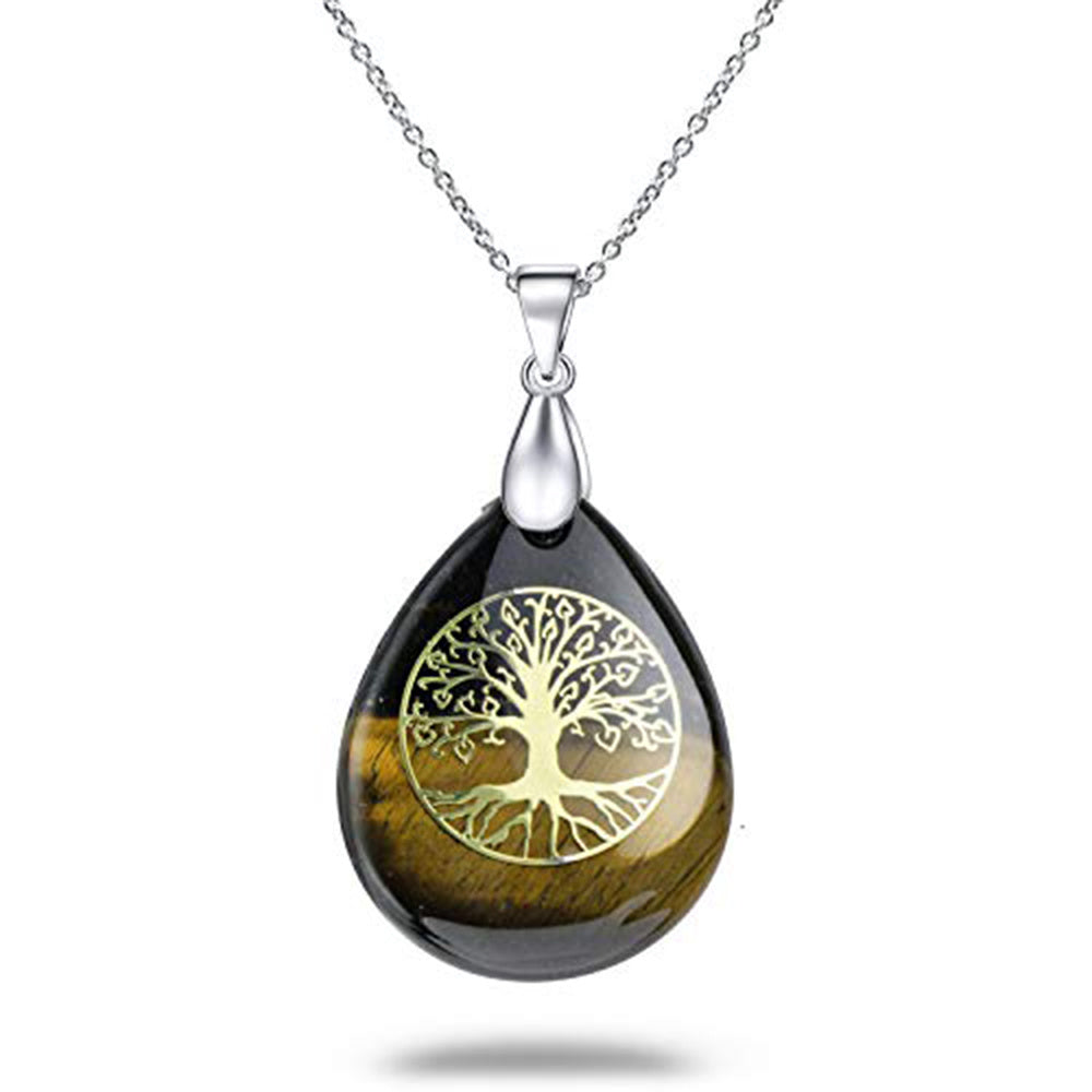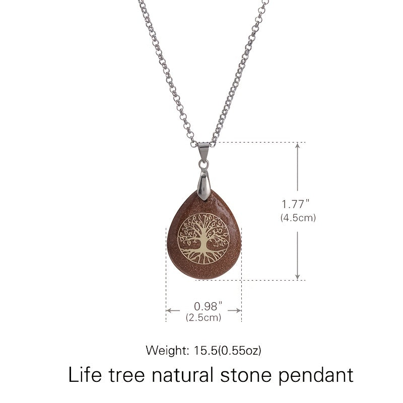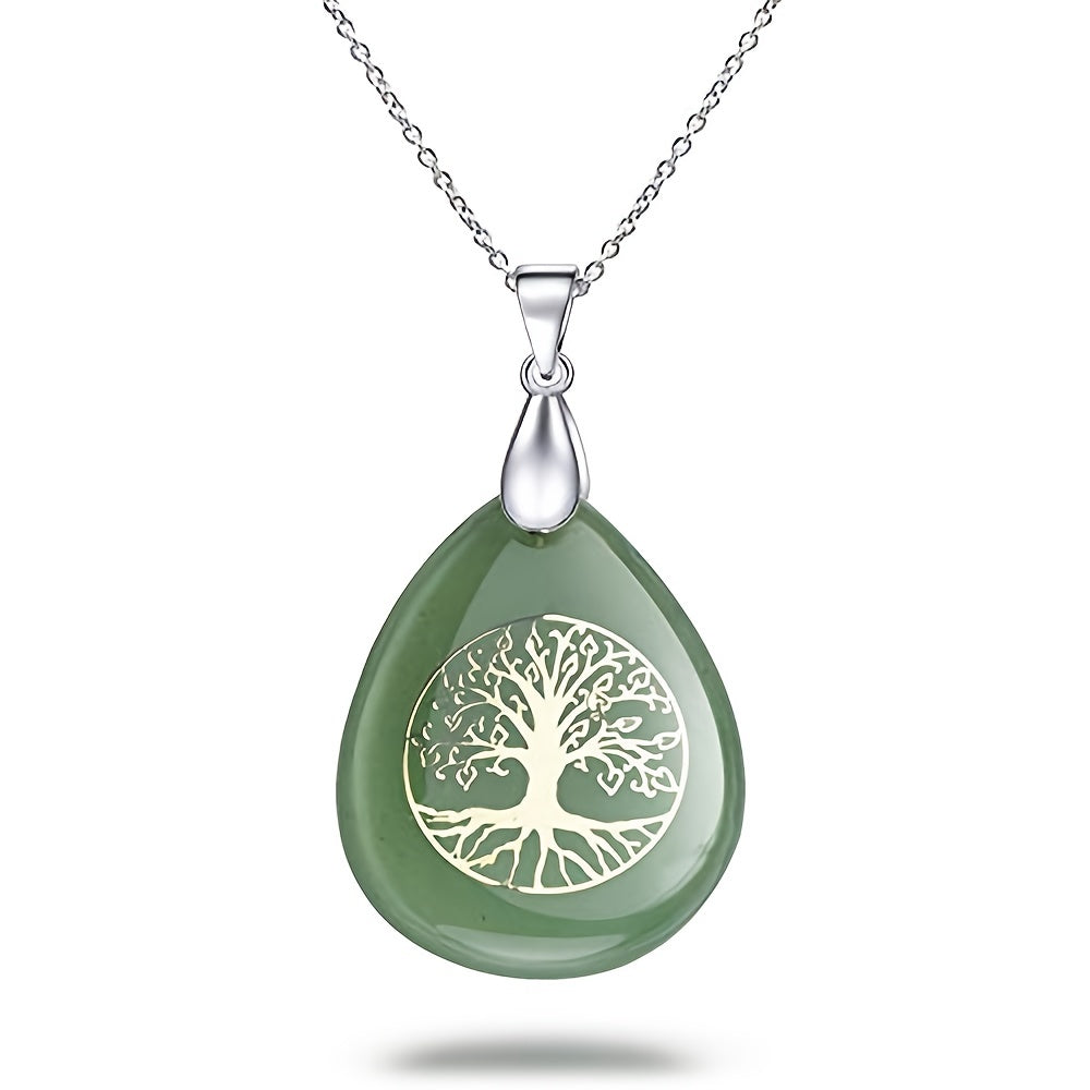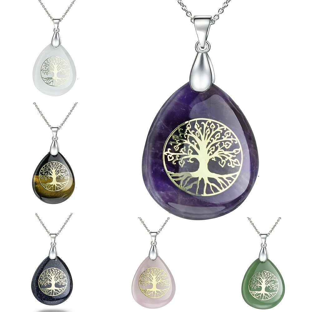 Beautiful Tree of Life necklace featuring a teardrop shaped crystal stone pendant, perfect for healing and spiritual energy.
