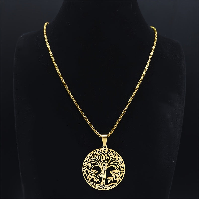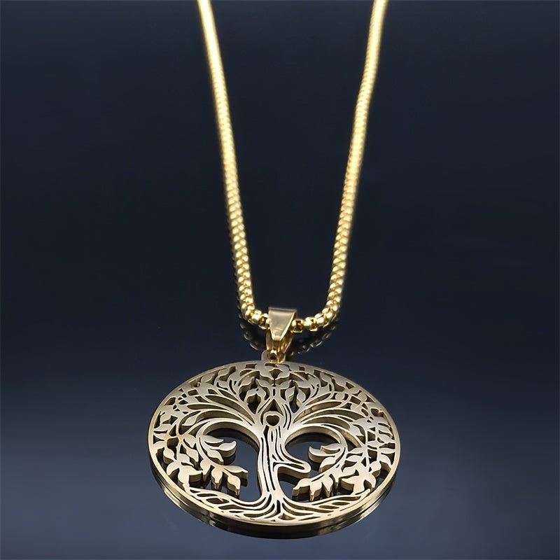 This stunning necklace features a large Tree of Life shape pendant on a golden stainless steel chain. It makes a perfect gift for women and comes beautifully packaged in a box.