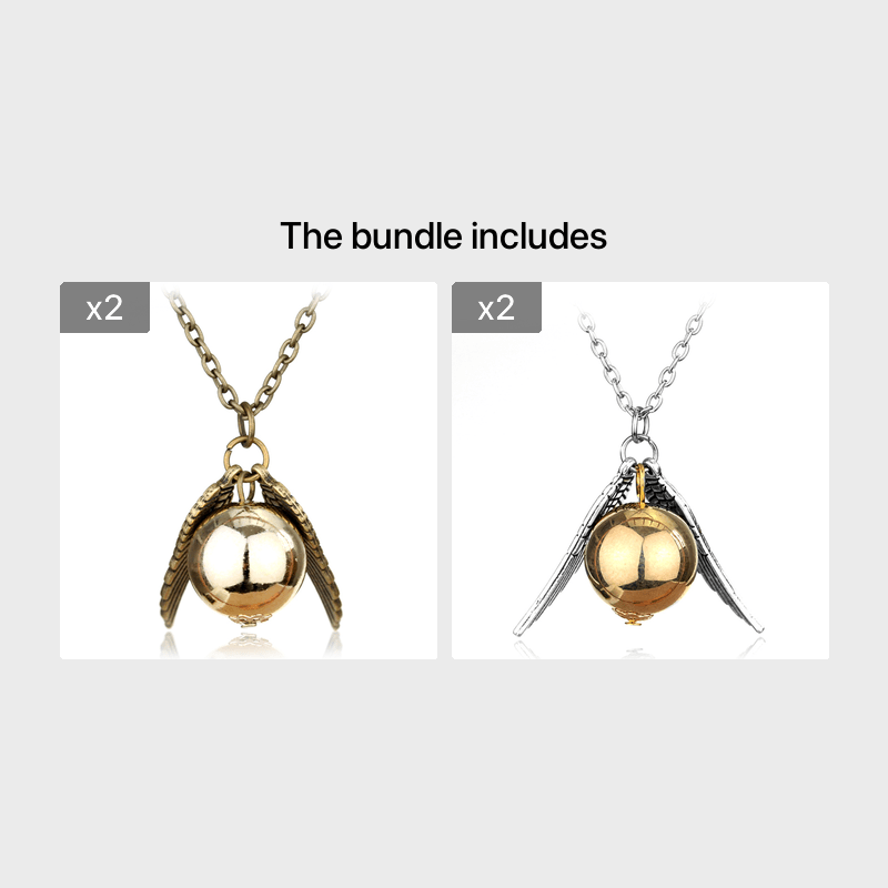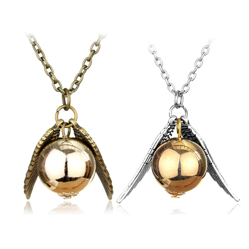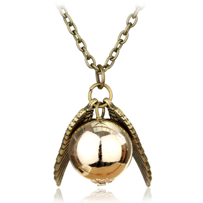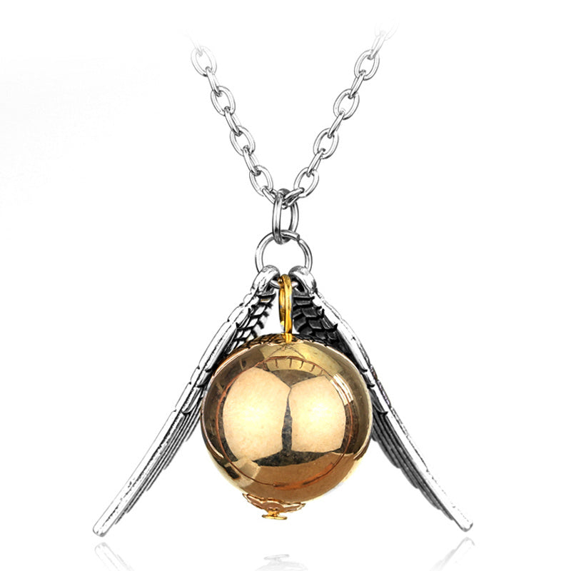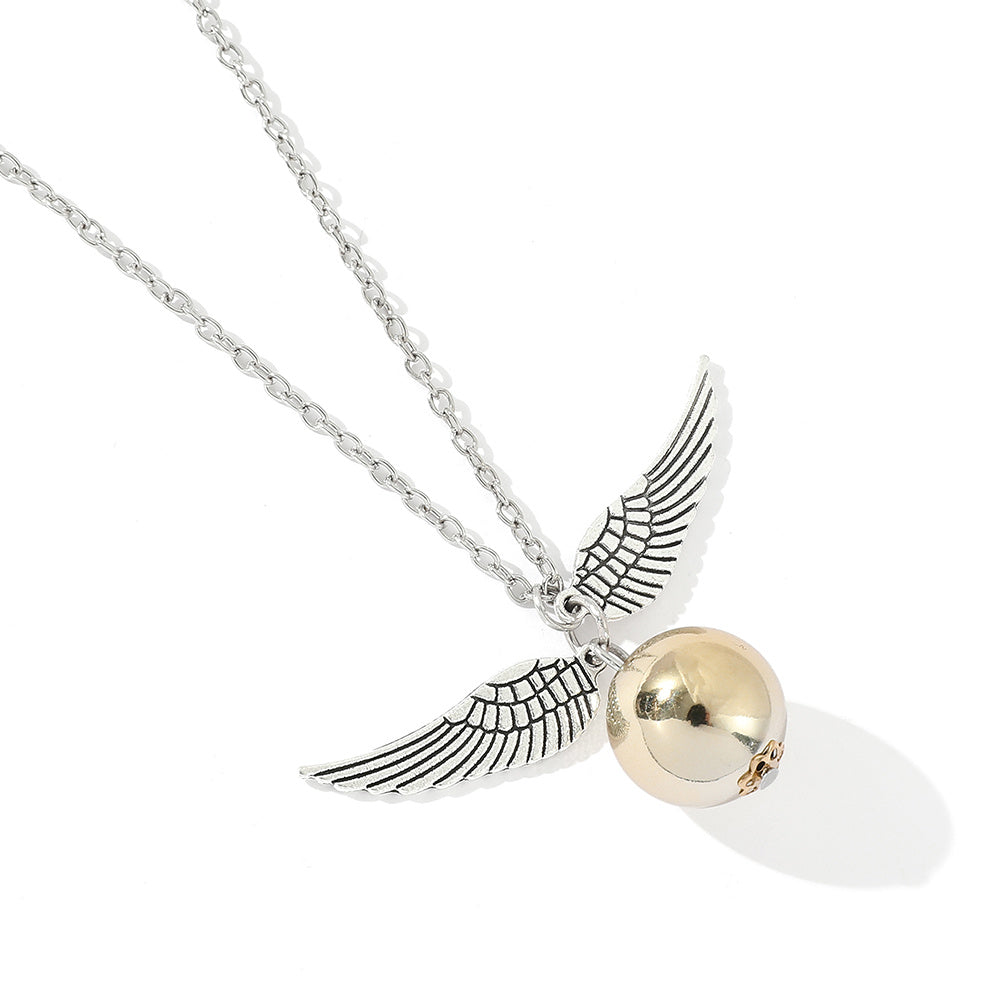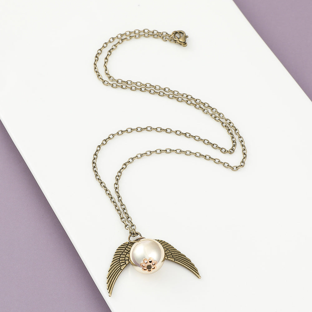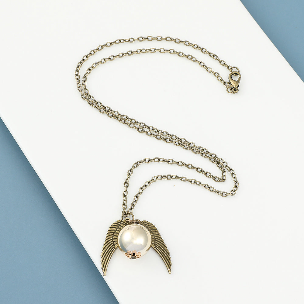 Add a touch of magic to your style with this vintage college inspired necklace featuring a golden snitch with feather wings design.
