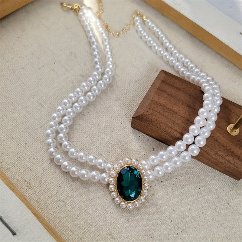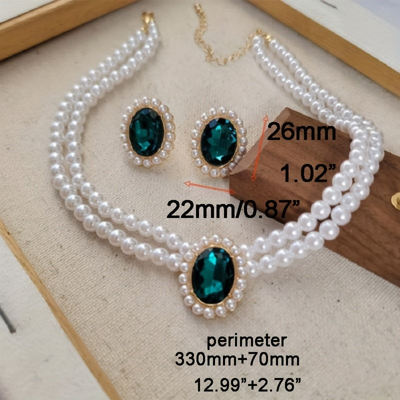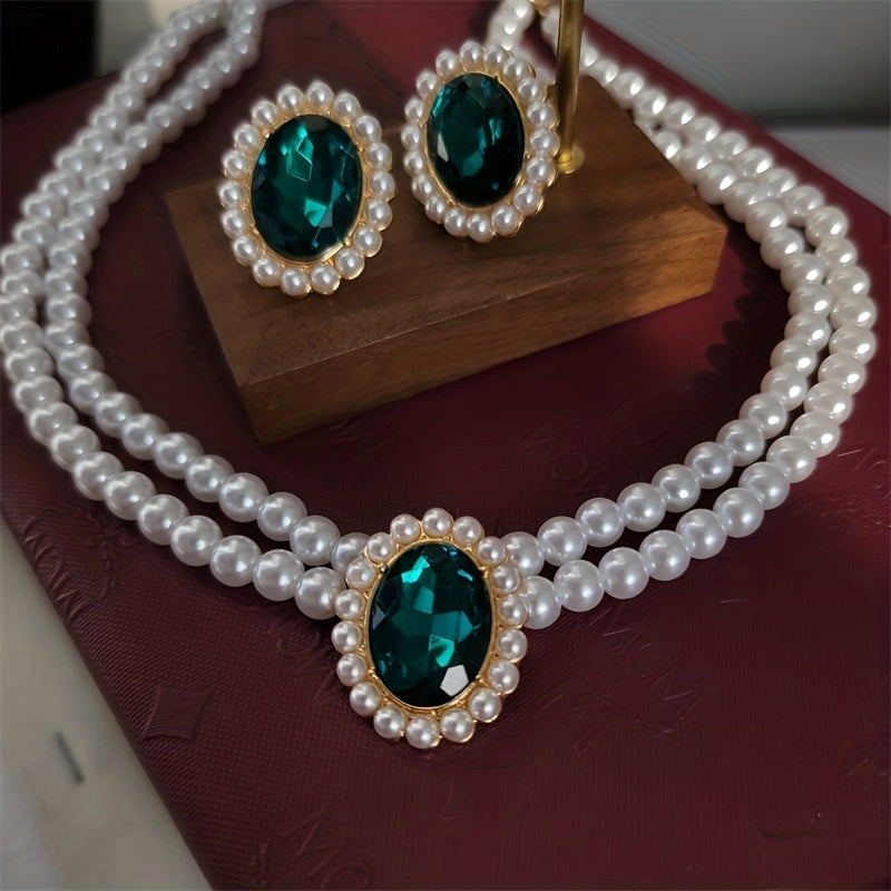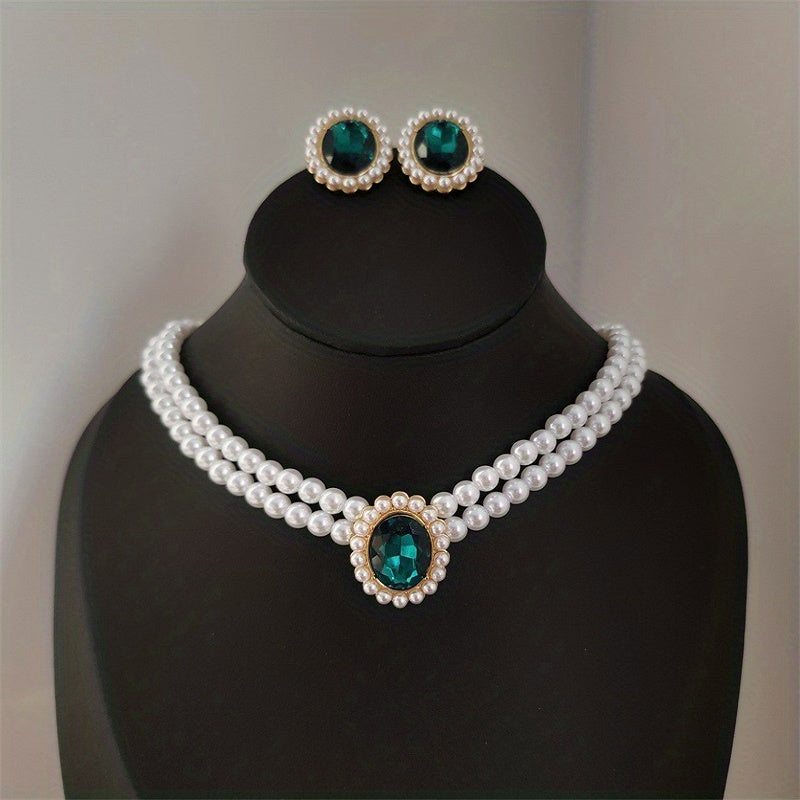 Add a touch of vintage charm to your look with this faux pearl jewelry set. The set includes a double clavicle chain with an emerald necklace and matching earrings.