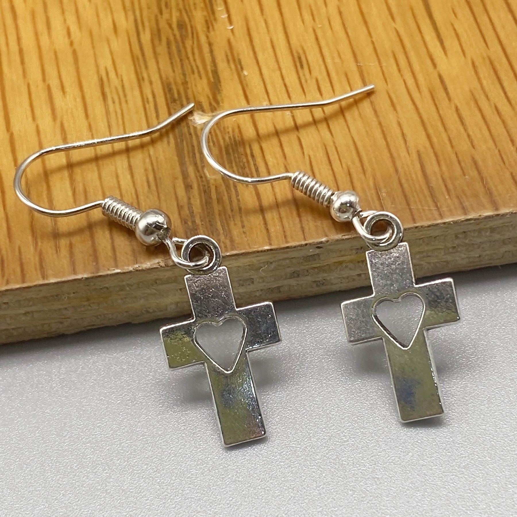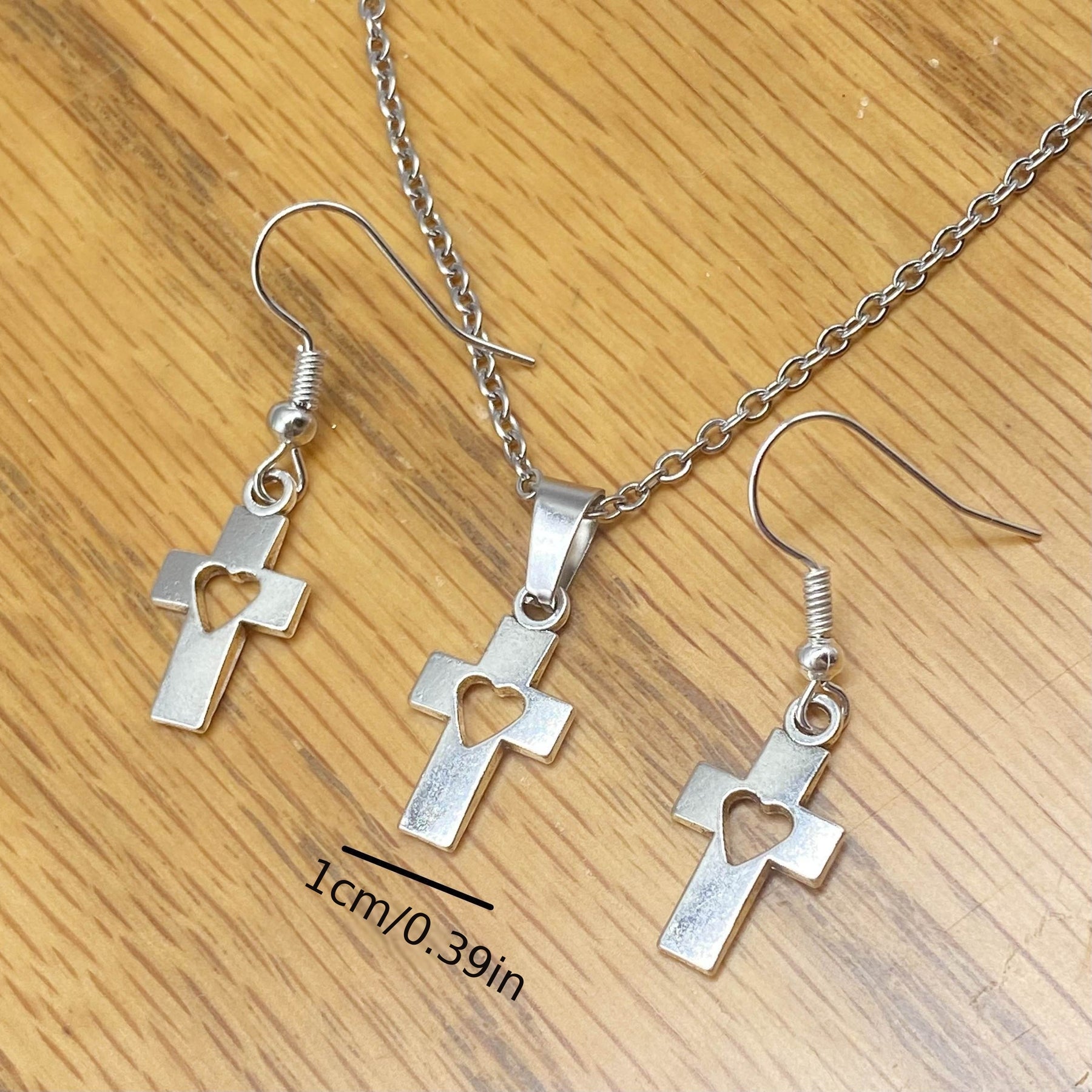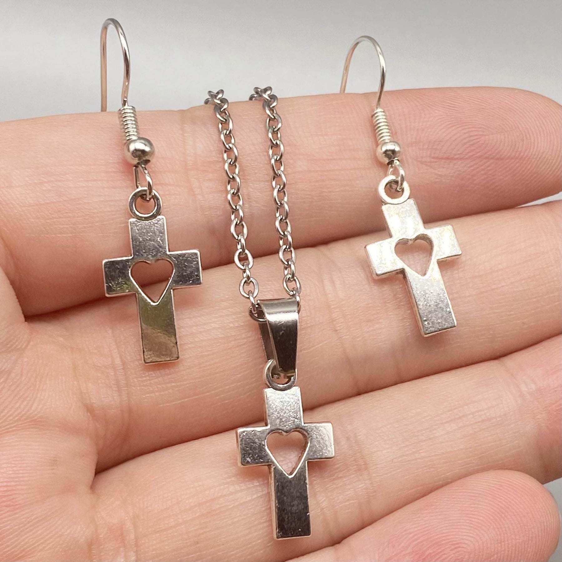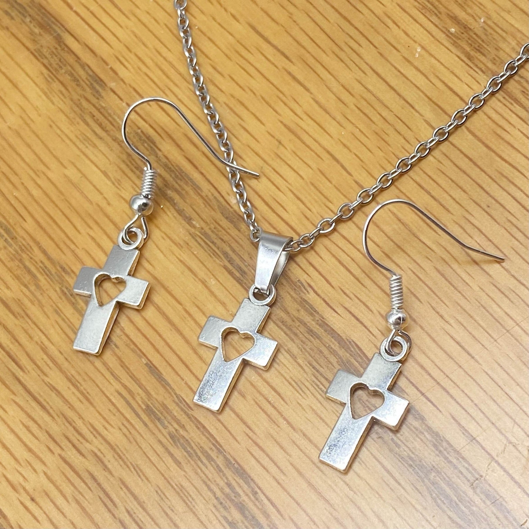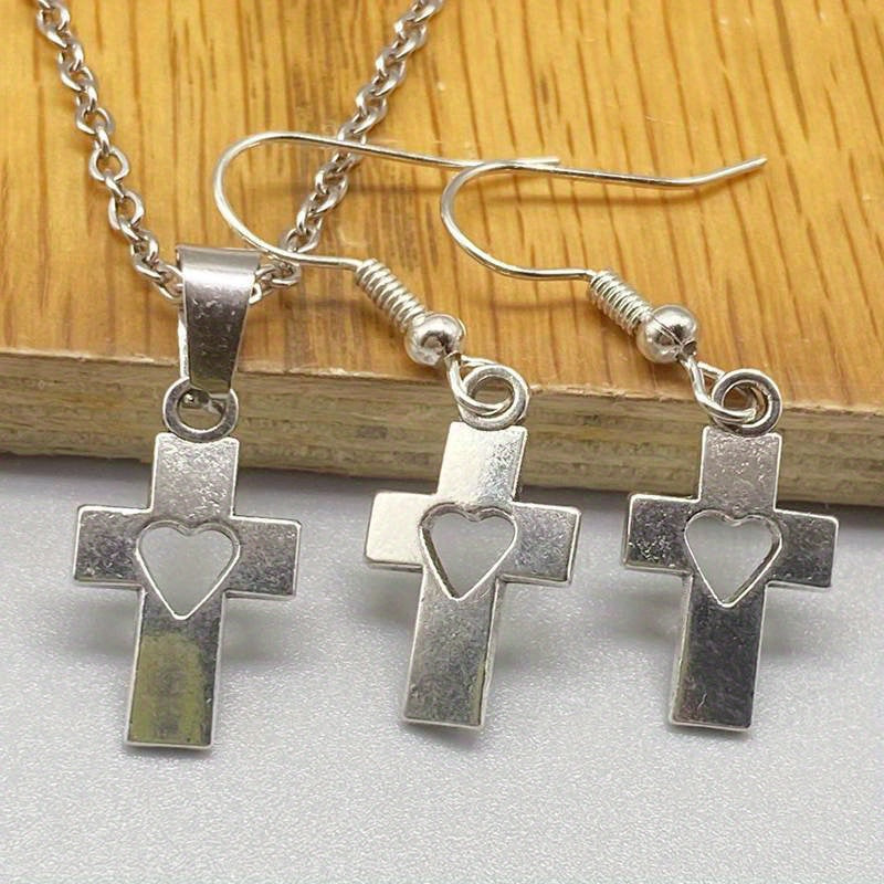 Add a touch of vintage charm to your look with this heart cross jewelry set. Includes earrings and pendant necklace.