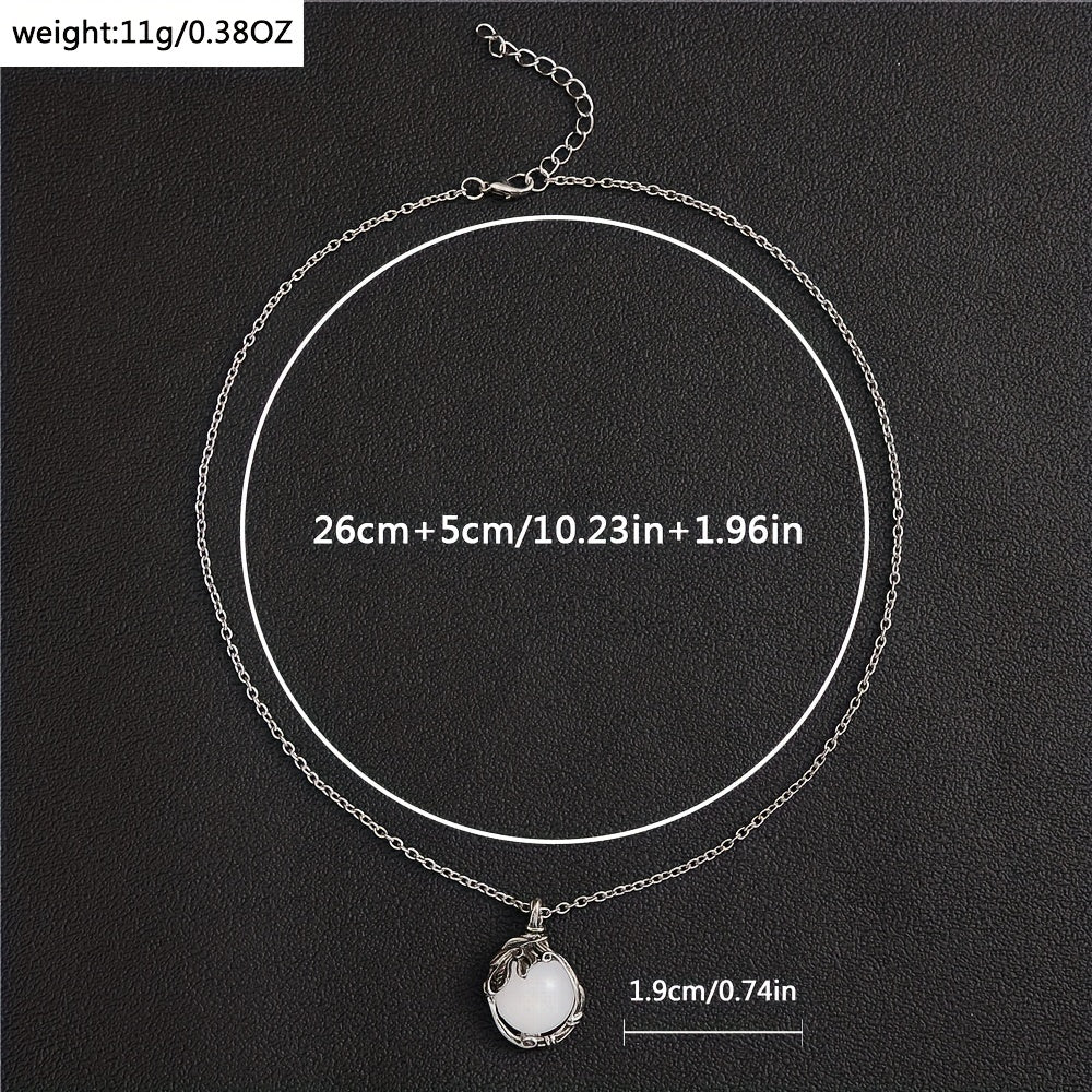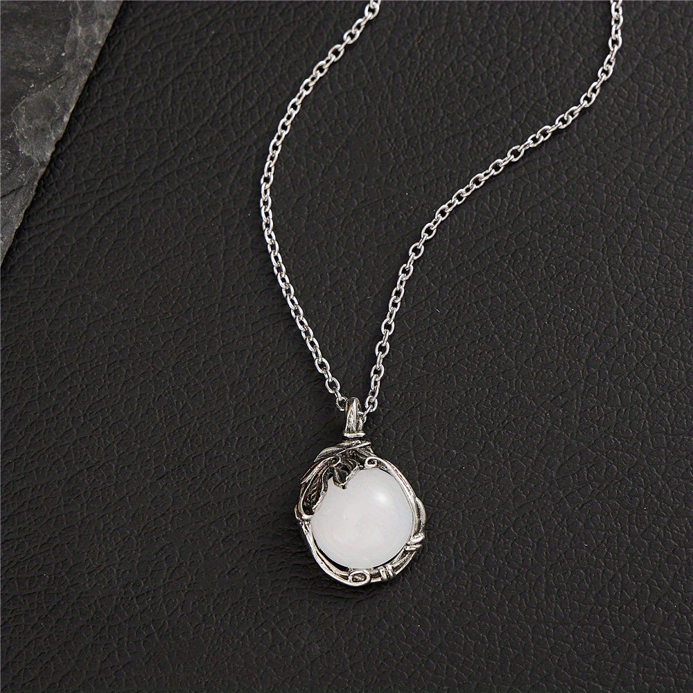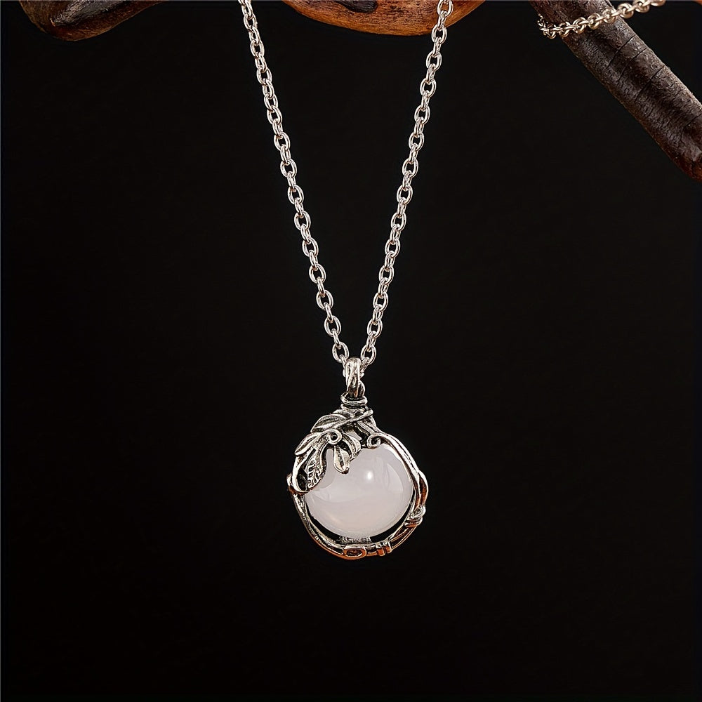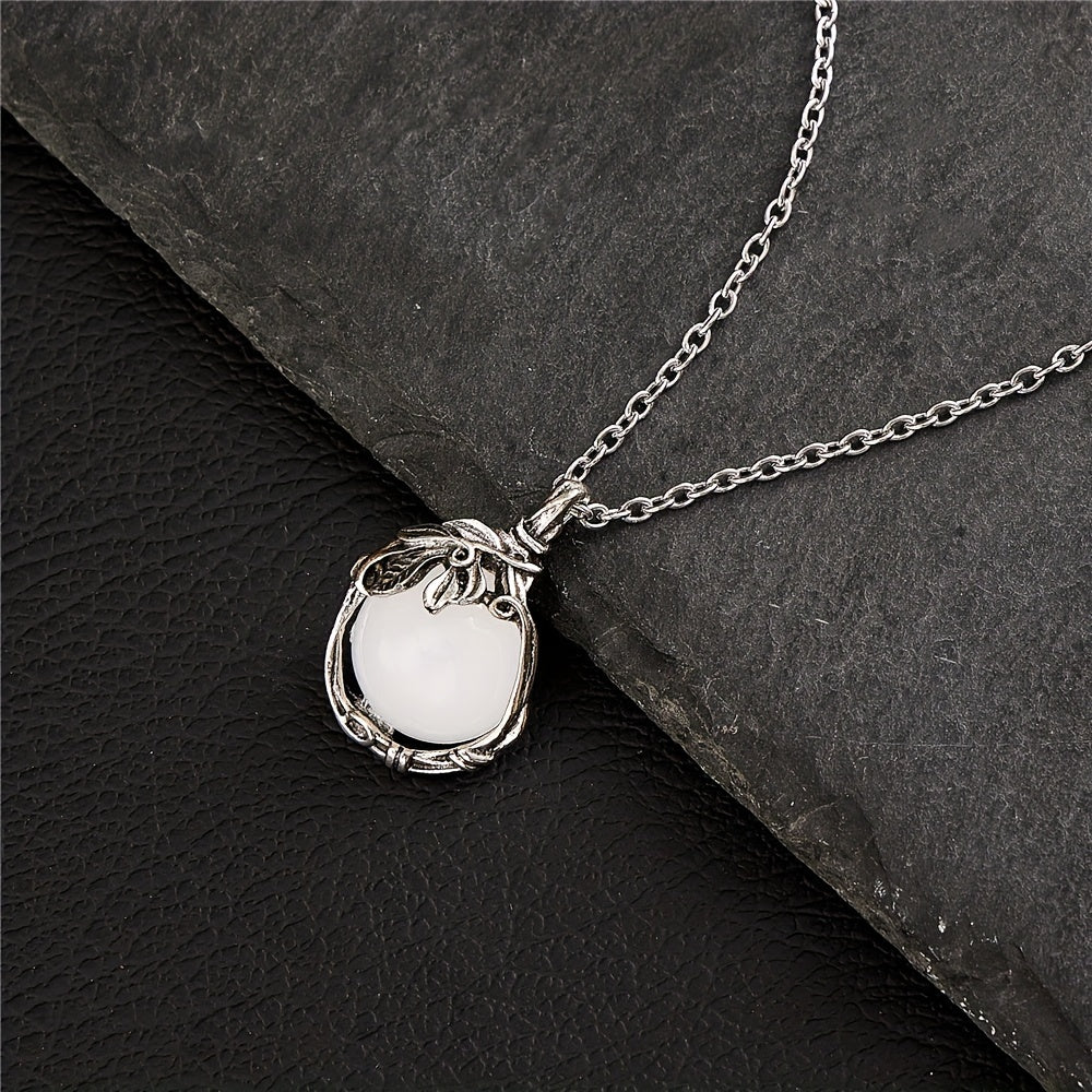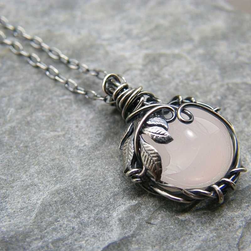 This elegant pendant necklace features a silvery vintage leaf pattern inlaid with a beautiful moonstone. It is a perfect accessory for parties and makes a great gift for someone special.