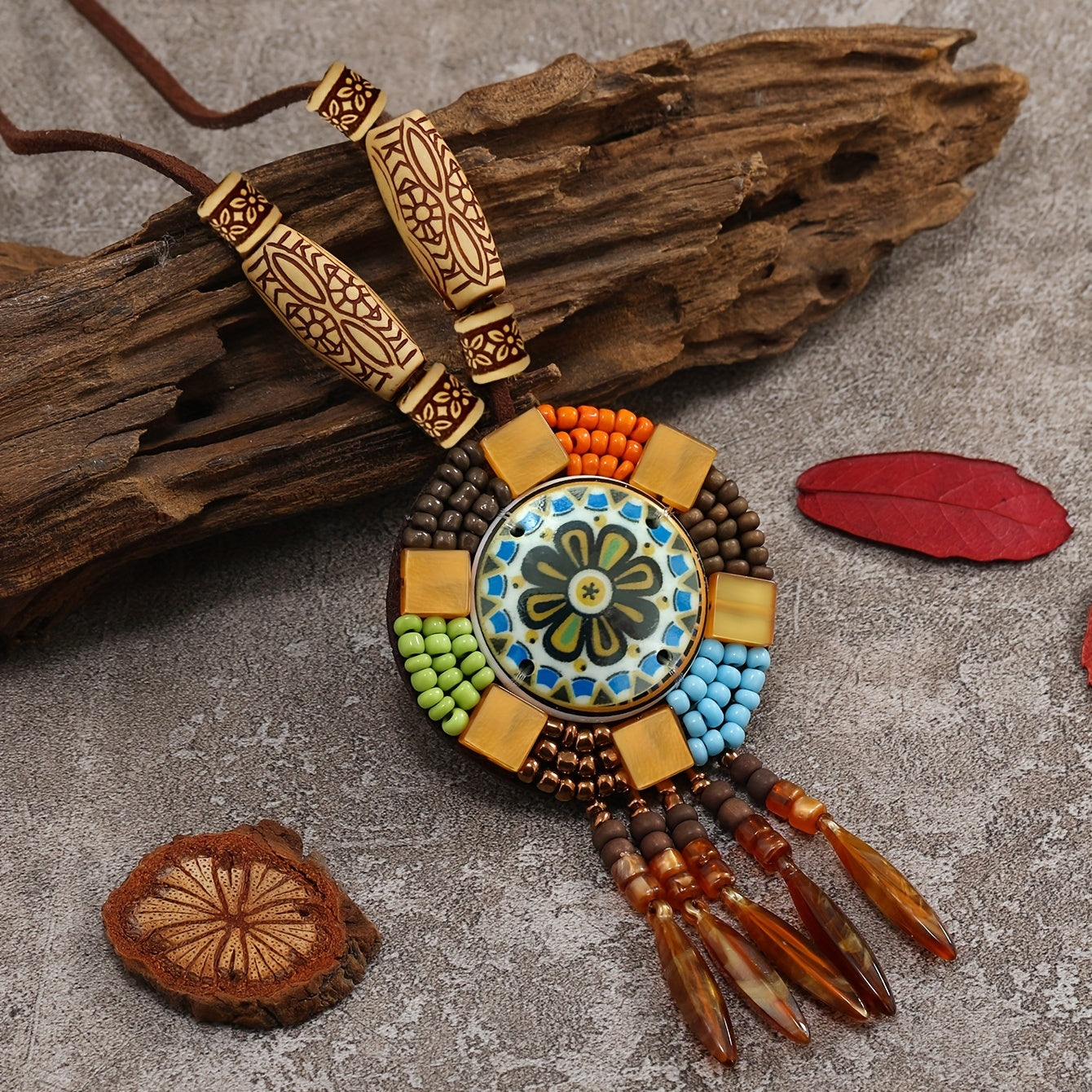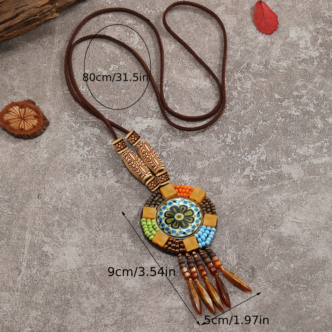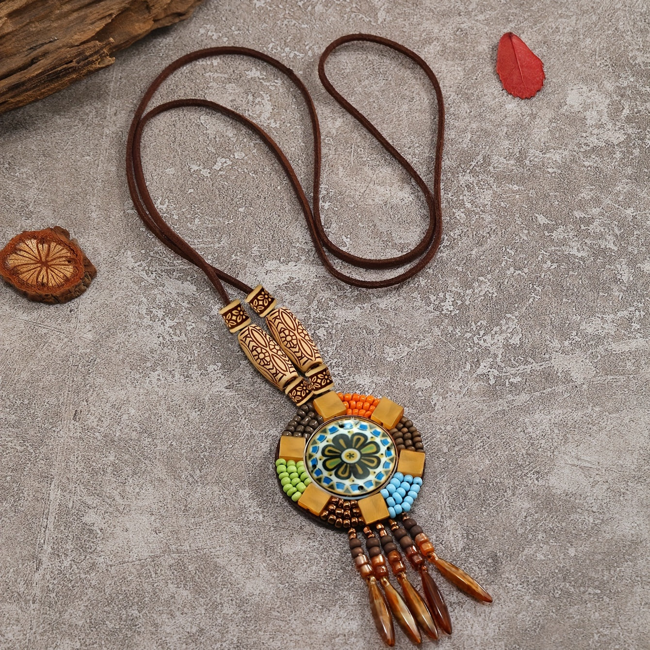 Add a touch of bohemian style to your outfit with this vintage long sweater chain resin necklace. Hand-braided for a unique look, this jewelry piece is perfect for adding a pop of color to any ensemble.