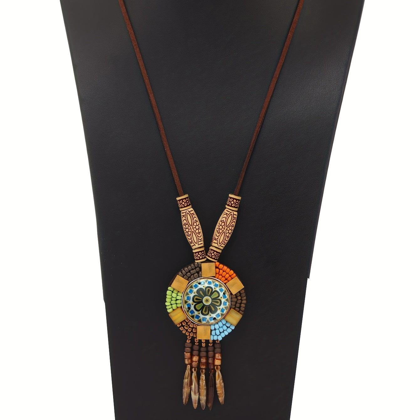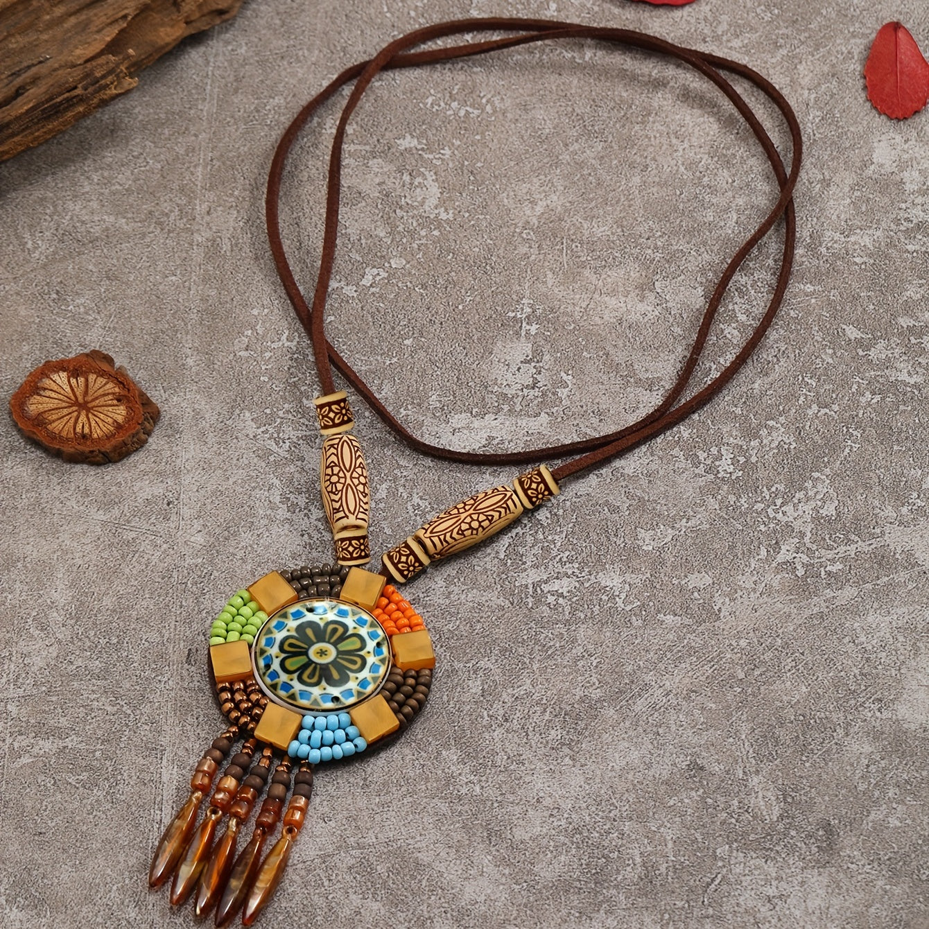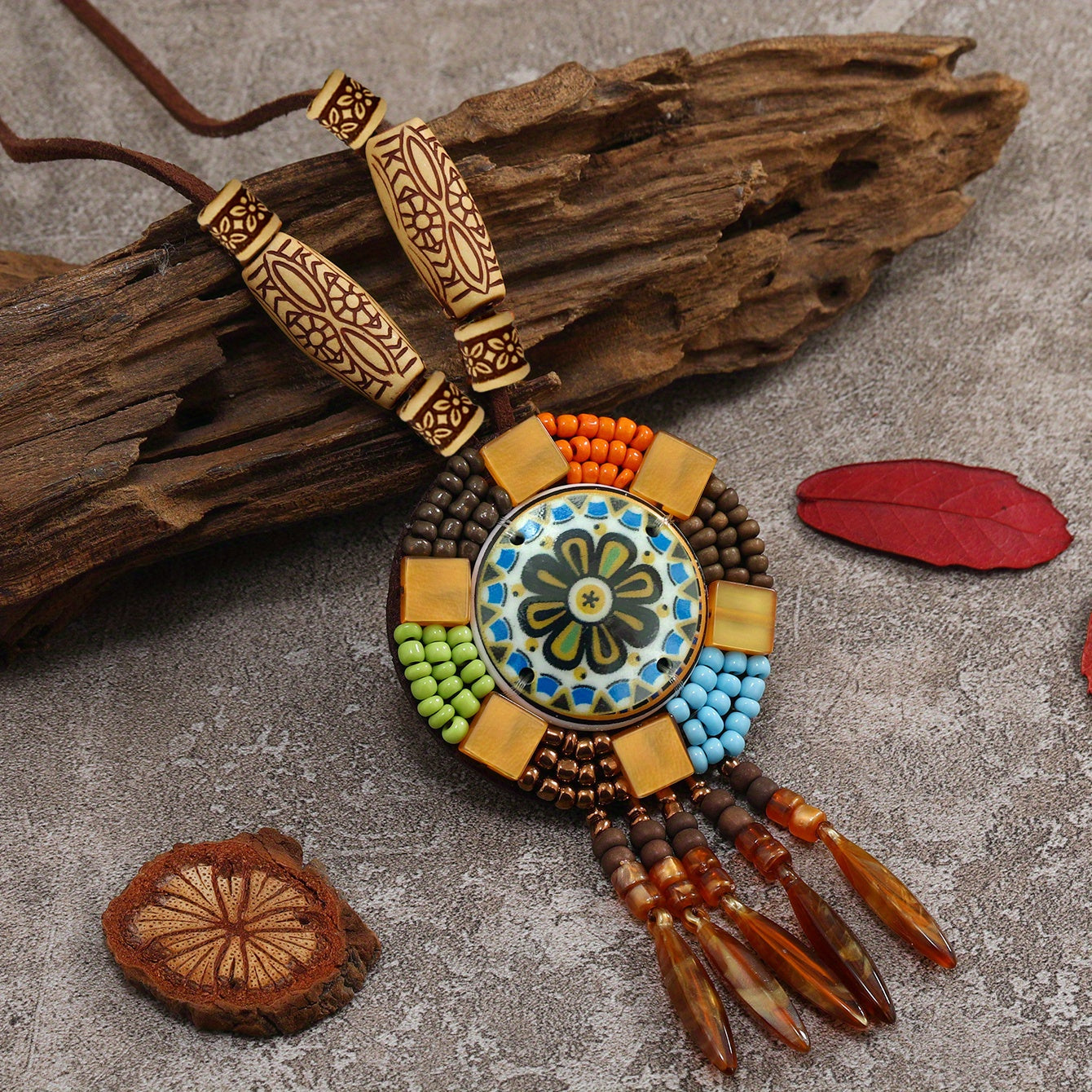 Add a touch of bohemian style to your outfit with this vintage long sweater chain resin necklace. Hand-braided for a unique look, this jewelry piece is perfect for adding a pop of color to any ensemble.