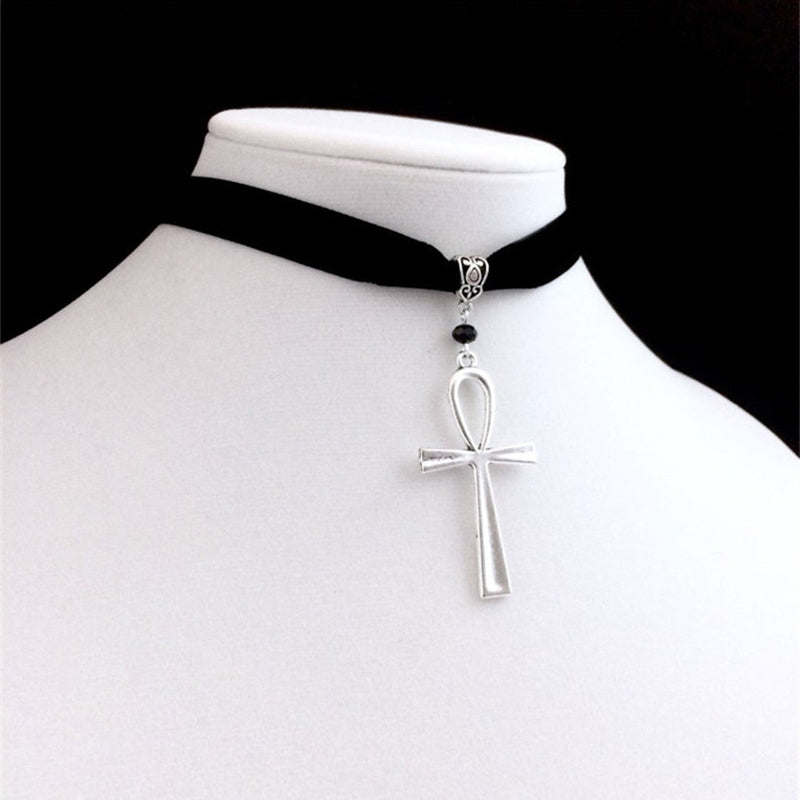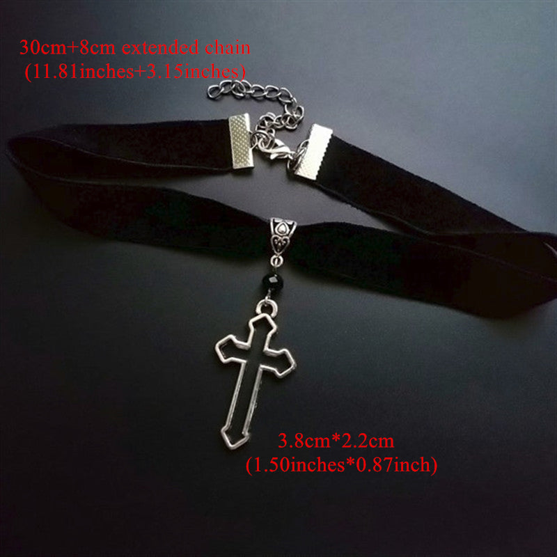 Vintage Silver Hollow Cross Pendant Choker Necklace Velvet Gothic Style