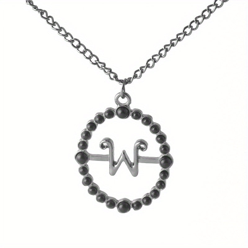 Set includes a stainless steel necklace with the letter W pendant and Addams Family themed earrings.