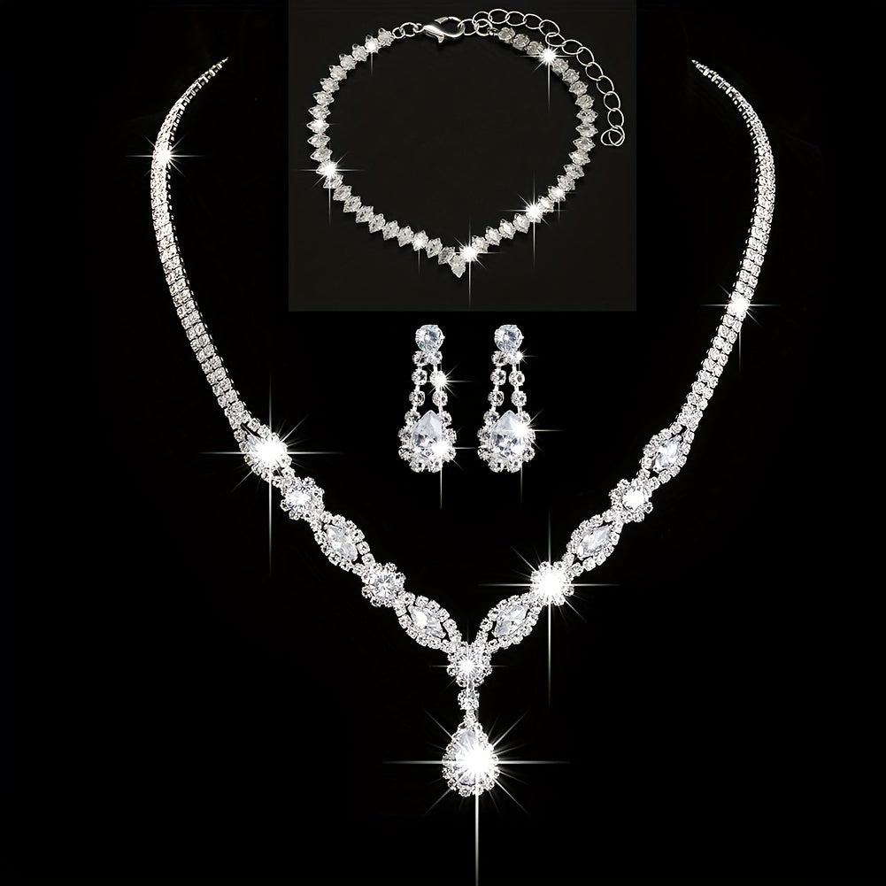 Complete your wedding look with this elegant jewelry set featuring a pendant necklace, dangle earrings, and a matching chain bracelet.
