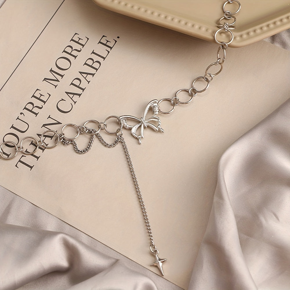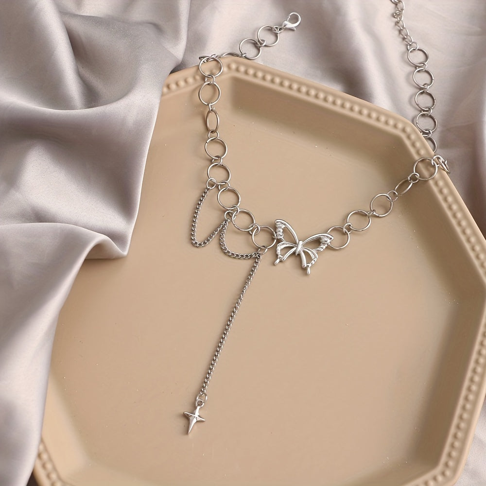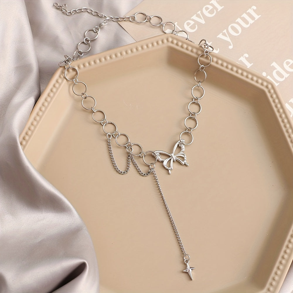 This Y2K Punk Hollow Butterfly Pendant Necklace features a stylish O-shaped ring chain design, perfect for adding a trendy touch to your look.