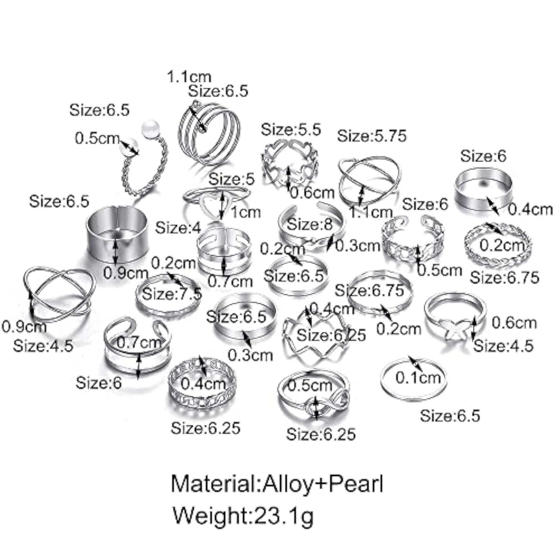 Enhance your style with this set of 22 stylish silver plated rings. Perfect for everyday wear or special occasions.