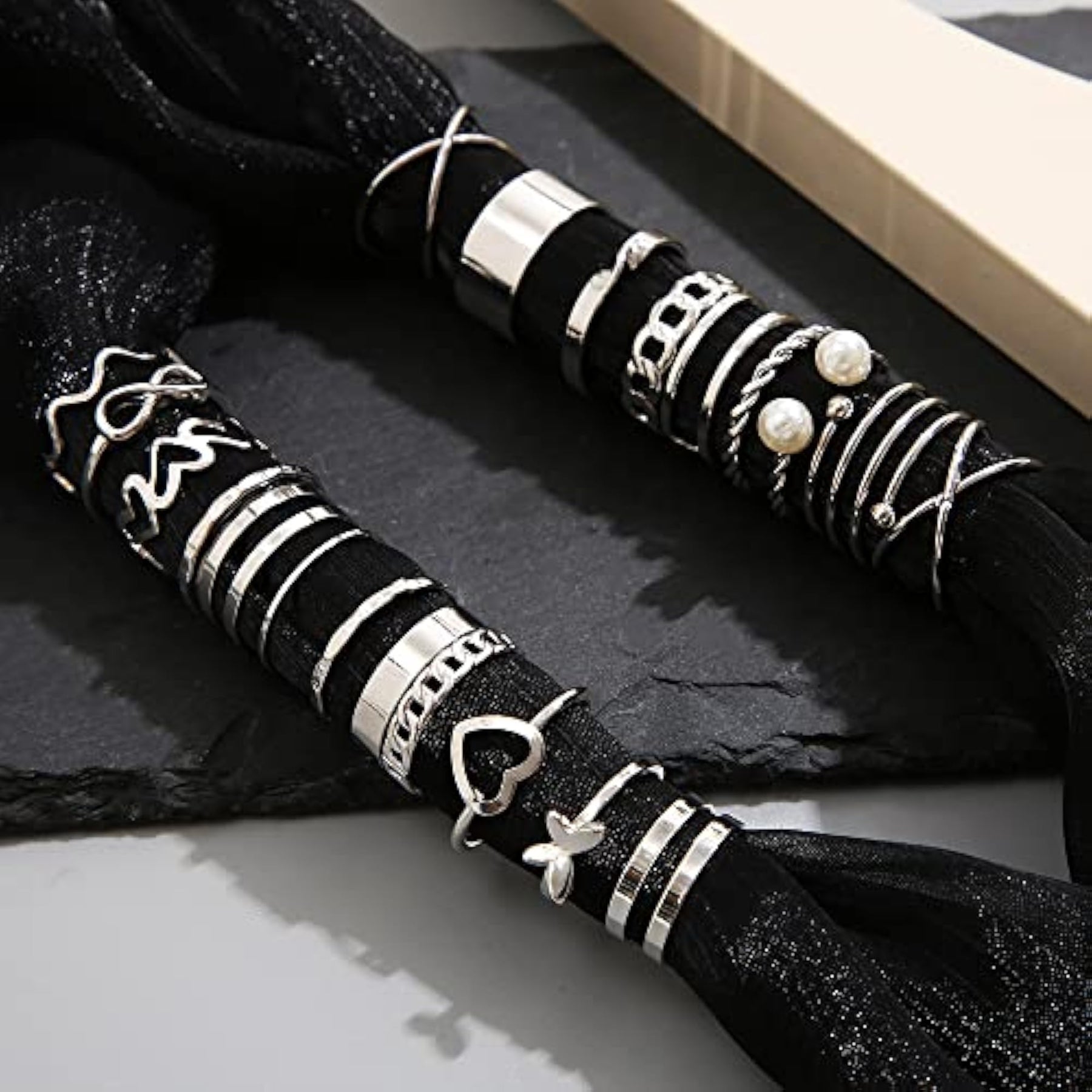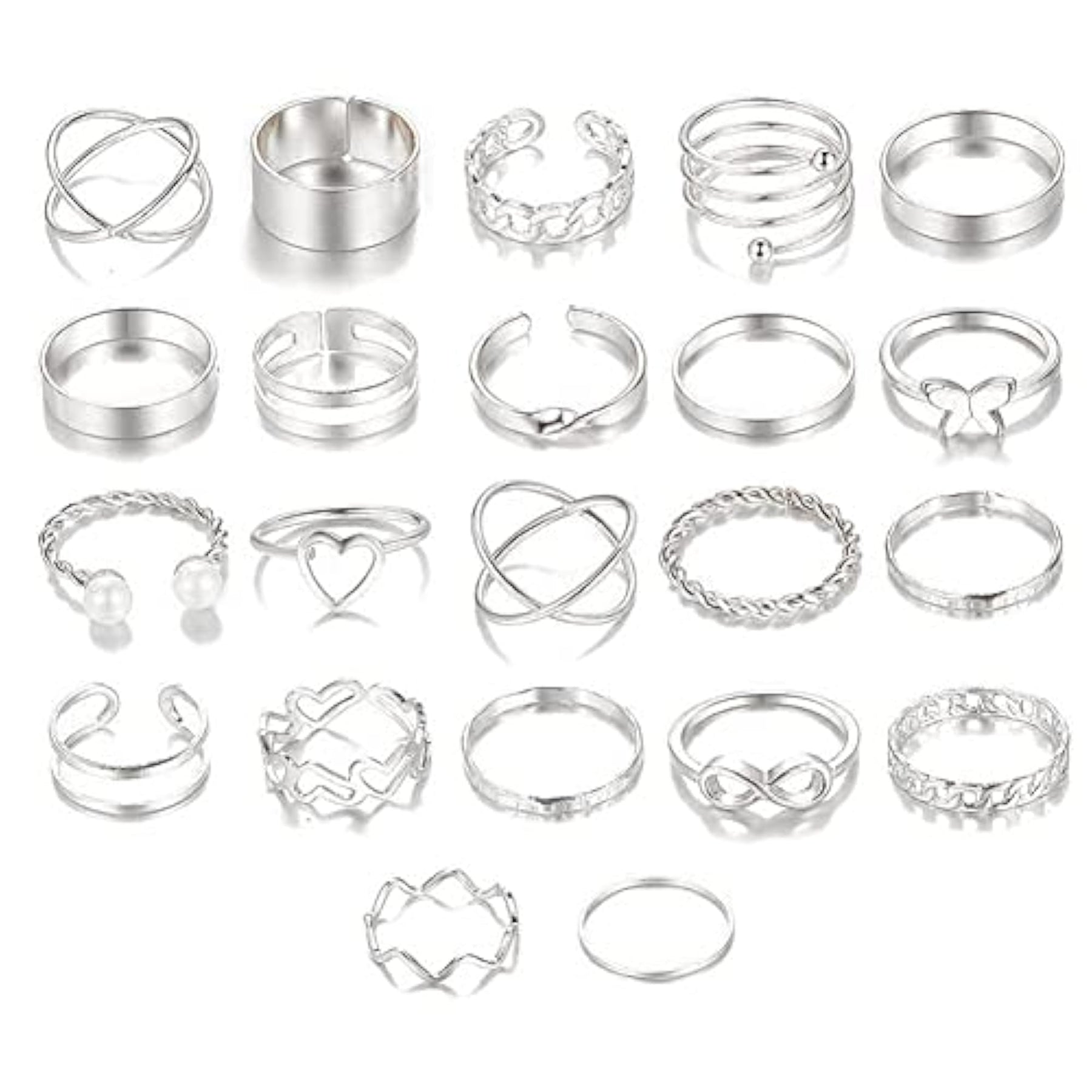 Enhance your style with this set of 22 stylish rings. Perfect for both men and women, these rings are made of high-quality materials and feature a sleek silver finish.