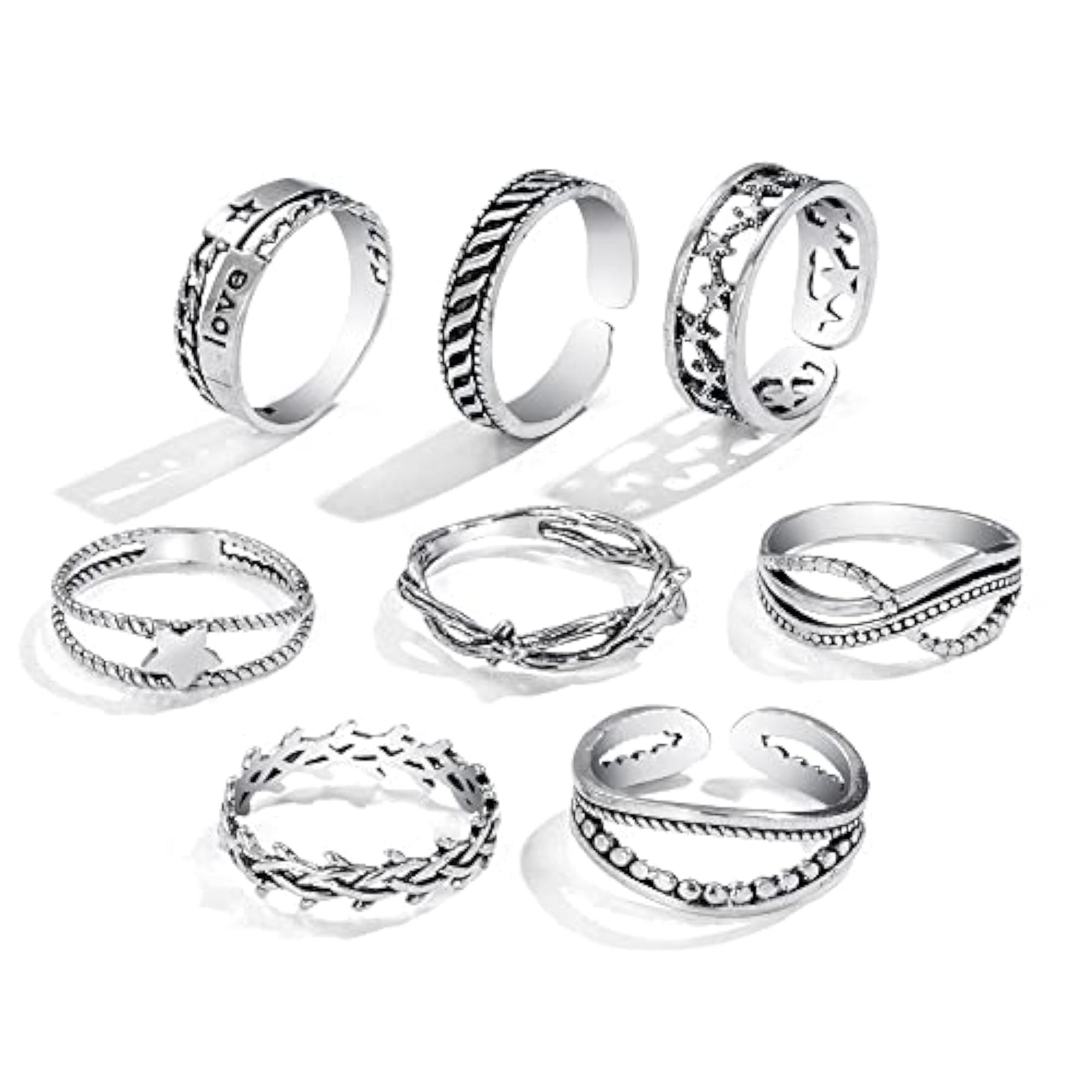 Enhance your boho chic look with these elegant metal midi rings. This set of 8 rings is perfect for adding a touch of style to your fingers. The rings are versatile and can be stacked or worn individually for a trendy look.