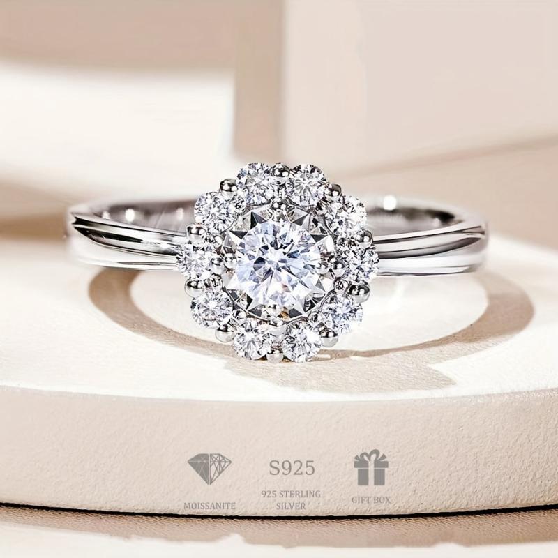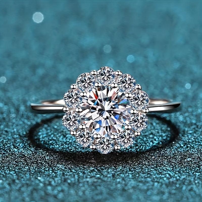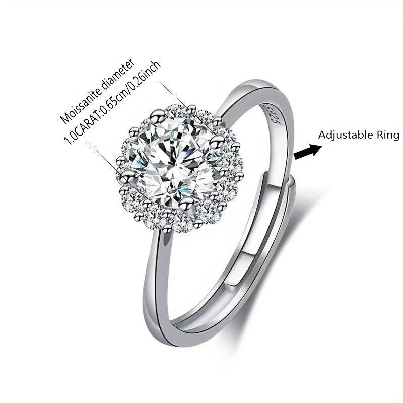 This stunning 925 sterling silver ring features a real moissanite sun flower design, perfect for adding a touch of bohemian style to any outfit. It is a great accessory for weddings and makes a lovely gift for females.