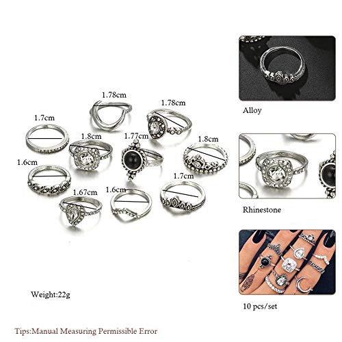 This set of 10 boho midi rings features an oxidized finish with crystal detailing. Perfect for adding a touch of bohemian style to your look.