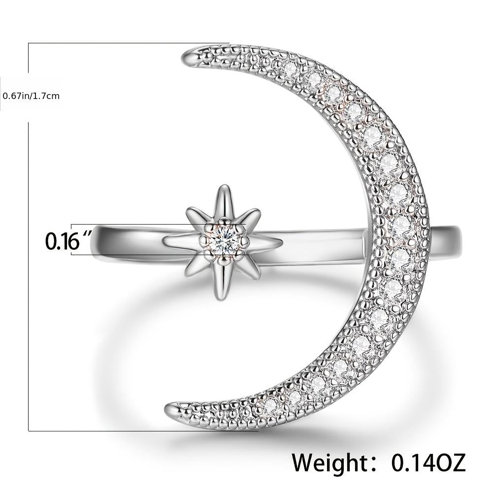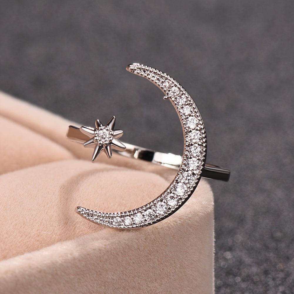 This 18K plated ring features a cresent moon design with Zircon inlay, perfect for girls. It's a stylish accessory that adds a touch of elegance to any outfit.
