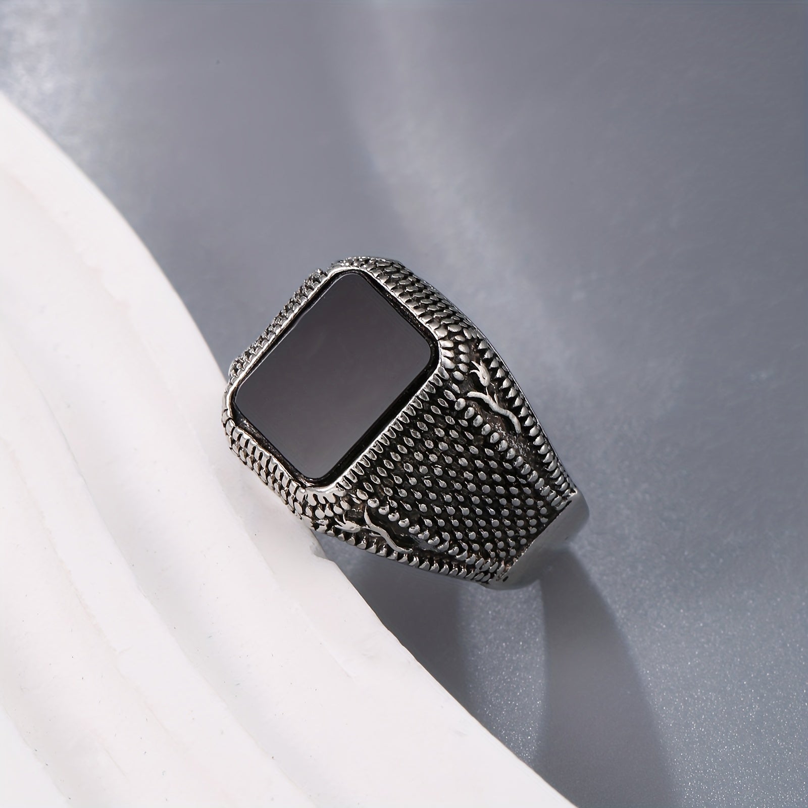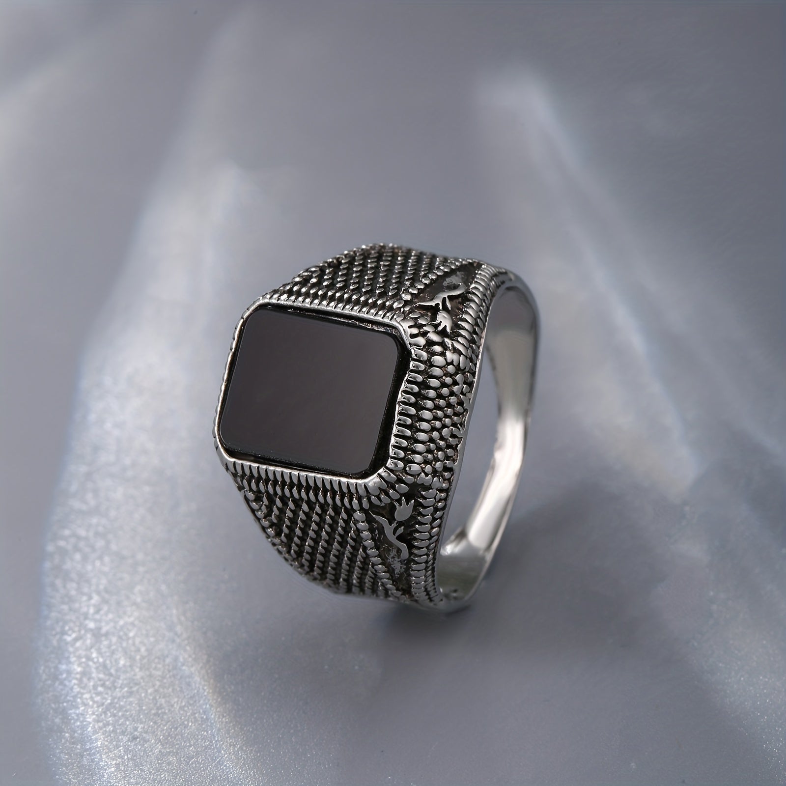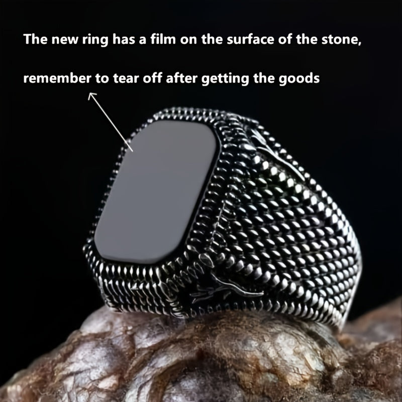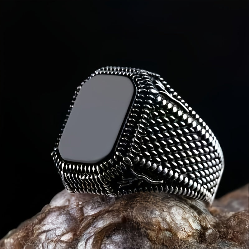 This men's ring features a glamorous gemstone set in an antique silver band for a sophisticated look.