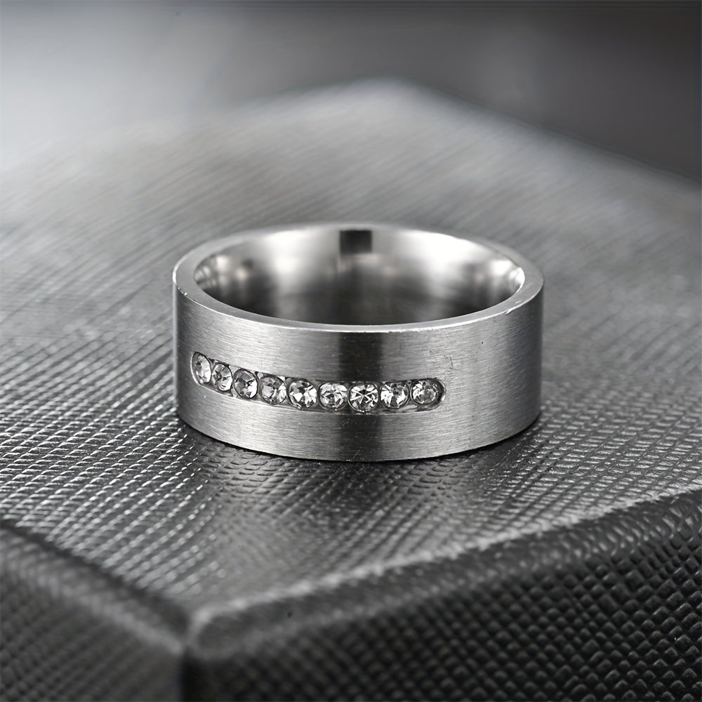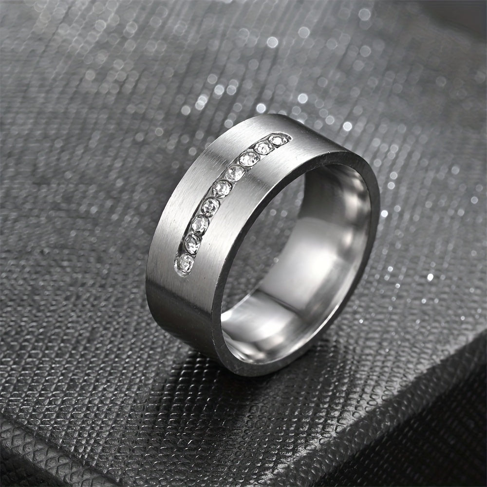 This stylish men's ring features a stainless steel band with artificial diamond accents. Perfect for weddings, holidays, or special occasions.